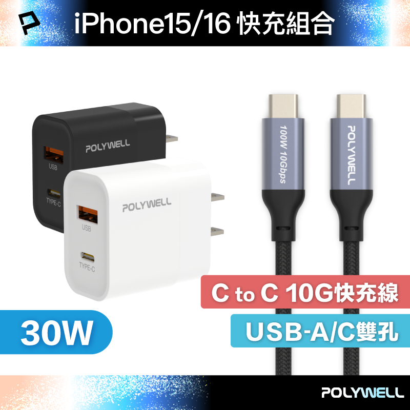 POLYWELL iPhone16快充組 30W USB/C雙孔快充頭+ C/C 10G編織快充線 寶利威爾 台灣現貨30W A+C 雙孔快充頭 (白色),C To C 10G快充傳輸線, 2米|30W A+C 雙孔快充頭 (黑色),C To C 10G快充傳輸線, 1米|30W A+C 雙孔快充頭 (黑色),C To C 10G快充傳輸線, 2米|30W A+C 雙孔快充頭 (白色),C To C 10G快充傳輸線, 1米Cables, Chargers & ConvertersPOLYWELL寶利威爾官方旗艦店