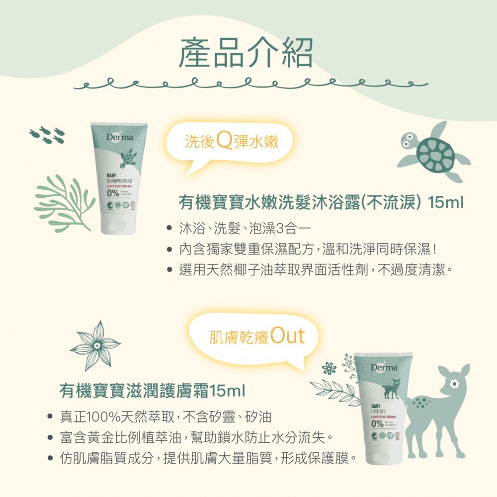 丹麥 Derma 寶寶系列 – 有機寶寶洗護隨身套組15ml (沐浴露+護膚霜) 效期2026/05丹麥 Derma 寶寶系列 – 有機寶寶洗護隨身套組15ml (沐浴露+護膚霜) 效期2026/05Hair Care & Body WashnanaBABY寶寶生活精品