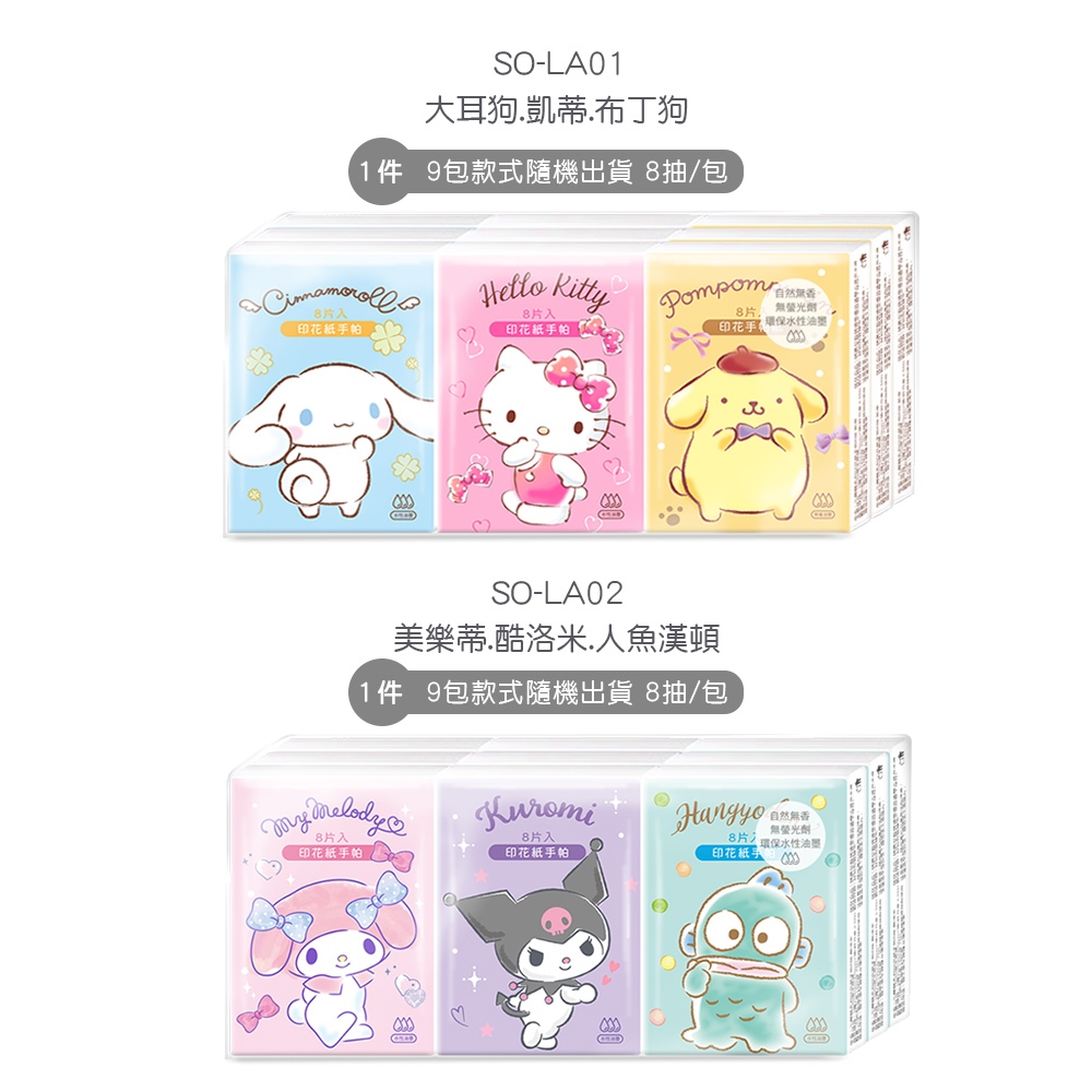 三麗鷗紙手帕(8抽9包) 紙手帕 衛生紙 袖珍包 酷洛米KITTY 大耳狗 人魚漢頓 攜帶紙巾 輕巧面紙【旺達棉品】美樂蒂.酷洛米.人魚漢頓-02|大耳狗.凱蒂.布丁狗-01Othersoneder旺達棉品品牌旗艦店