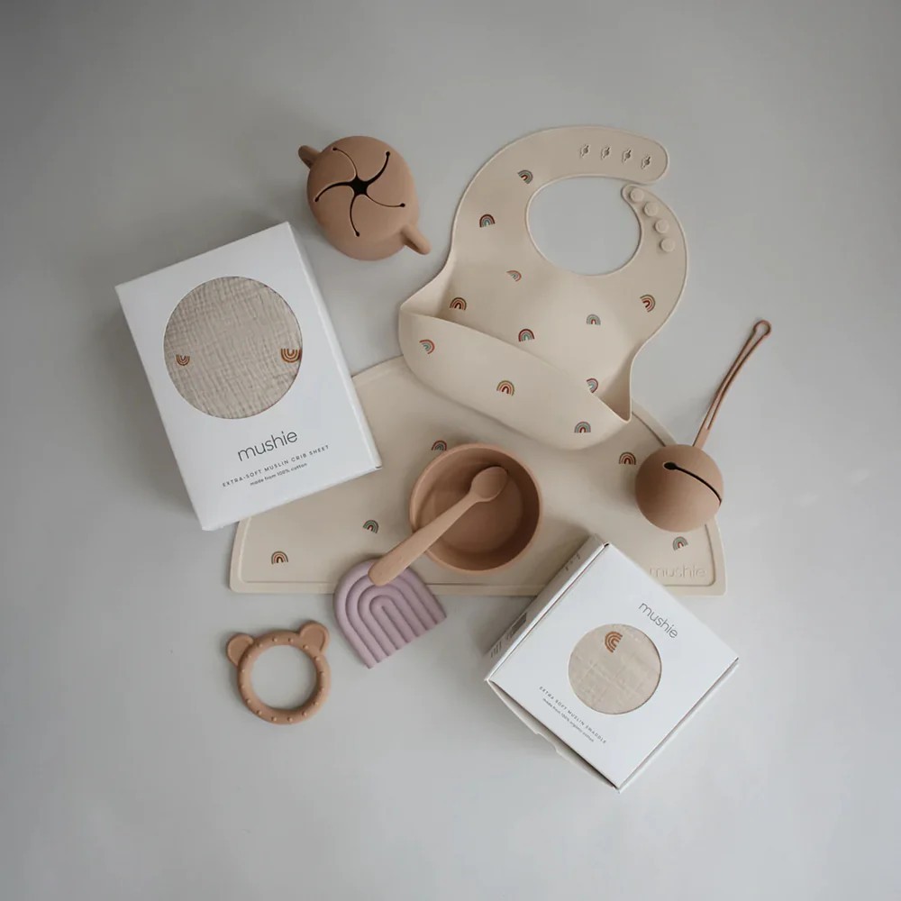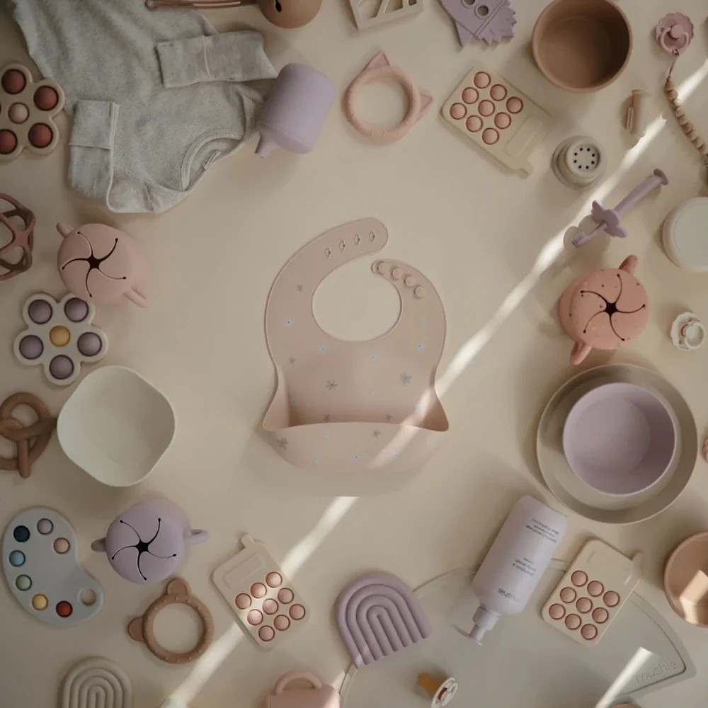 Mushie 矽膠圍兜 – 多款可選粉花|恐龍|雛菊藍|雛菊粉|外太空|藍鯨|皇冠|彩虹|紫丁香|汽車|太陽橘黃BibsnanaBABY寶寶生活精品