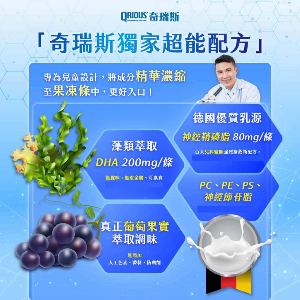 【福利品】QRIOUS奇瑞斯閃電靈光DHA葡萄能量凍(2盒)/DHA/200mg/神經鞘磷脂/80mg/藻類萃取【福利品】QRIOUS奇瑞斯閃電靈光DHA葡萄能量凍(2盒)/DHA/200mg/神經鞘磷脂/80mg/藻類萃取Baby Vitamins & SupplementsQRIOUS奇瑞斯官方商城
