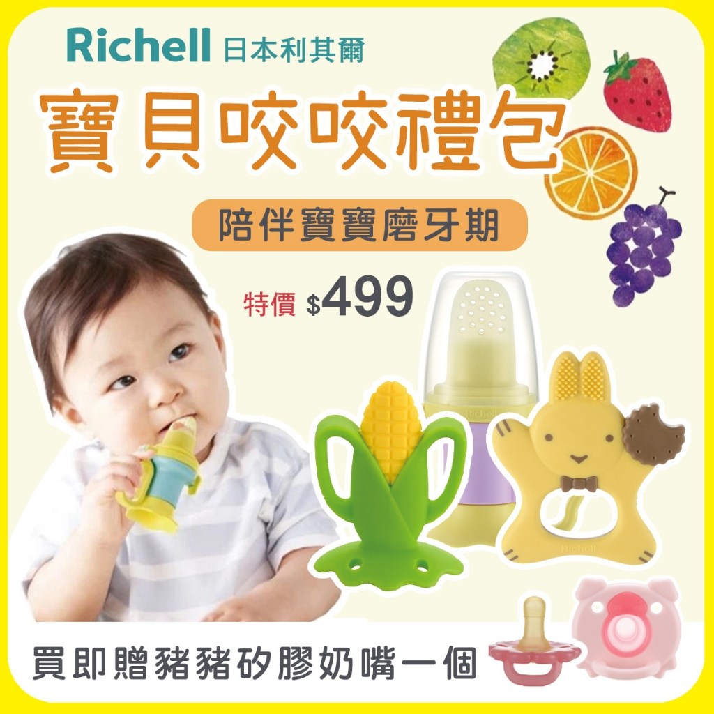 Richell 利其爾|寶寶咬咬大禮包(樂咬棒+固齒器+牙刷)贈豬豬矽膠安撫奶嘴樂咬棒藍色+玉米固+3M乳牙刷贈豬豬奶嘴|樂咬棒紫色+玉米固+3M乳牙刷贈豬豬奶嘴Baby & Toddler ToysRichell台灣官方旗艦館