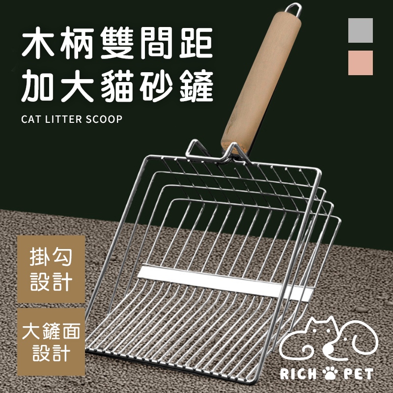 【RICH PET】木柄掛勾雙間距加大貓砂鏟 貓沙鏟 貓屎鏟 礦砂鏟 鏟子 大小貓砂團一次搞定 HM008銀+木把手|玫瑰金+木把手Poop Bags & ScoopersRICH PET 嚴選精緻寵物用品
