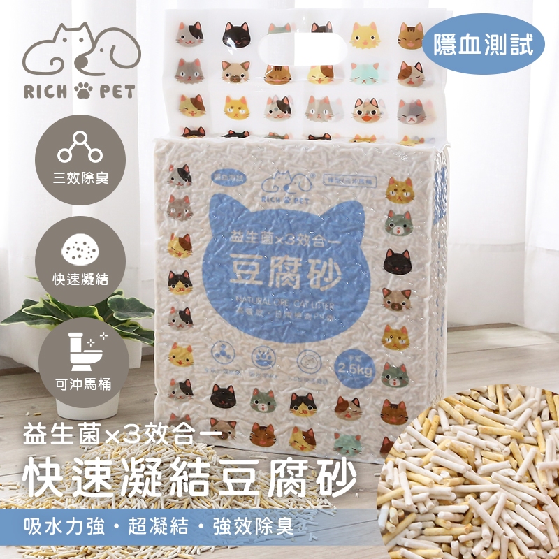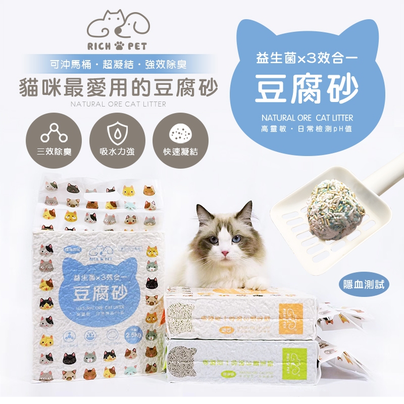 【RICH PET】益生菌3效合一豆腐貓砂-PH值隱血測試 長效除臭快速凝結可沖馬桶貓砂 豆腐砂 零甲醛 HM001BL7-11 / 全家 限1包|蝦皮店到店 可1~2包|黑貓、宅配通或嘉里快遞,1單最多只能8包|賣家宅配-箱購 / 大型物件 無購買限Cat Litter & BoxesRICH PET 嚴選精緻寵物用品
