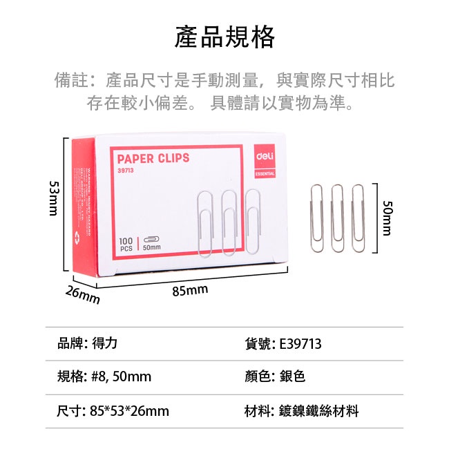 得力Deli 大迴紋針50mm-100支/盒(39713)得力Deli 大迴紋針50mm-100支/盒(39713)Clips, Pins & TacksOfficepro總務倉庫 旗艦店