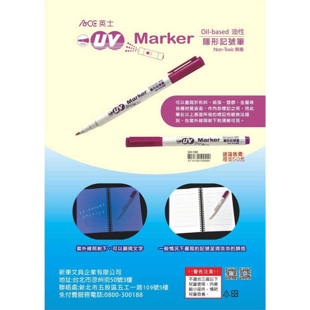 ACE 英士 UV-100 油性記號筆 隱形記號筆 標記筆幅1mm 防偽標記筆 透明無色墨水 無毒ACE 英士 UV-100 油性記號筆 隱形記號筆 標記筆幅1mm 防偽標記筆 透明無色墨水 無毒Pens & InksST9PLUS 品牌 零售 批發 團購