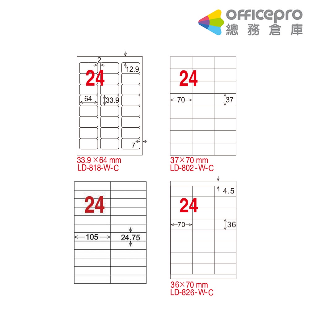 龍德三用列印電腦標籤 LD-802 LD-884 LD-818 LD-826 A4 20張|Officepro總務倉庫LD-802-W-C 24格/包|LD-884-W-C 24格/包|LD-818-W-C 24格/包|LD-826-W-C 24格/包Labels & StickersOfficepro總務倉庫 旗艦店