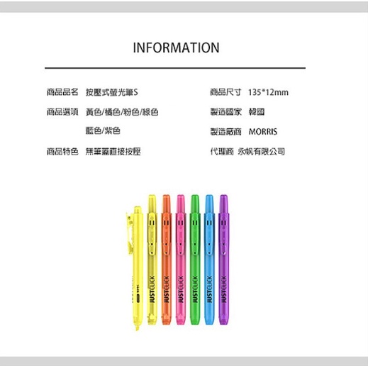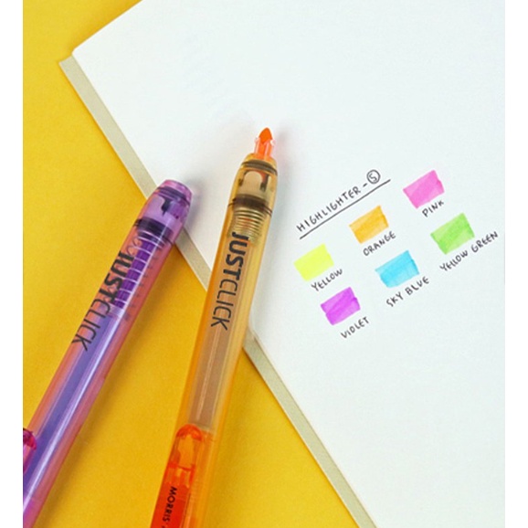 【MORRIS 官方旗艦店】 超薄型按壓式螢光筆S 6色|Just Click系列 自動色筆 彩色筆 螢光筆 韓國製黃|橘|粉|綠|藍|紫|墨水匣-黃|墨水匣-橘|墨水匣-粉|墨水匣-綠|墨水匣-藍|墨水匣-紫HighlightersMorris Taiwan 官方旗艦店