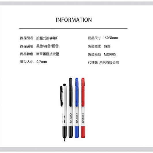 【MORRIS 官方旗艦店】超薄型按壓式簽字筆F(0.7mm_紅/黑/藍)|Just Click系列 速乾筆 韓國製紅|藍|黑|墨水匣-紅|墨水匣-藍|墨水匣-黑Pens & InksMorris Taiwan 官方旗艦店