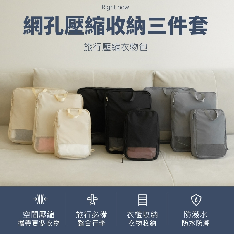 網孔壓縮收納 拉鍊壓縮袋 旅行壓縮收納袋 旅行收納袋 旅行包 行李壓縮袋 鏤空網紗 壓縮收納袋 衣服收納袋 露營收納袋三件套/黑|三件套/灰|三件套/米Travel OrganizersRunway Collection