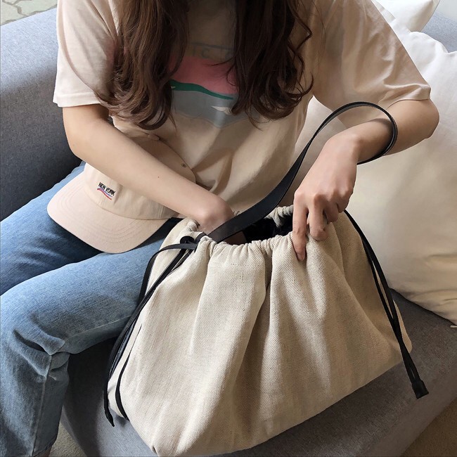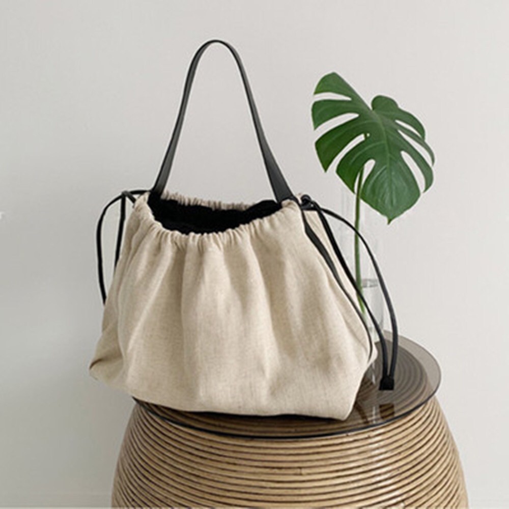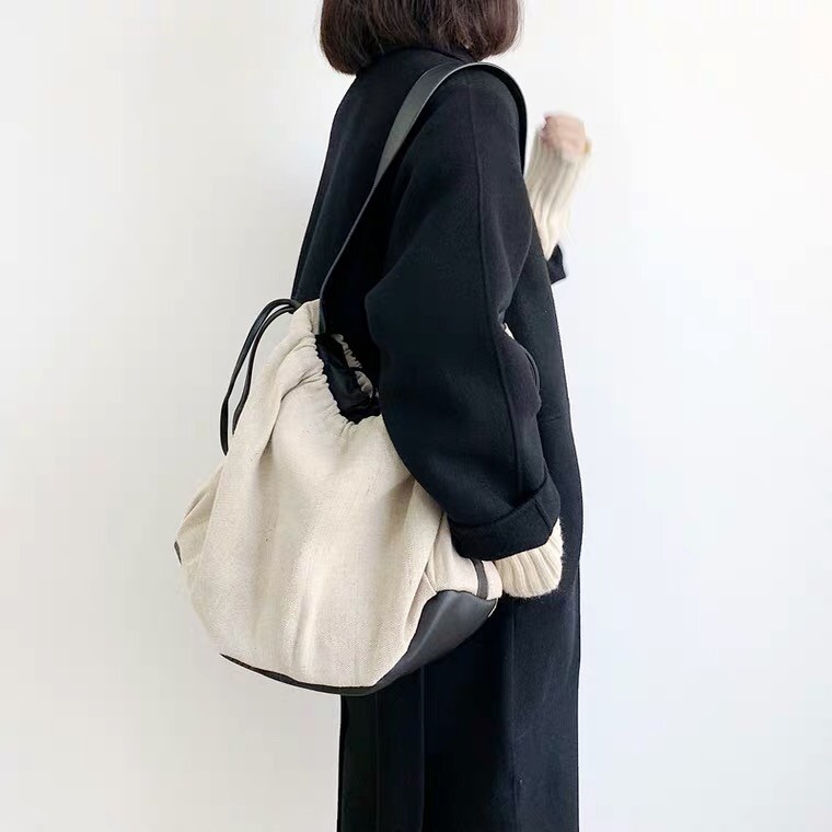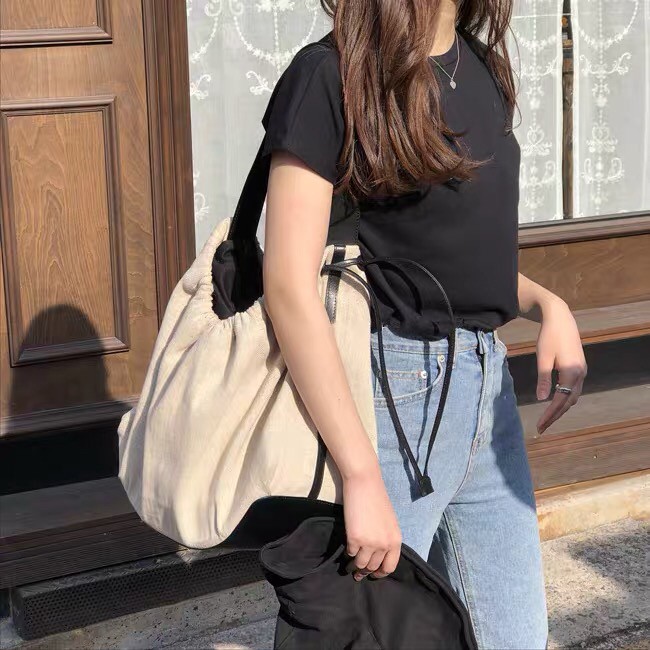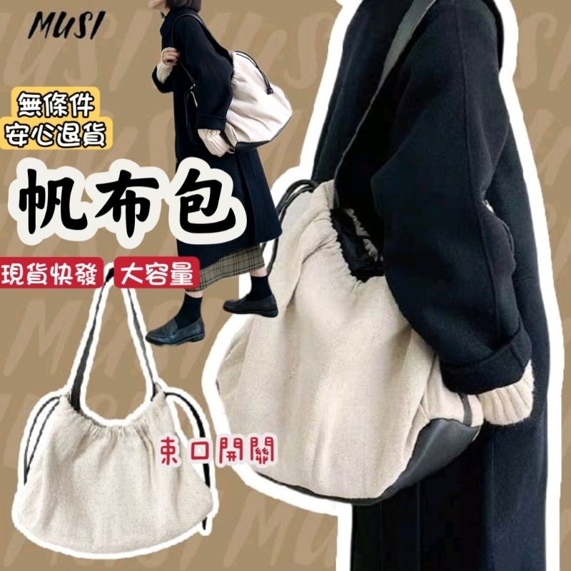 [MUSI創意玩星球-台灣快發]帆布大包 托特包 白色包包 大容量女包 隨性女包 文青大女包 旅行包 水餃包 肩背包帆布束口單肩背包-白 現貨MUSI 口罩&包包帽子 專賣