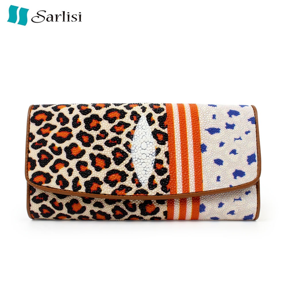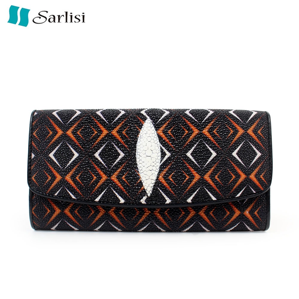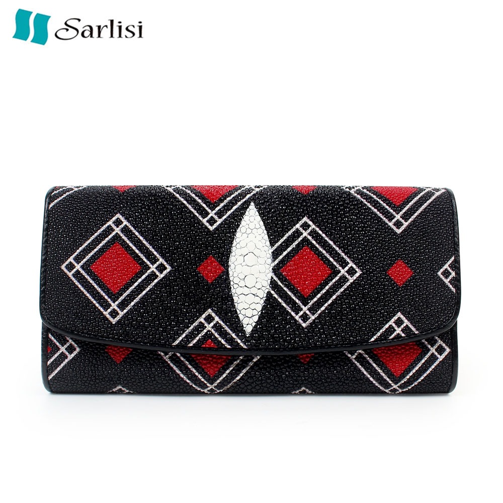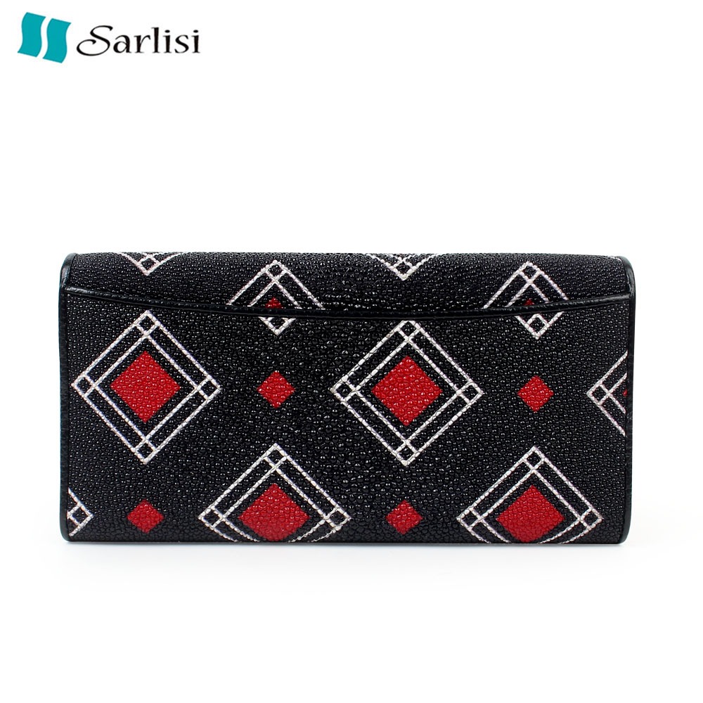 【臺灣現貨】Sarlisi 泰國正品真皮無拼接珍珠魚皮長款錢包女士新款長夾手拿包大容量三折錢包白色|黑色(紅色菱型)|黑色(黃色菱型)Long WalletsSarlisi 夏麗絲|泰國珍稀皮革皮具商