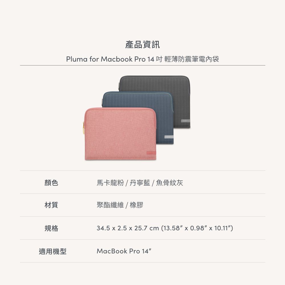 Moshi Pluma 14吋 Laptop Sleeve 輕薄防震筆電內袋丹寧藍|魚骨紋灰|玫瑰粉Laptop Sleevesmoshi 官方旗艦店