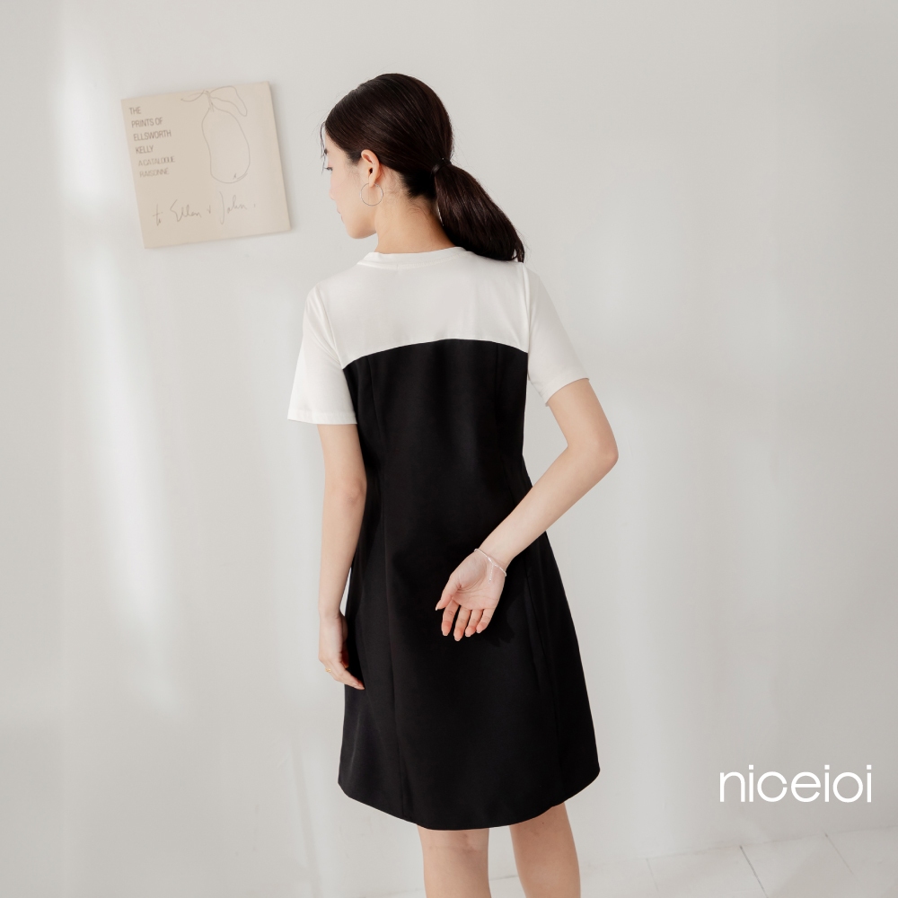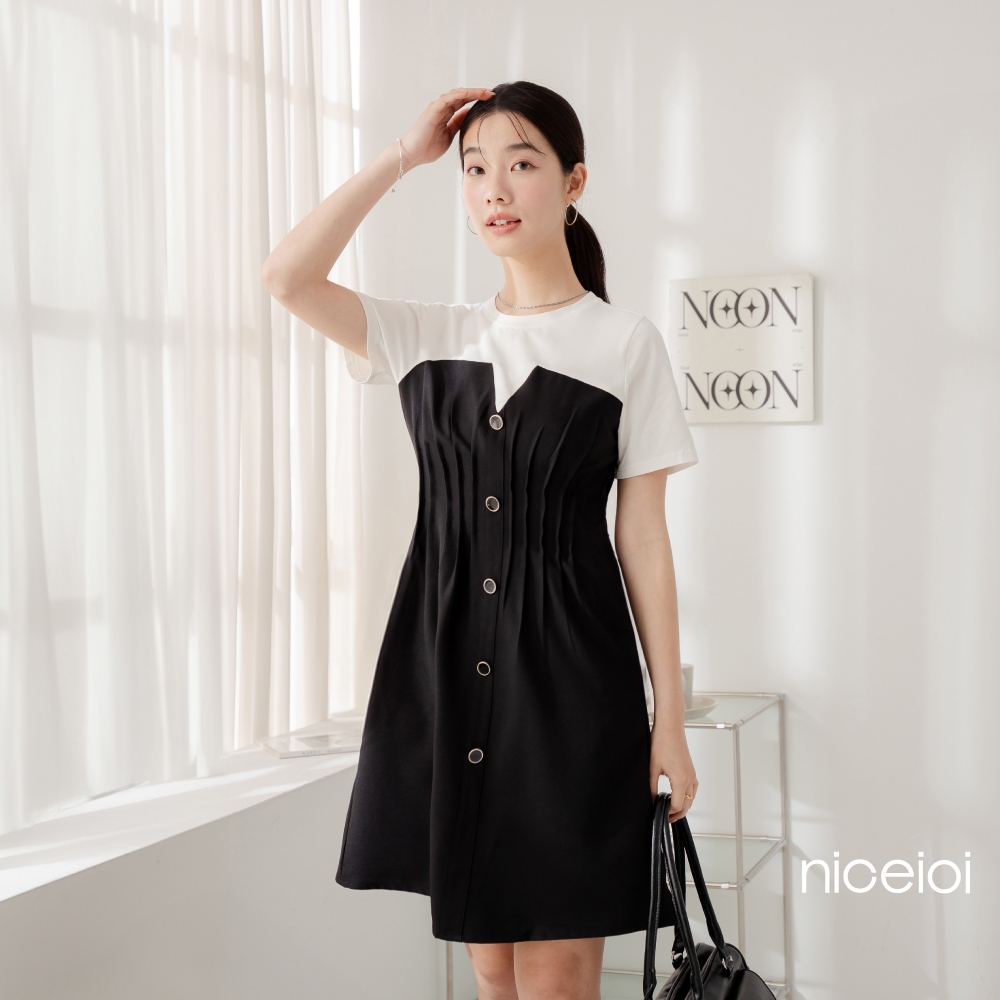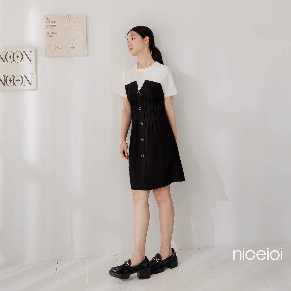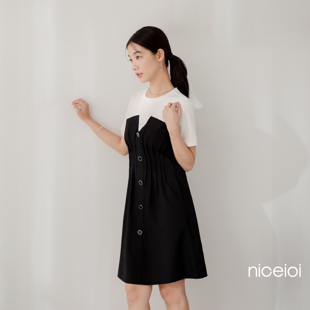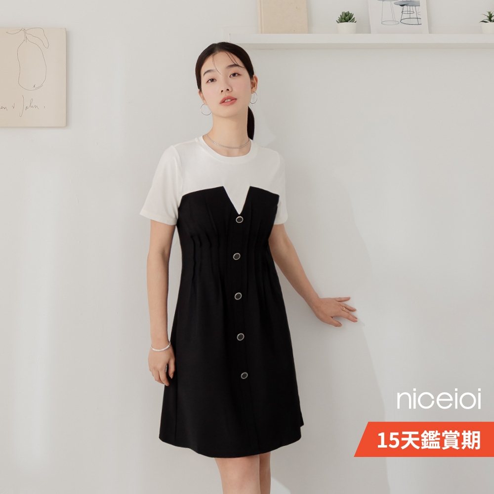 niceioi【特惠】優雅抓褶排釦拼接洋裝 女裝