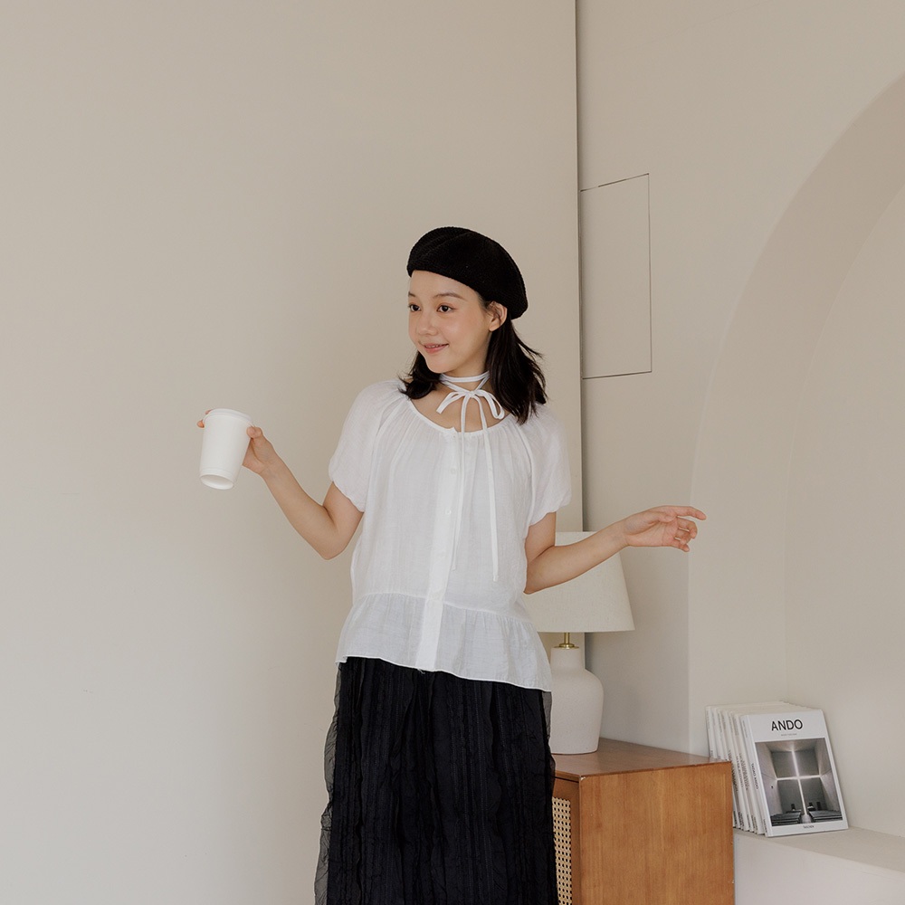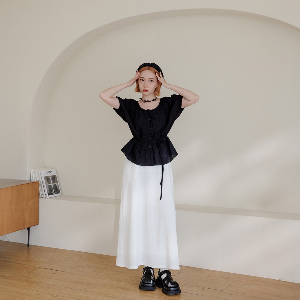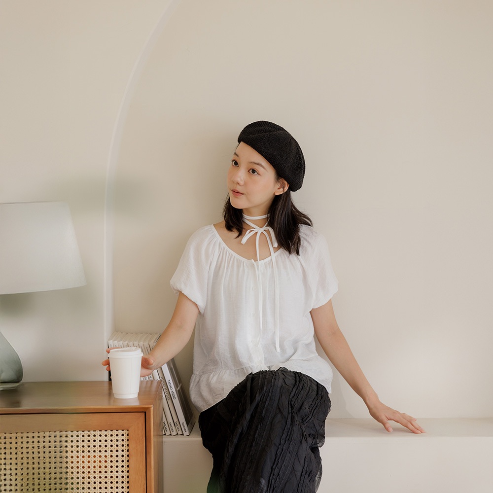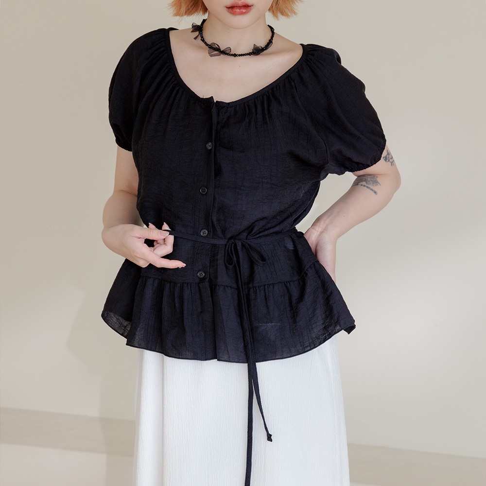 QUEENSHOP_ S 女裝 短袖 圓領腰剪接澎袖附綁帶上衣 兩色售 現+預 【01099082】黑|白OthersQUEENSHOP