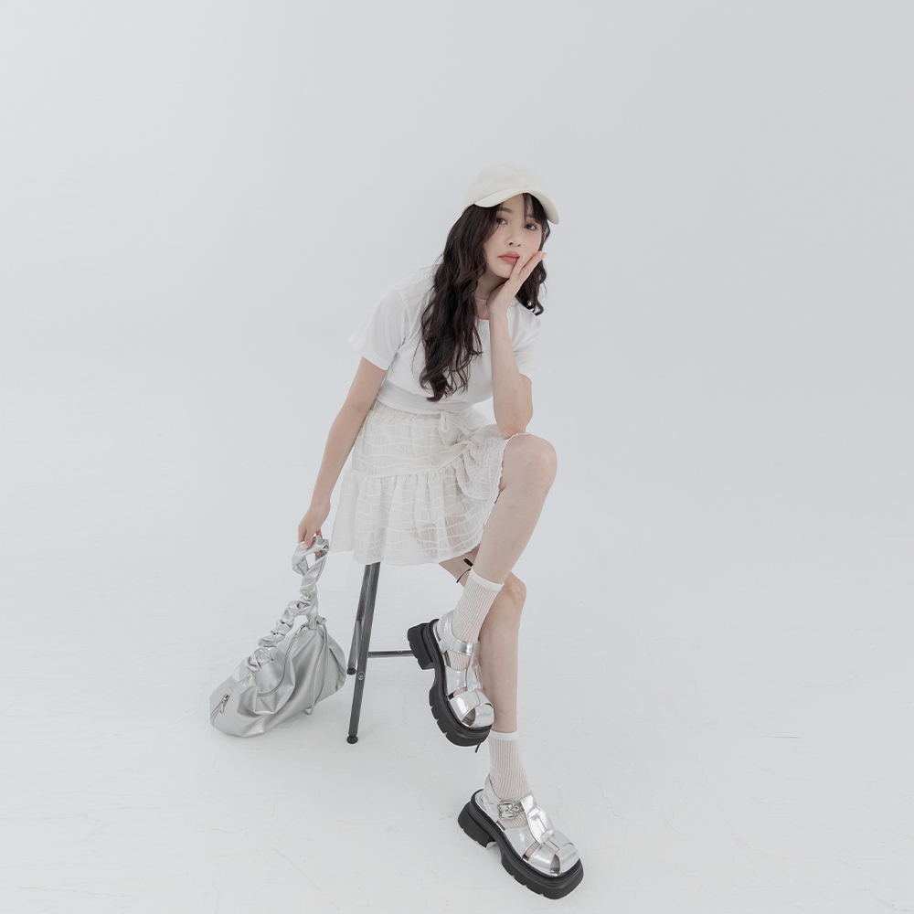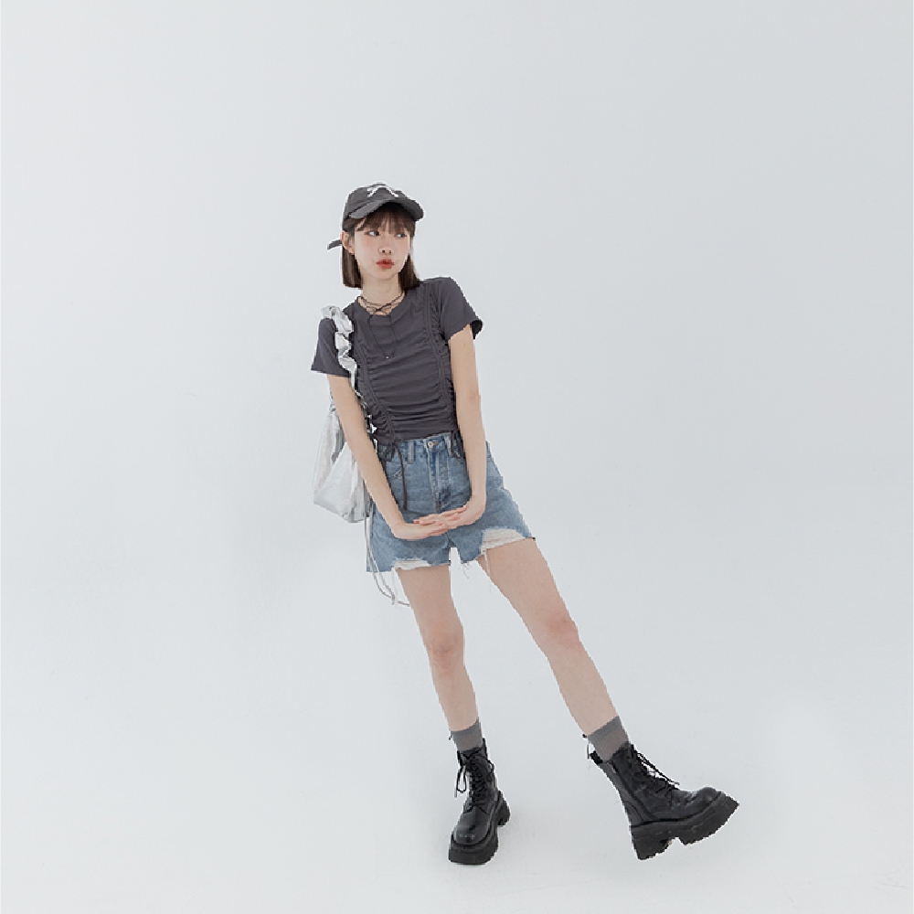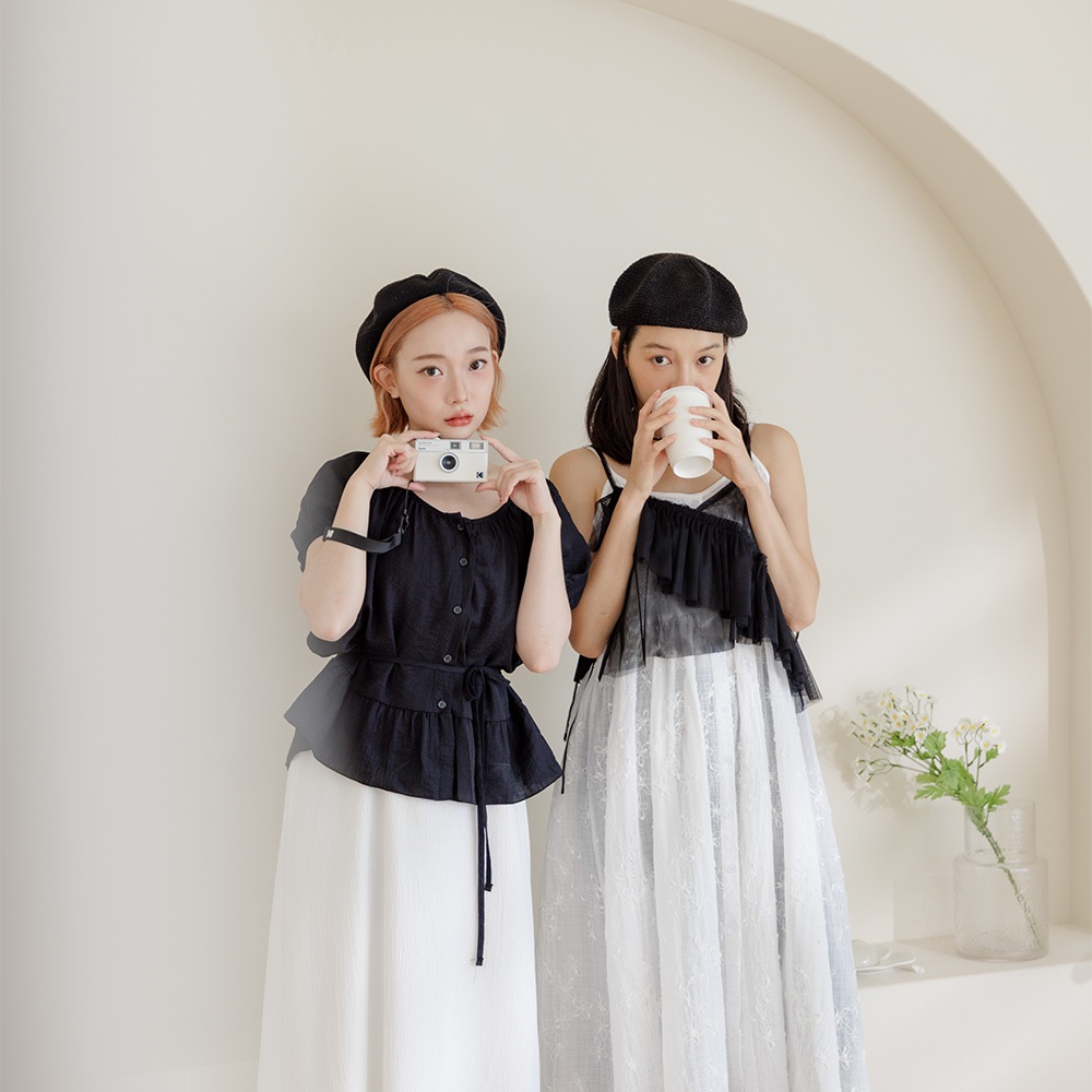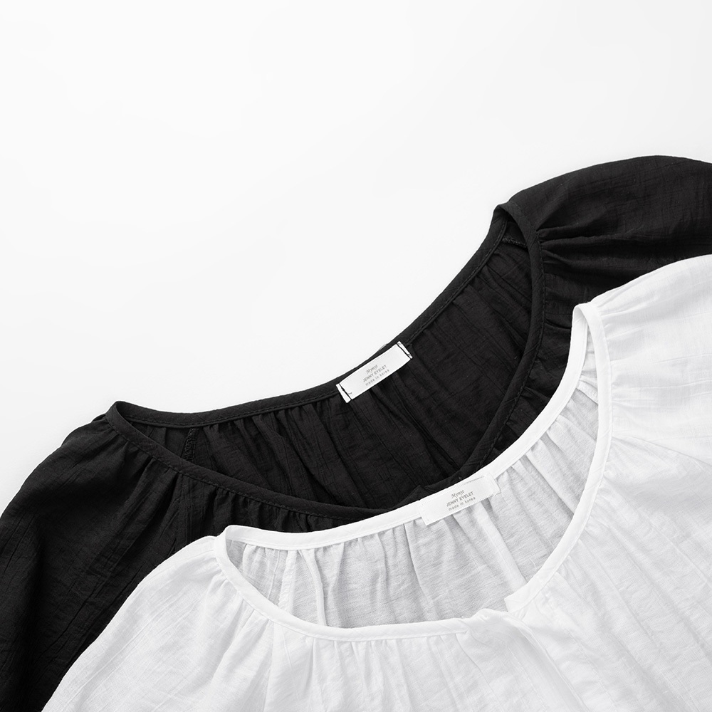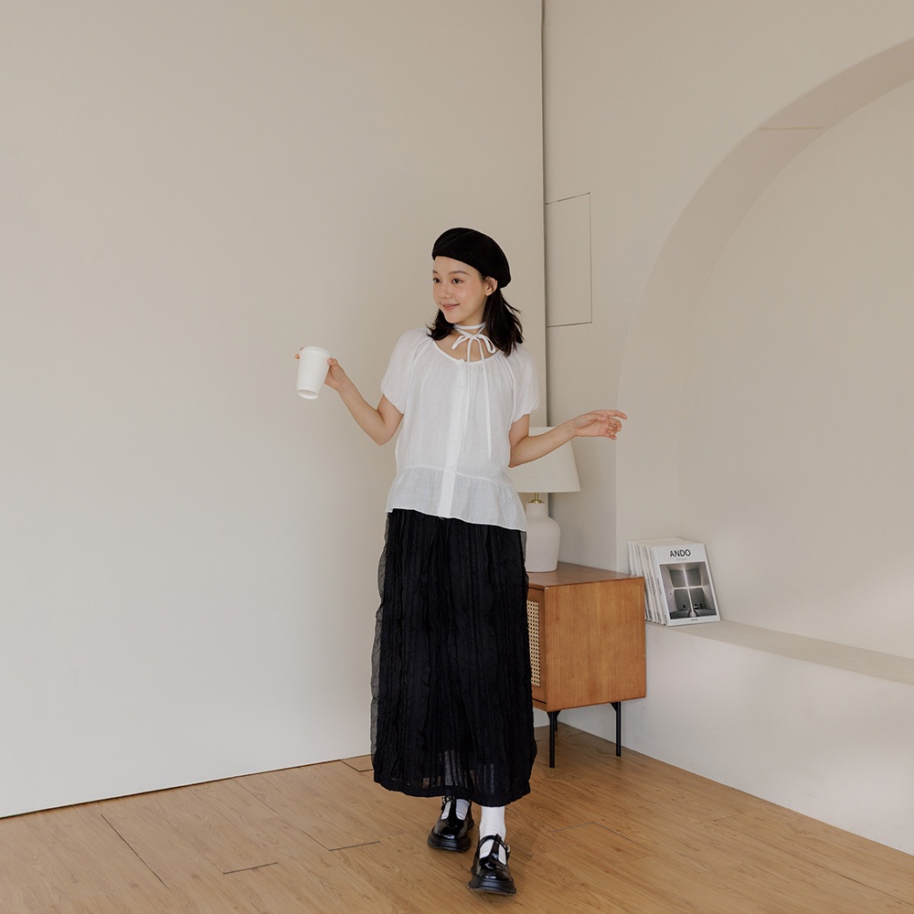 QUEENSHOP_ S 女裝 短袖 圓領腰剪接澎袖附綁帶上衣 兩色售 現+預 【01099082】黑|白OthersQUEENSHOP