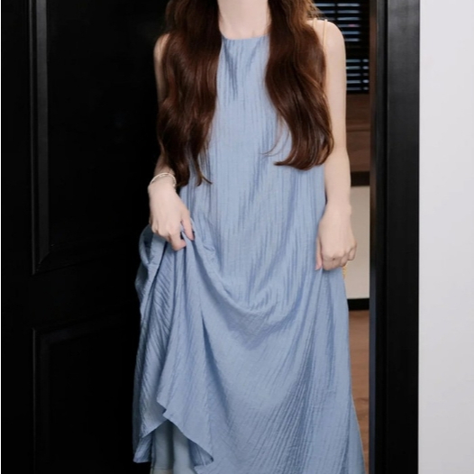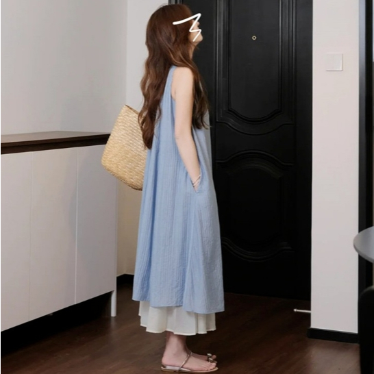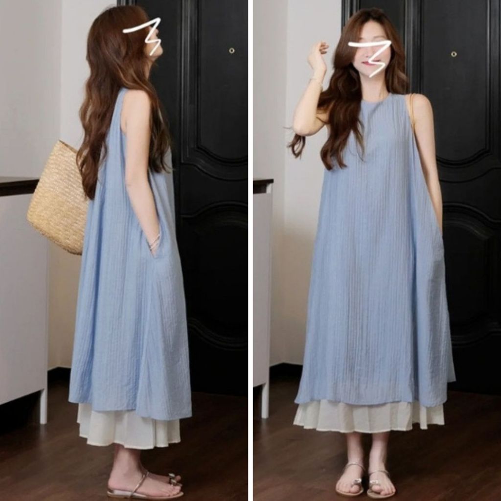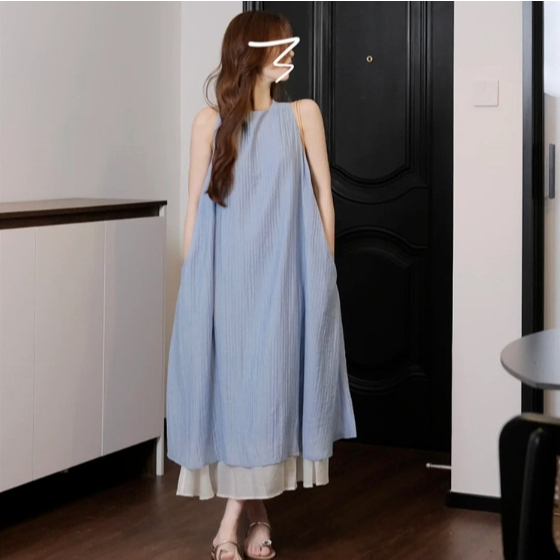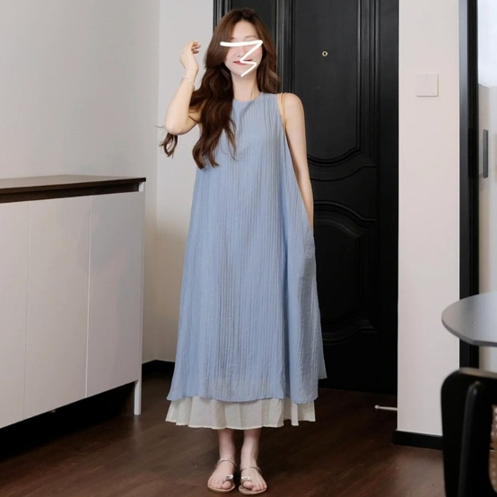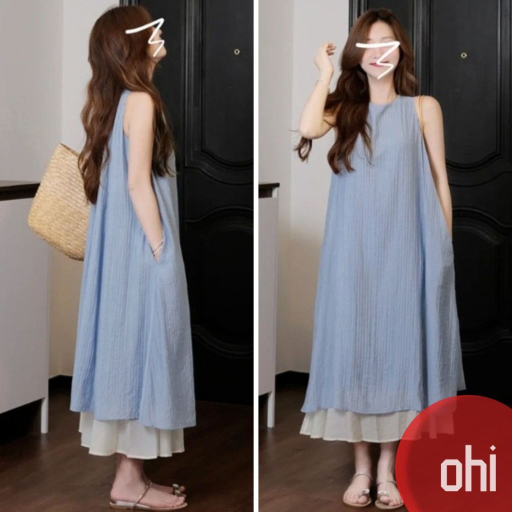 【ohi】條紋肌理感假兩件連身裙 寬鬆顯瘦垂墜感長裙 連身裙 長裙 中長款裙子 洋裝 連衣裙 女裝 GKD261藍色,S|藍色,M|藍色,L|藍色,XL|藍色,2XLOHI衣著