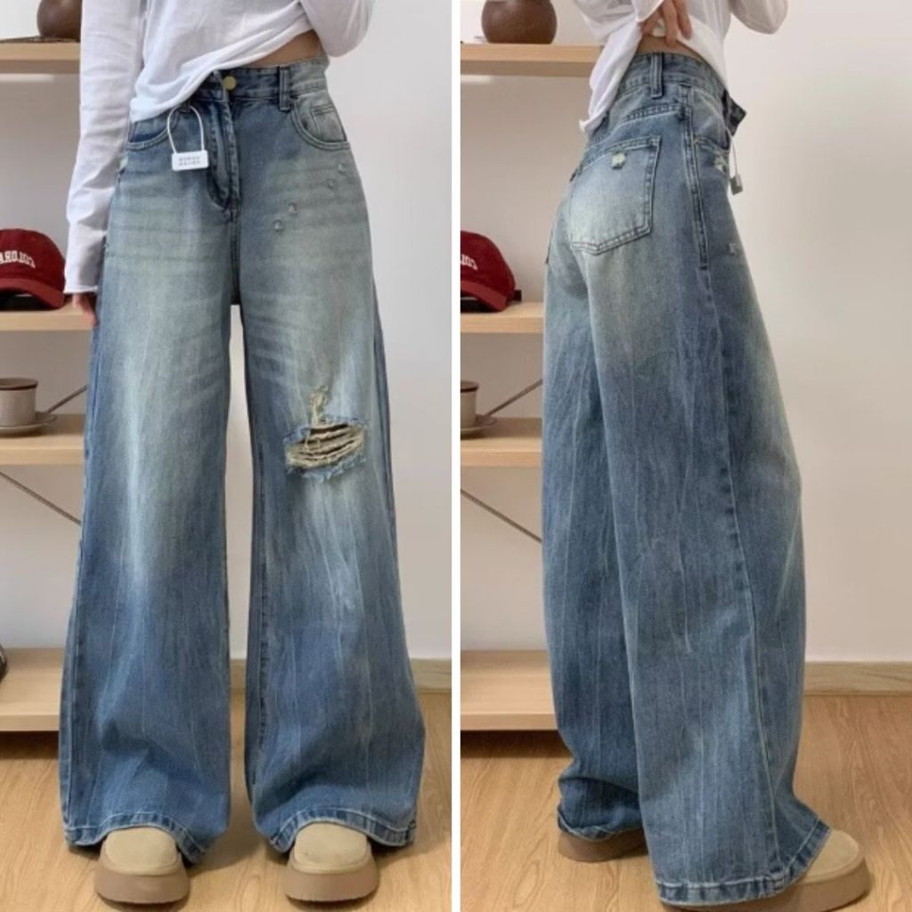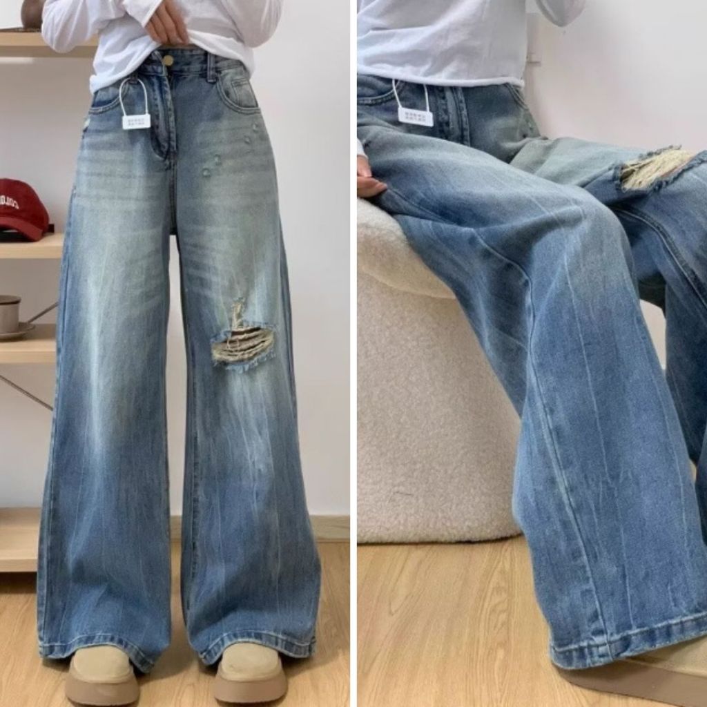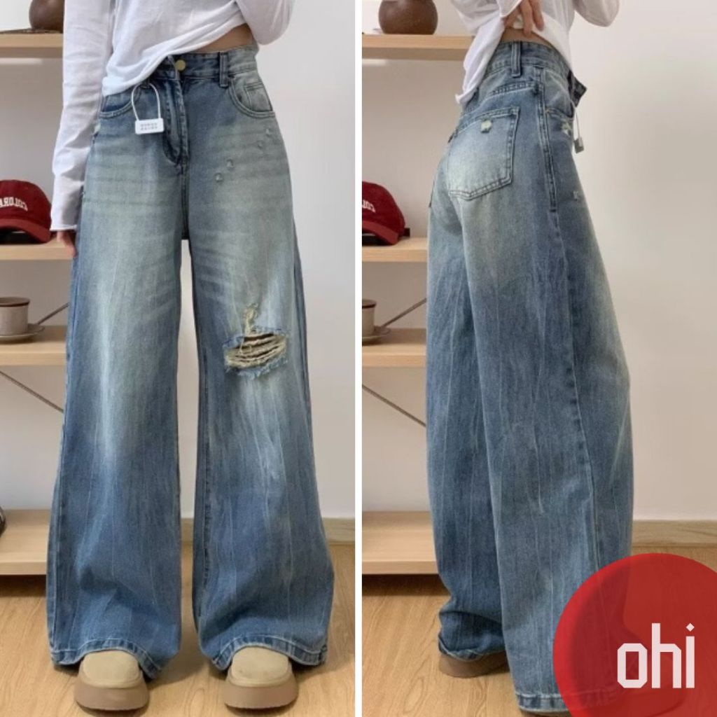 【ohi】美式設計感復古闊腿破洞牛仔褲 顯瘦牛仔長褲 長褲女 女生褲子 休閒長褲 大碼女裝 XGJY5542藍色,S|藍色,M|藍色,L|藍色,XL|藍色,2XL|藍色,3XL|藍色,4XLOHI衣著