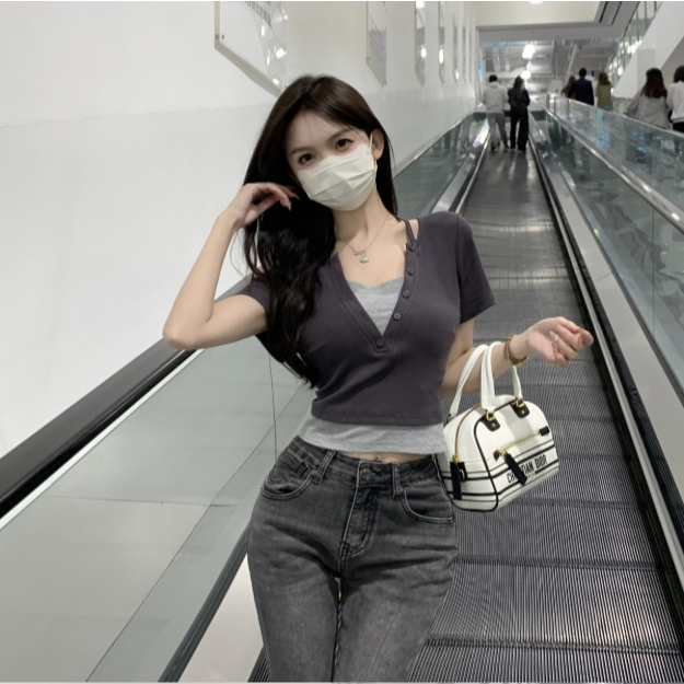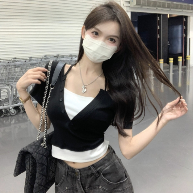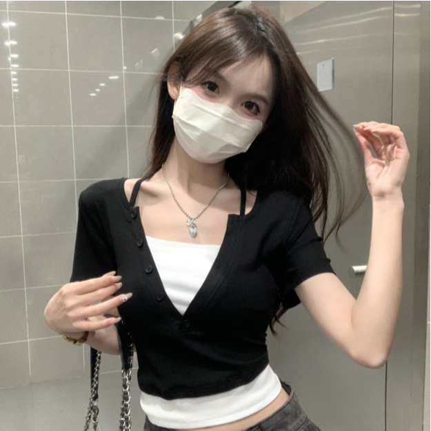 【ohi】韓系V領短袖上衣 假兩件設計感短款T恤 女生上衣 針織上衣 女裝 顯瘦上衣 韓版上衣 GWD3581