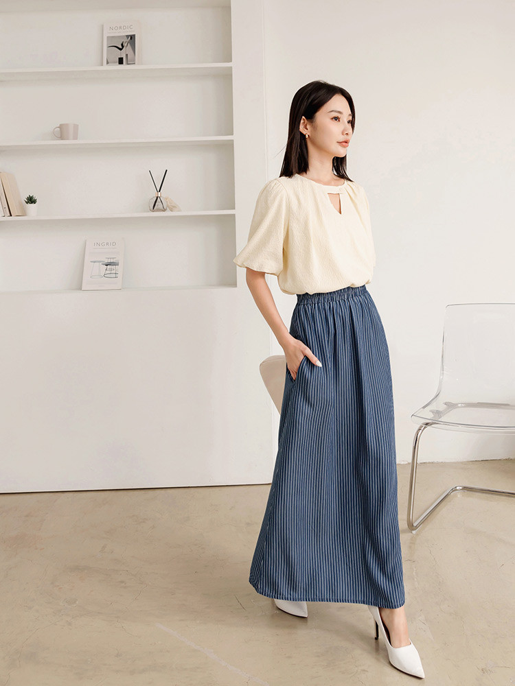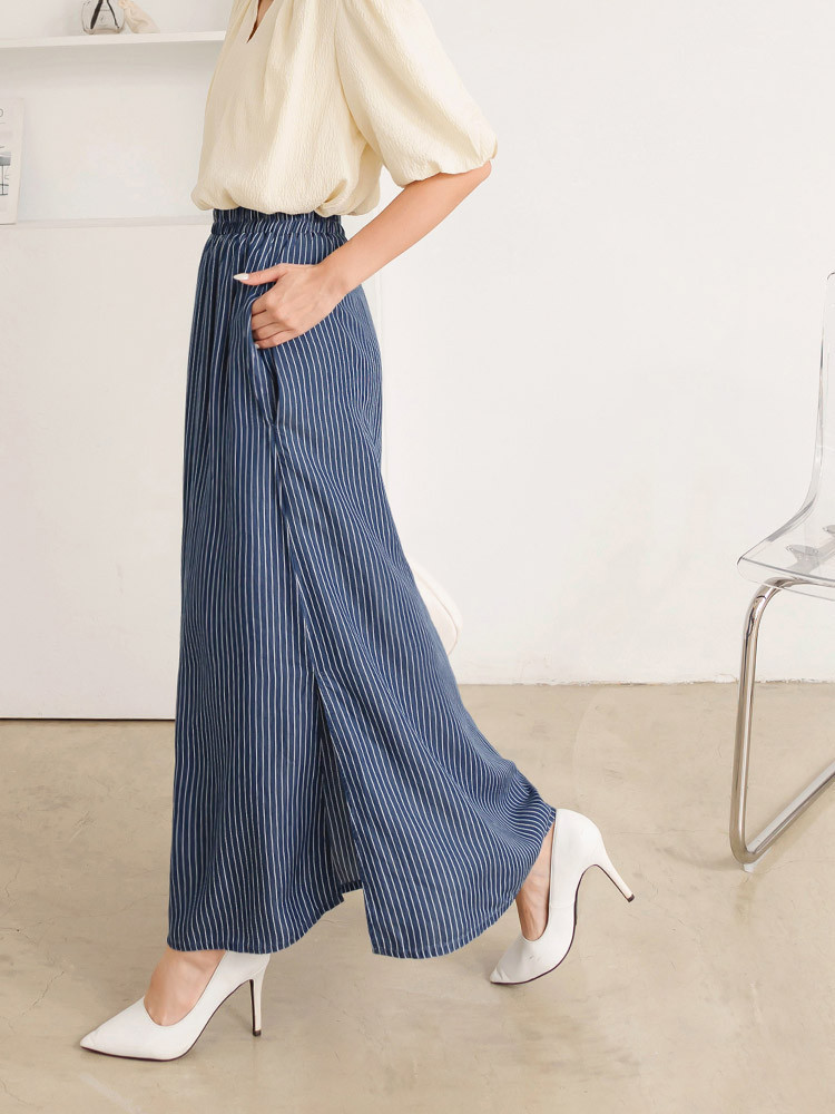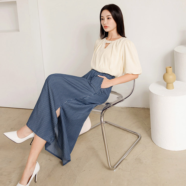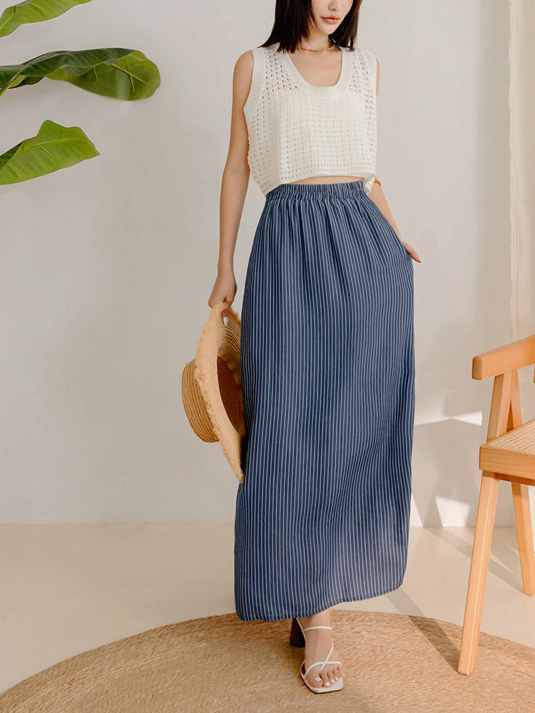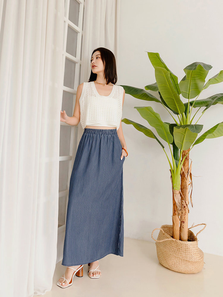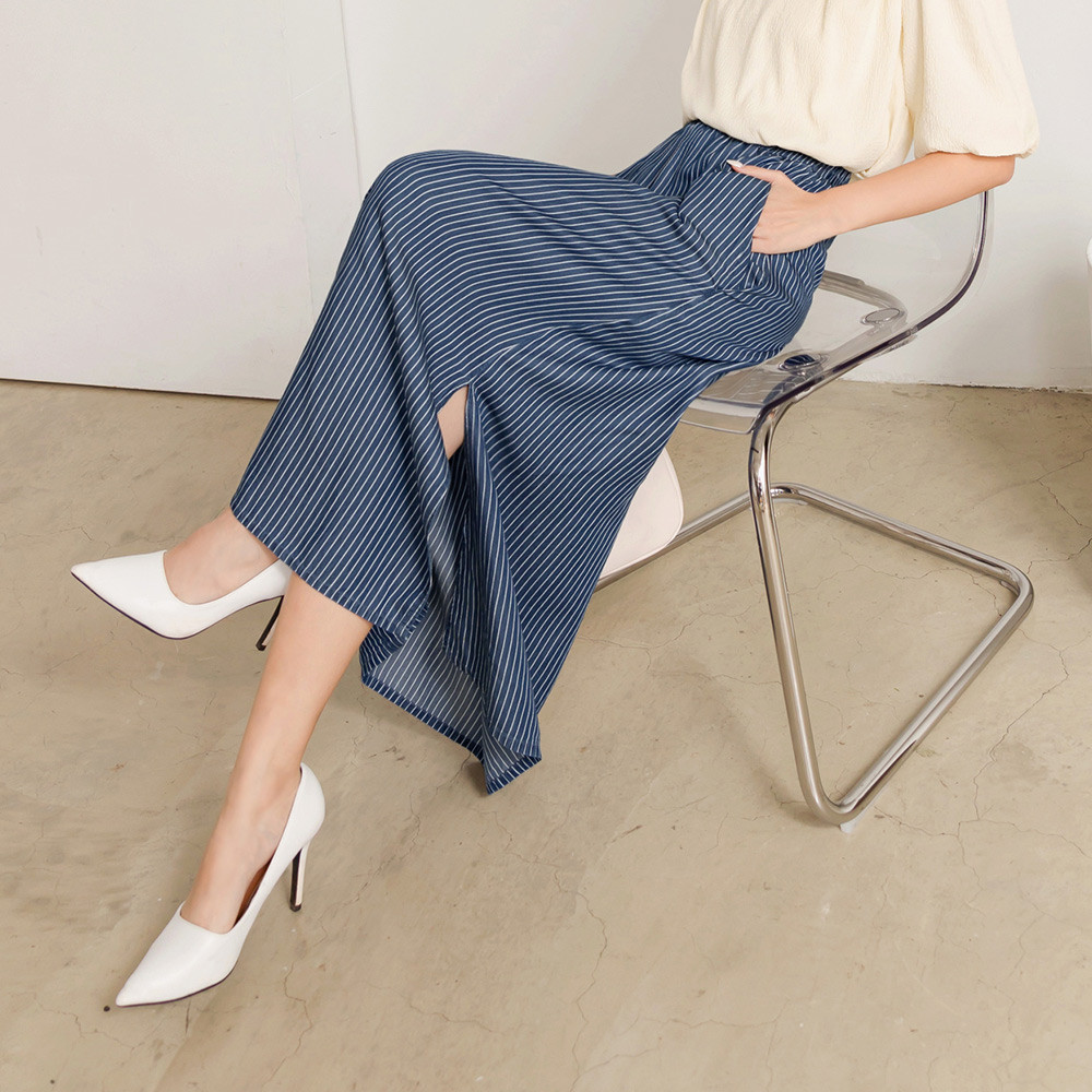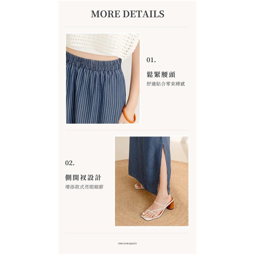 OB嚴選 涼爽輕丹寧條紋鬆緊腰側開衩長裙 《CA2943》女裝/現貨丹寧藍,S|丹寧藍,M|丹寧藍,L|丹寧藍,XLOB嚴選官方旗艦店