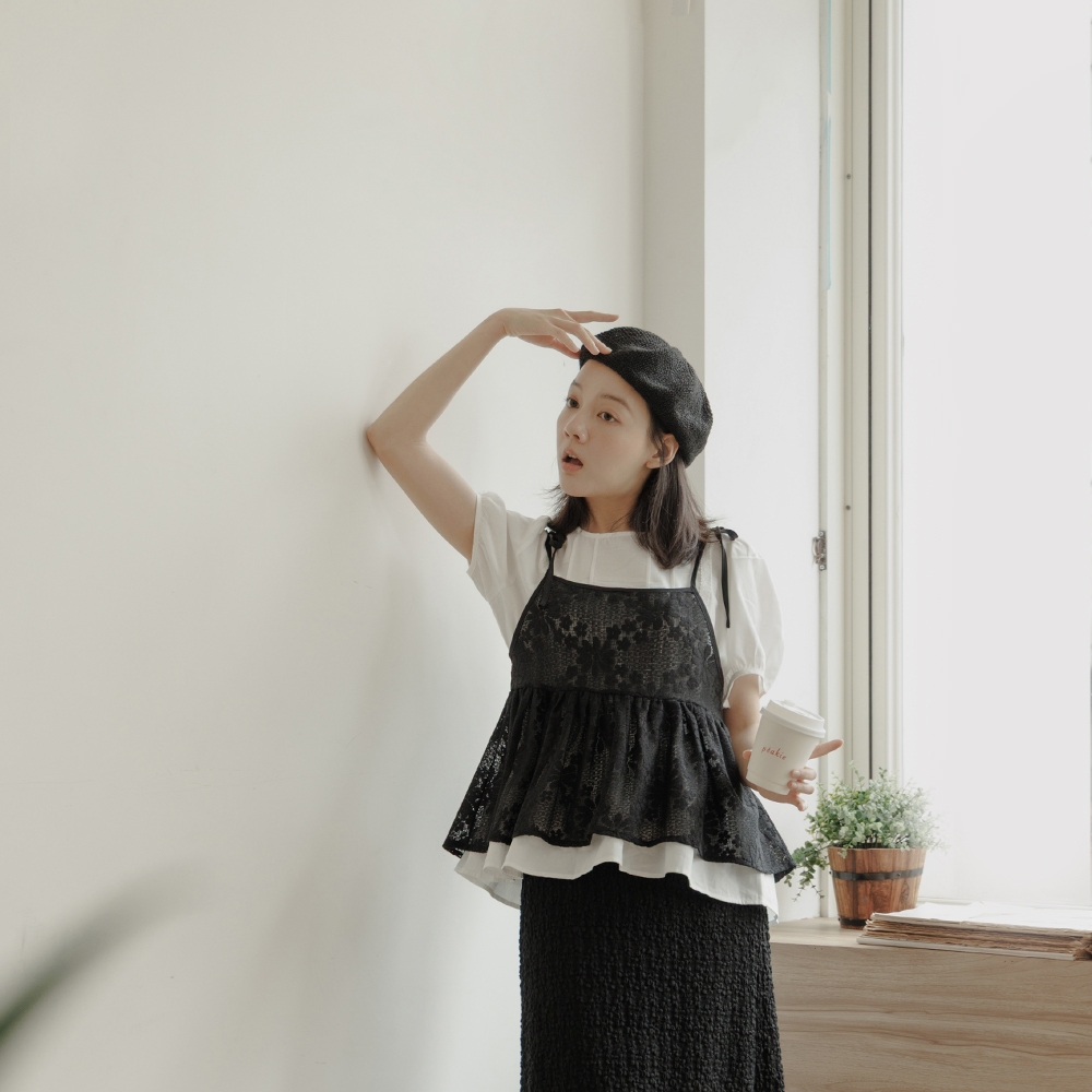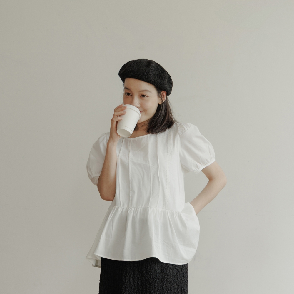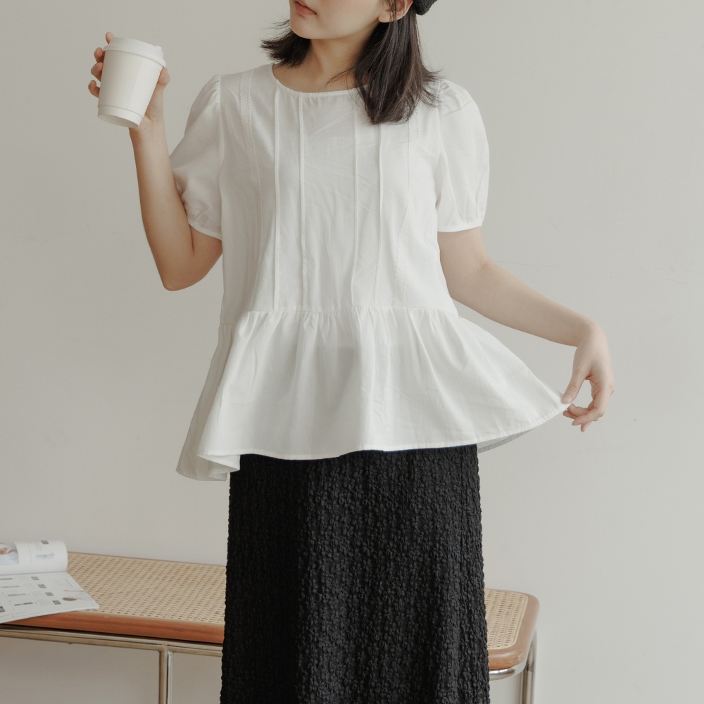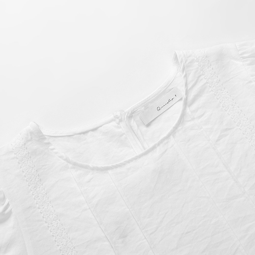 QUEENSHOP_ S 女裝 短袖 蕾絲拼接澎袖傘擺設計上衣 現+預 【01099030】依賣場OthersQUEENSHOP