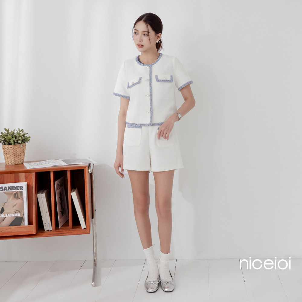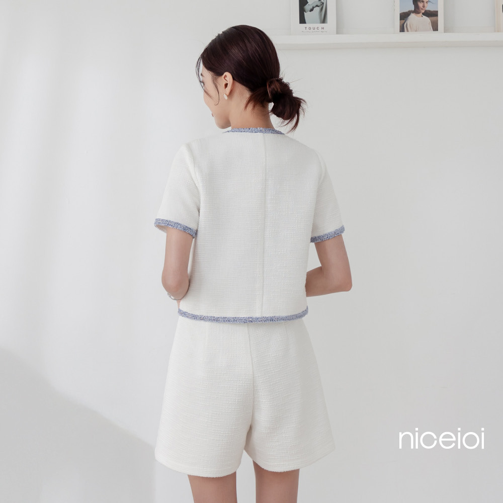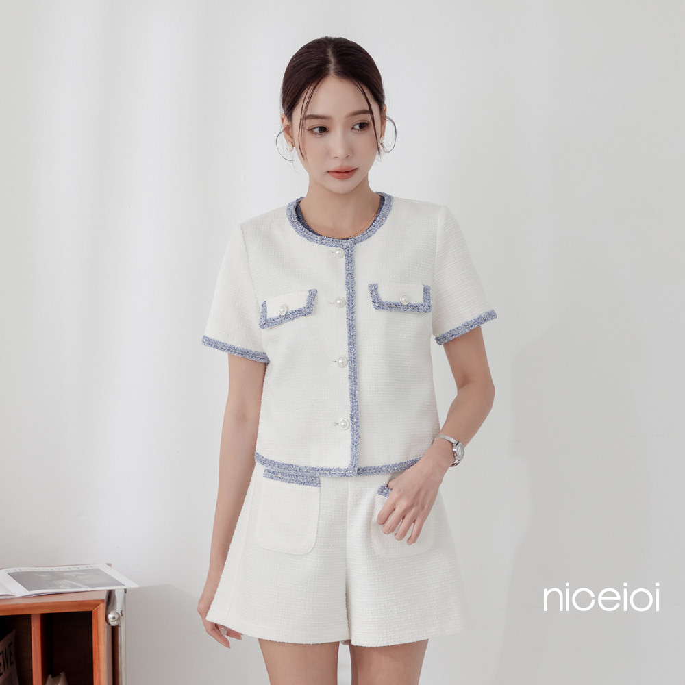 niceioi 小香風上衣 短袖 氣質上衣 白色 [清甜少女小香風撞色毛邊方格織紋上衣] 排扣上衣 大尺碼上衣 女裝小香風上衣-白,M|小香風上衣-白,L|小香風上衣-白,XL|小香風上衣-白,Sniceioi 官方旗艦店