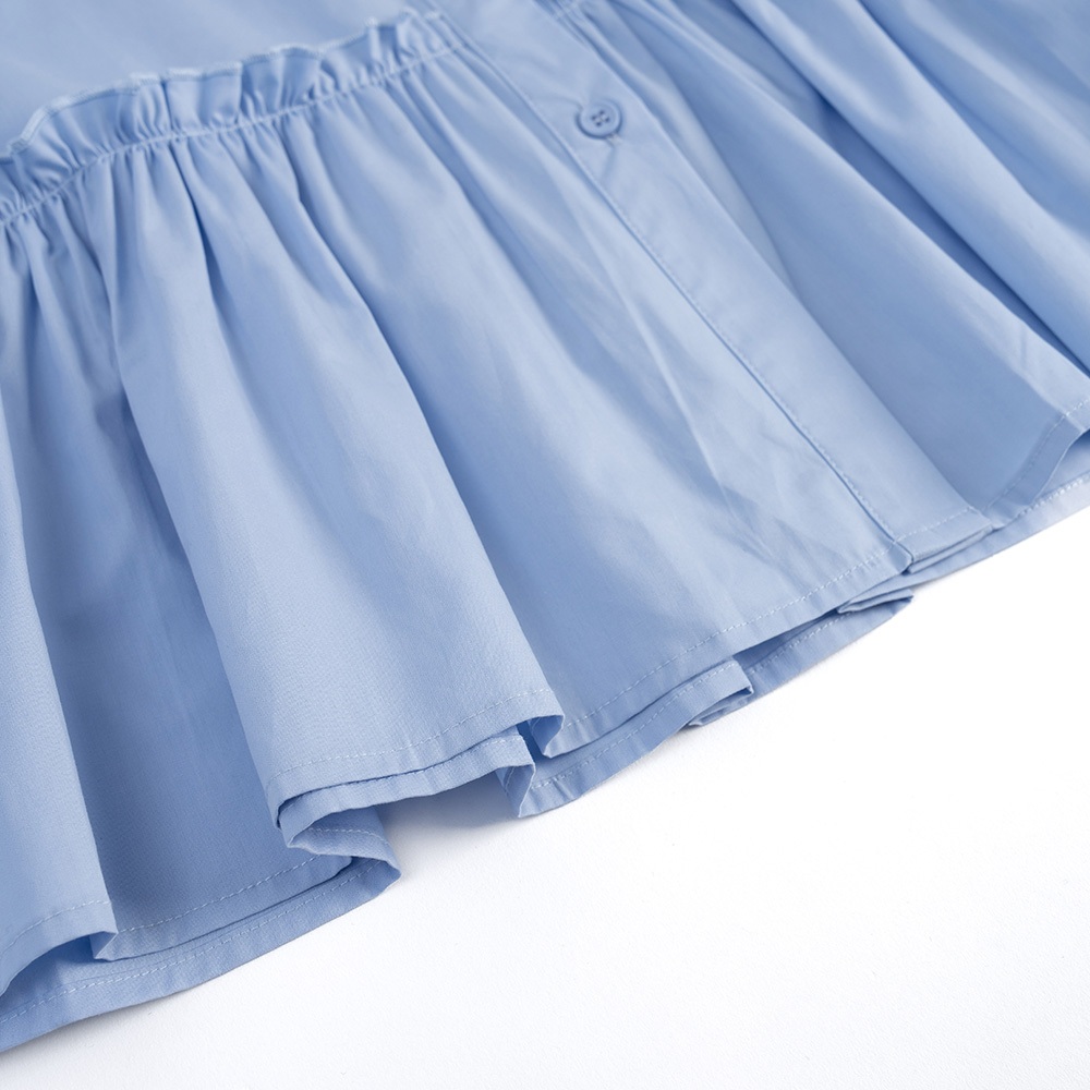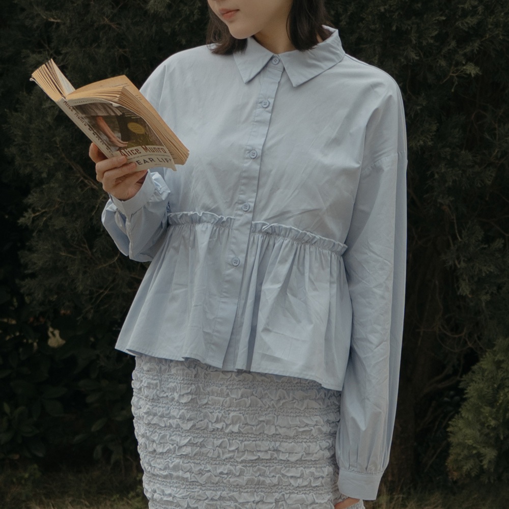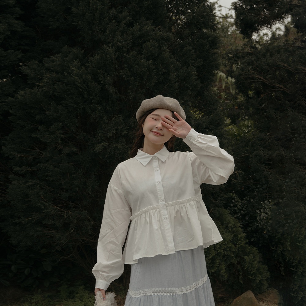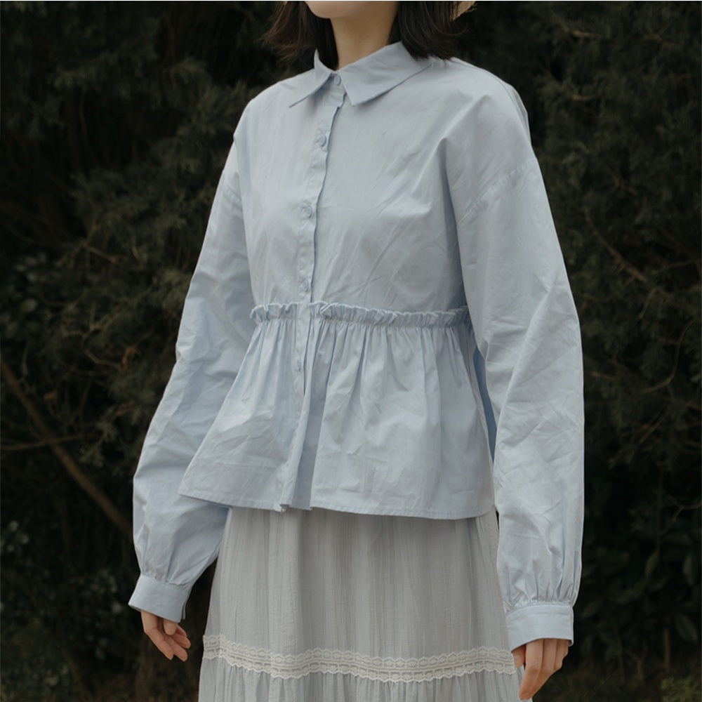 QUEENSHOP_ S 女裝 長袖 荷葉抽皺剪接傘擺襯衫 兩色售 現+預 【01025538】藍|米白Shirts & BlousesQUEENSHOP