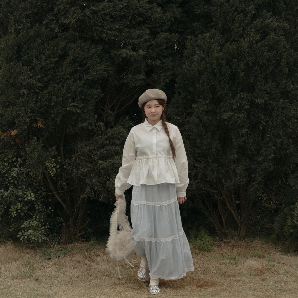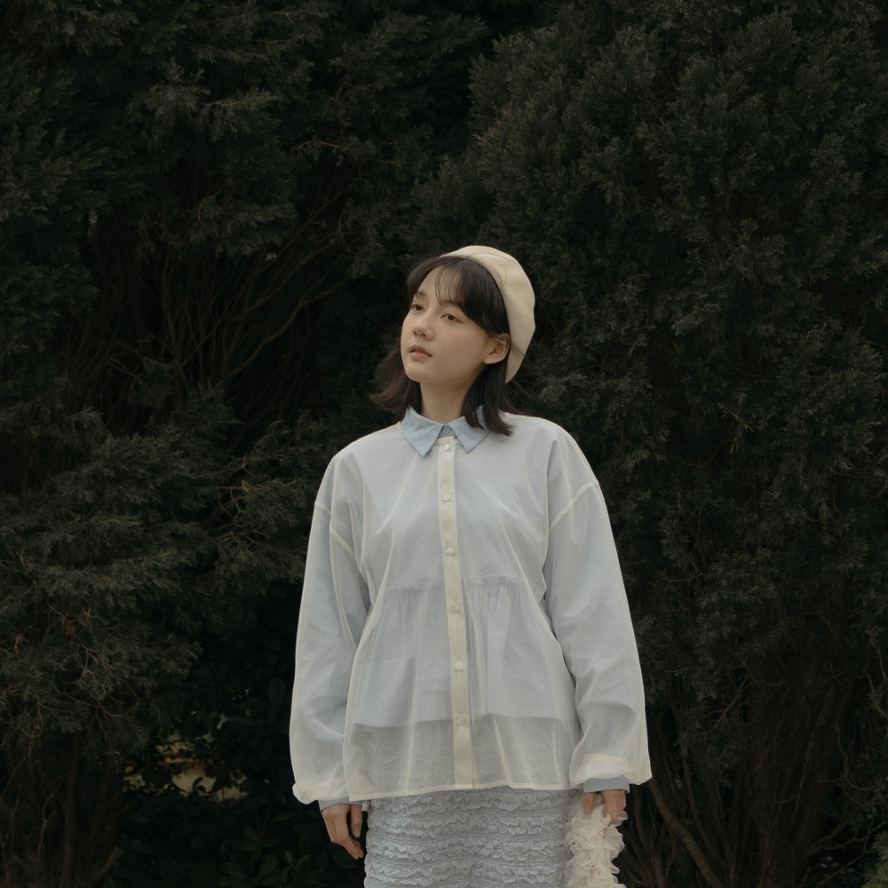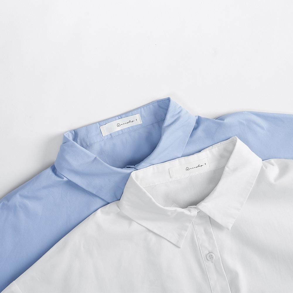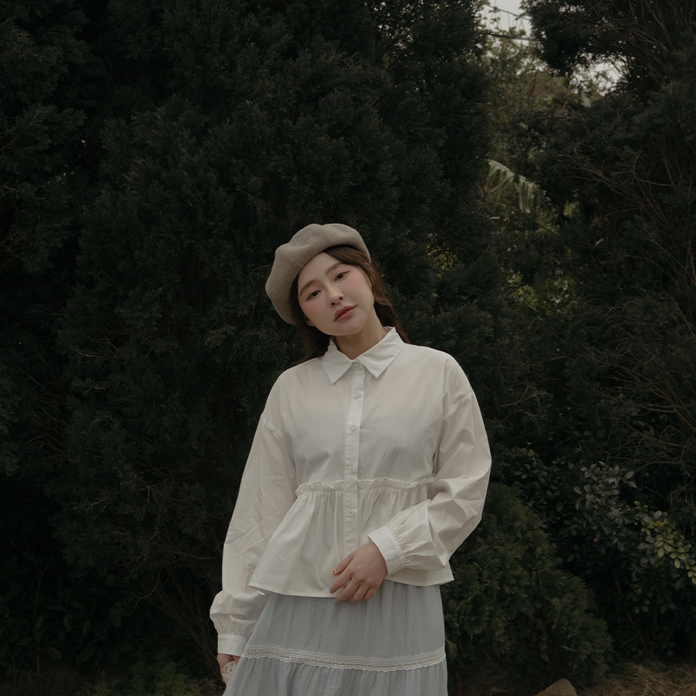 QUEENSHOP_ S 女裝 長袖 荷葉抽皺剪接傘擺襯衫 兩色售 現+預 【01025538】藍|米白Shirts & BlousesQUEENSHOP