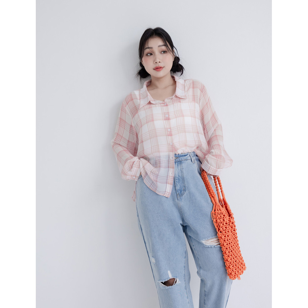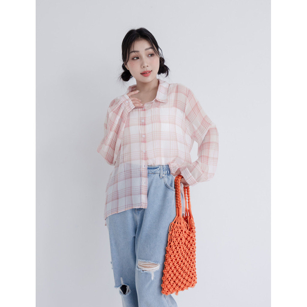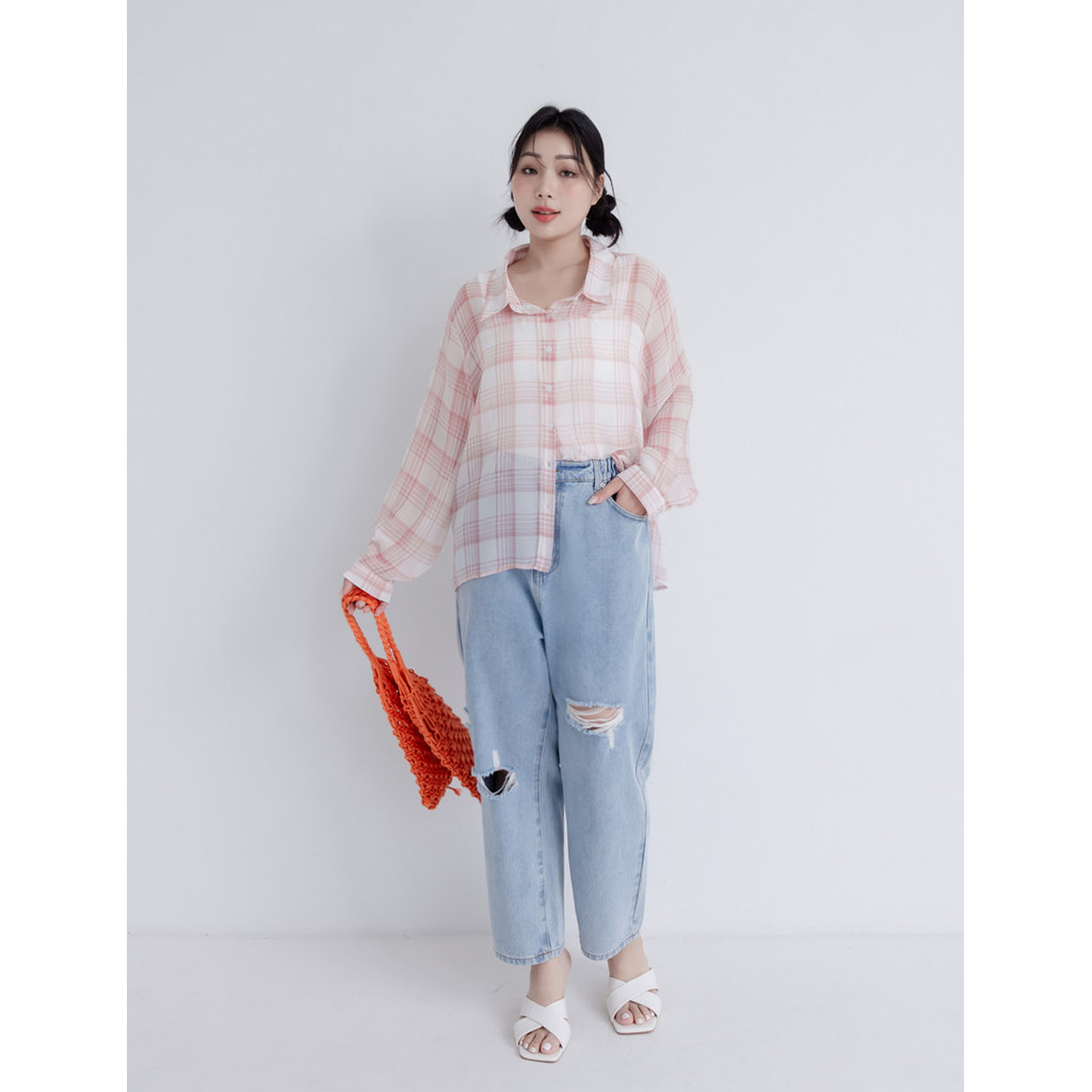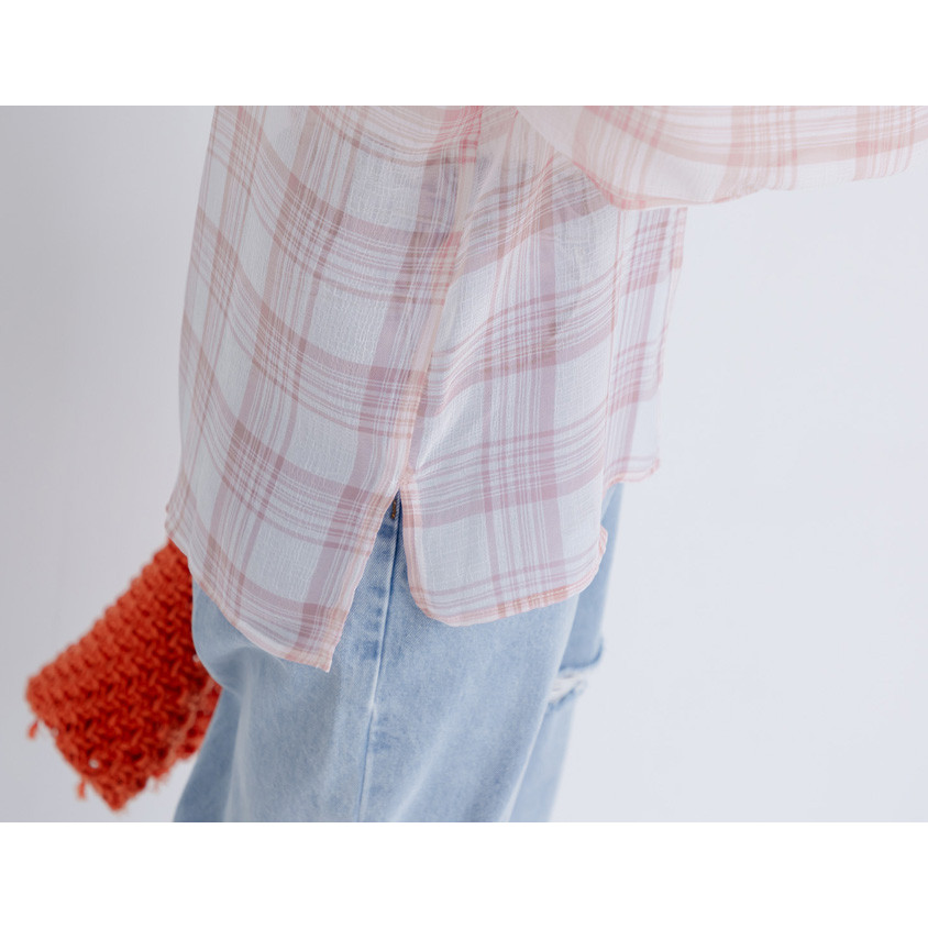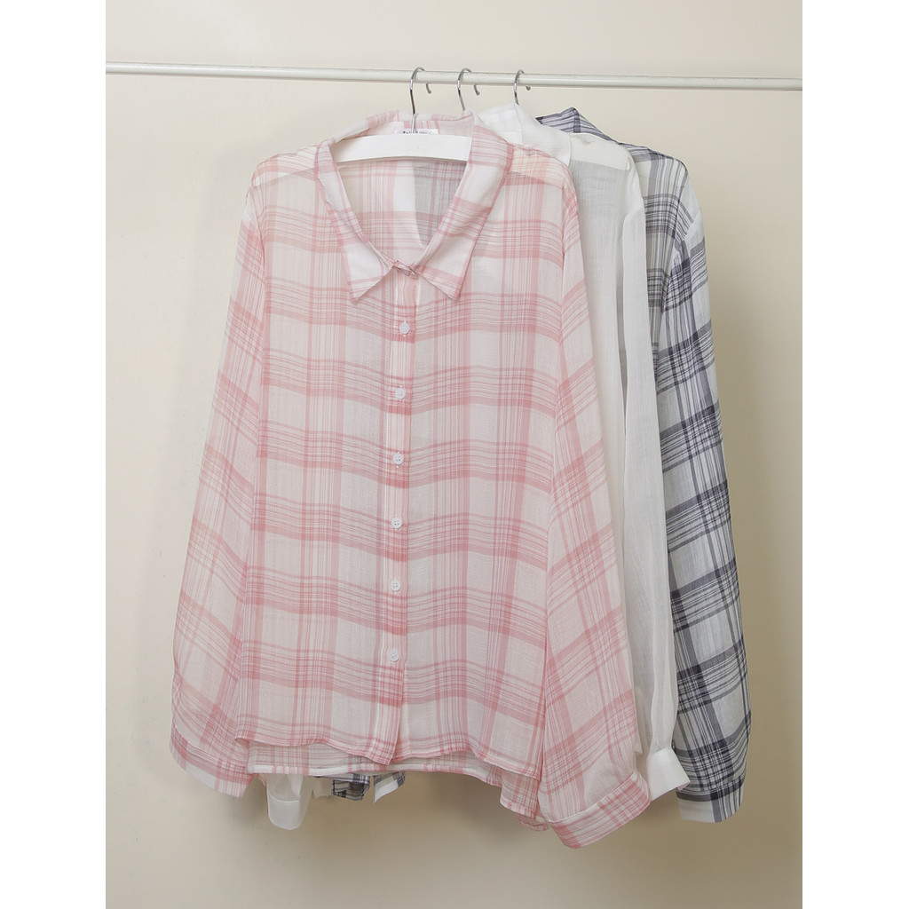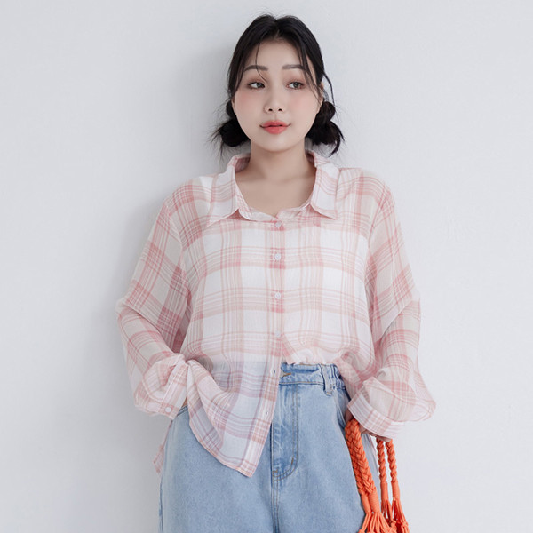 【PolyLulu】 皺皺感透膚格子長袖襯衫 中大尺碼上衣 粉格色L|XL|2XL|3XLShirts & BlousesPOLY LULU丨BEAUTY HAS NO SIZE 中大尺碼女裝