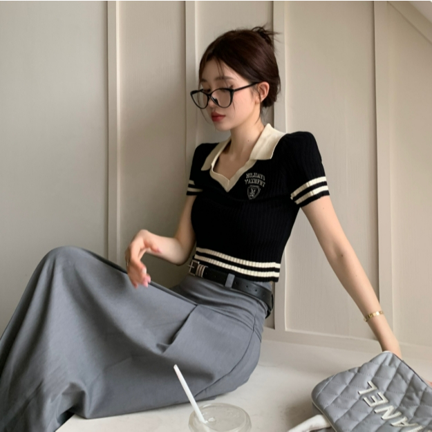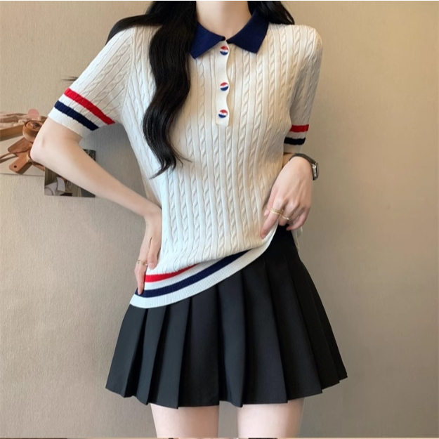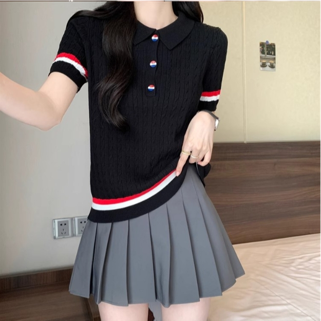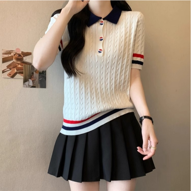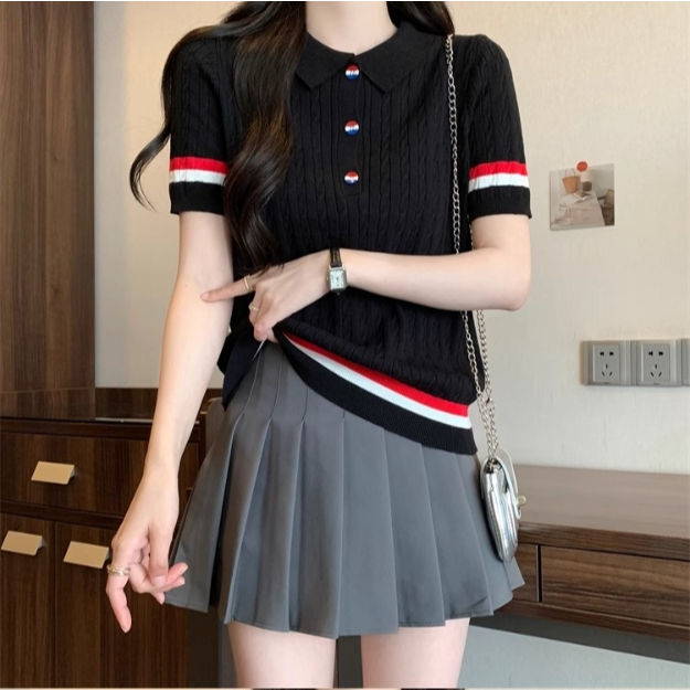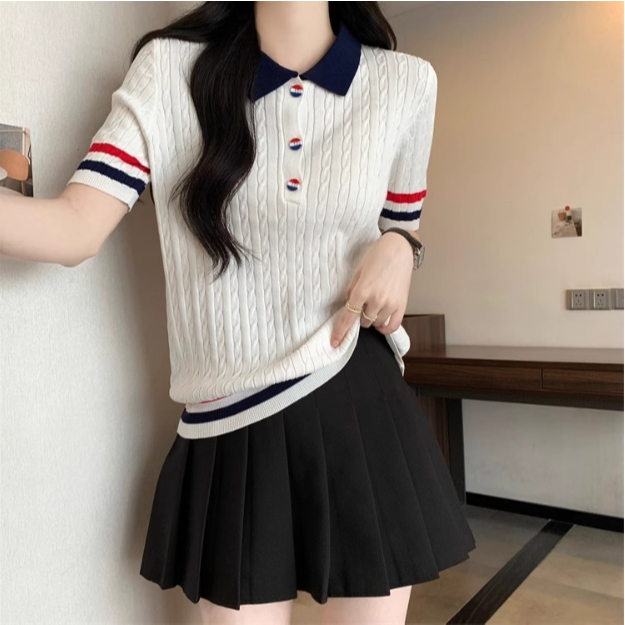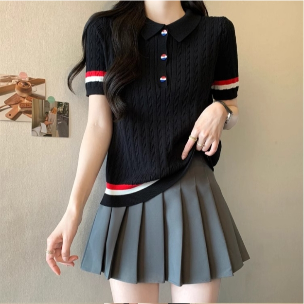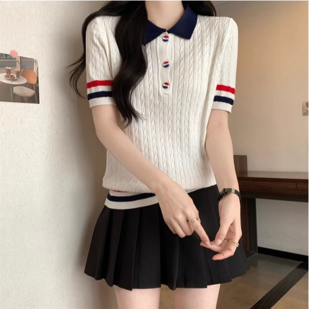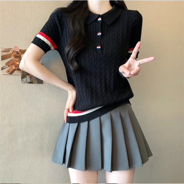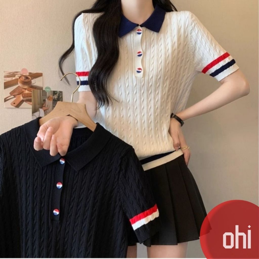 【ohi】新款短袖POLO領撞色鈕扣針織上衣 女生上衣 針織上衣 女裝 顯瘦上衣 韓版上衣 GWD6613黑色,F碼(40-65KG可穿)|白色,F碼(40-65KG可穿)T-shirtsOHI衣著