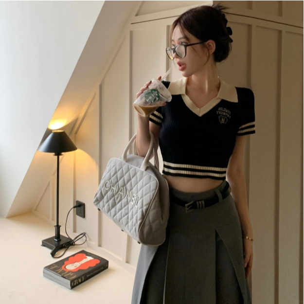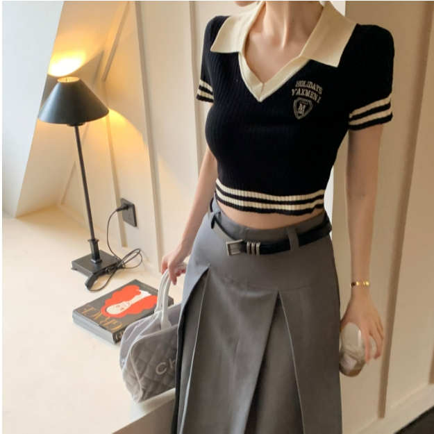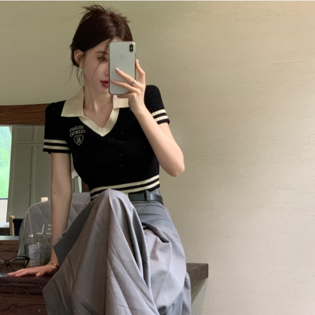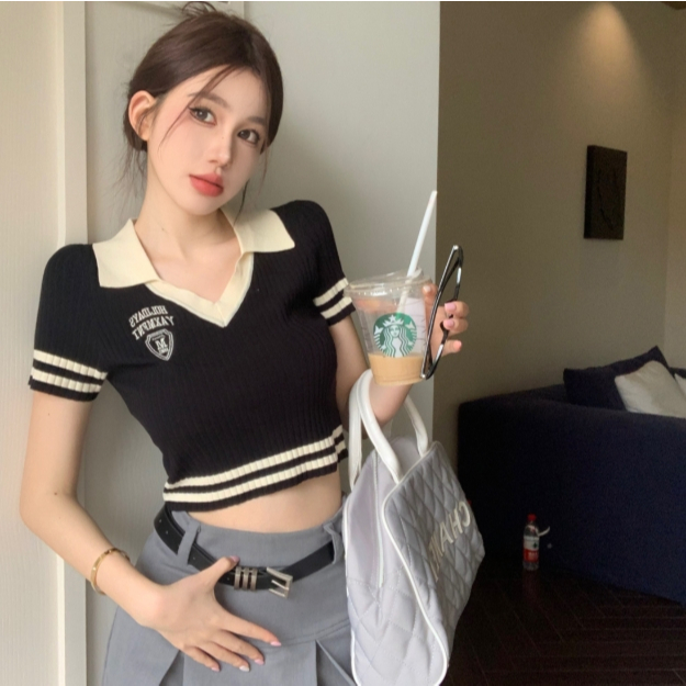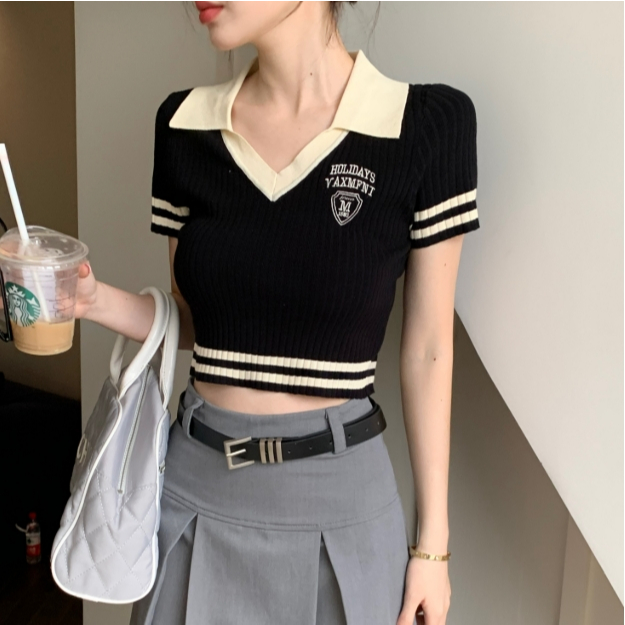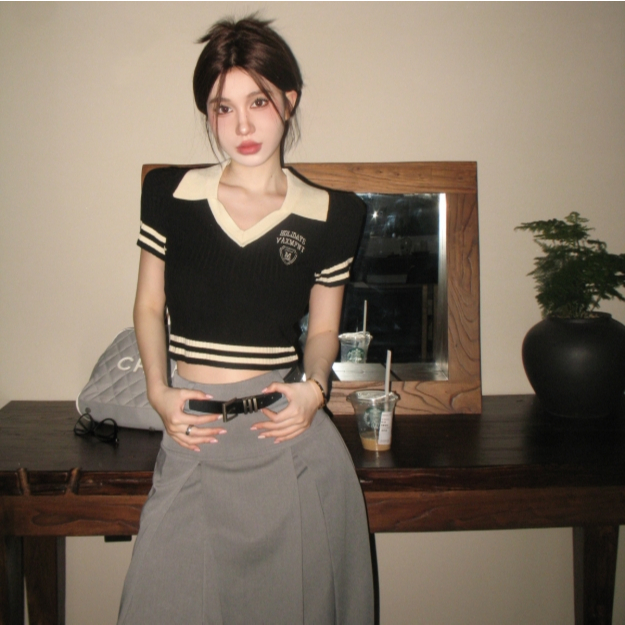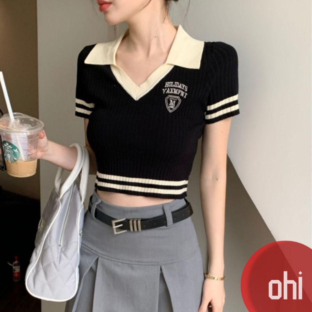 【ohi】美式辣妹V領短袖正肩T恤 露臍修身短款POLO領上衣 針織上衣 女裝 顯瘦上衣 韓版上衣 GWD3655黑色T-shirtsOHI衣著