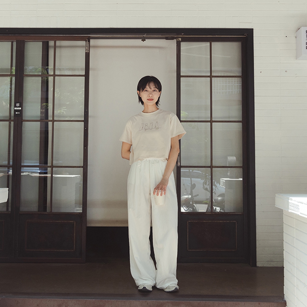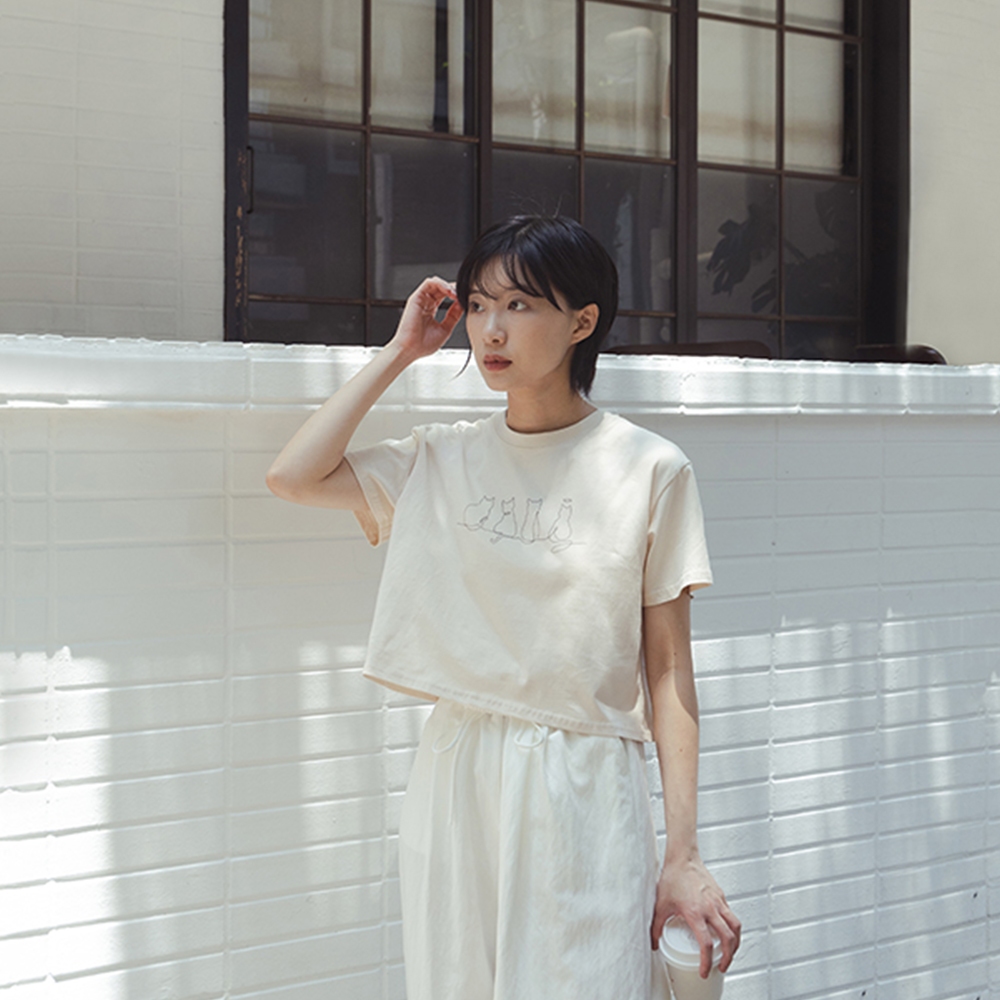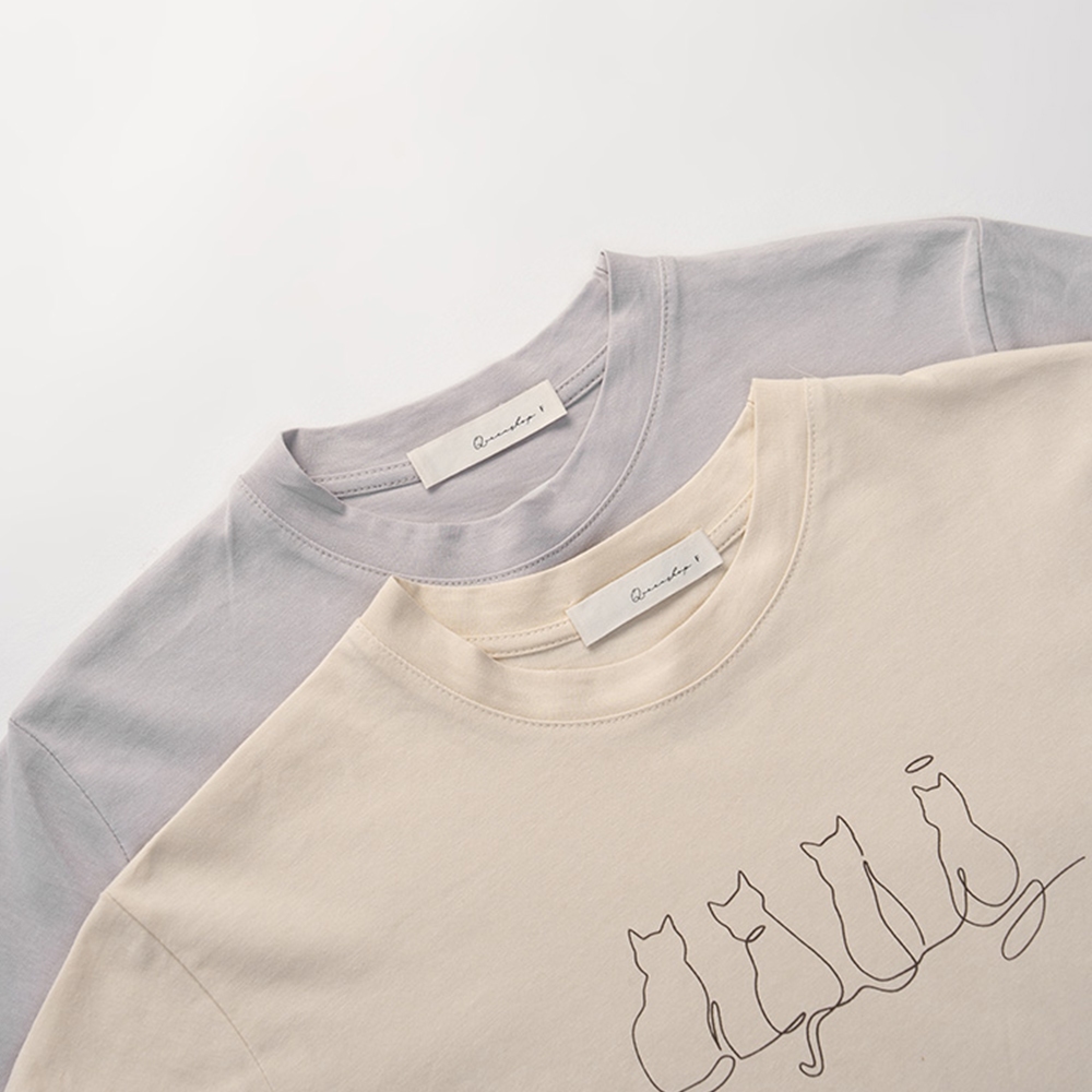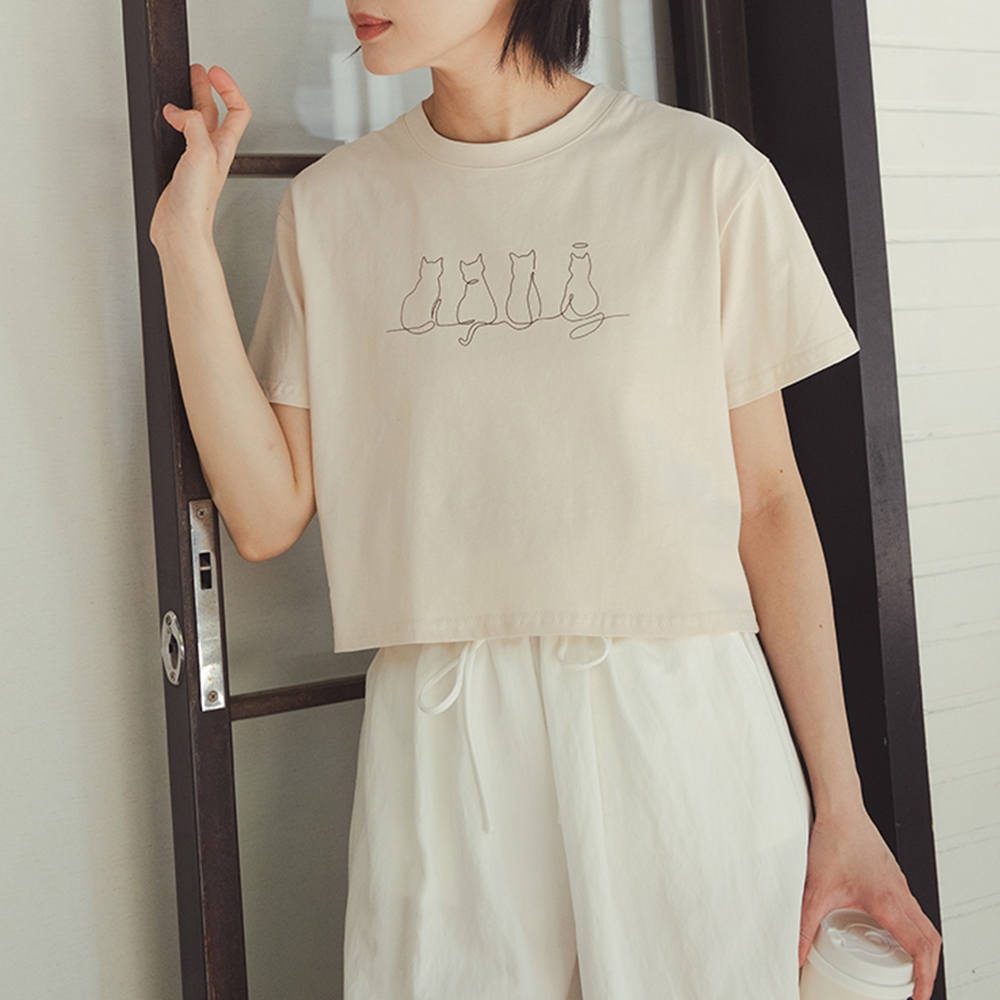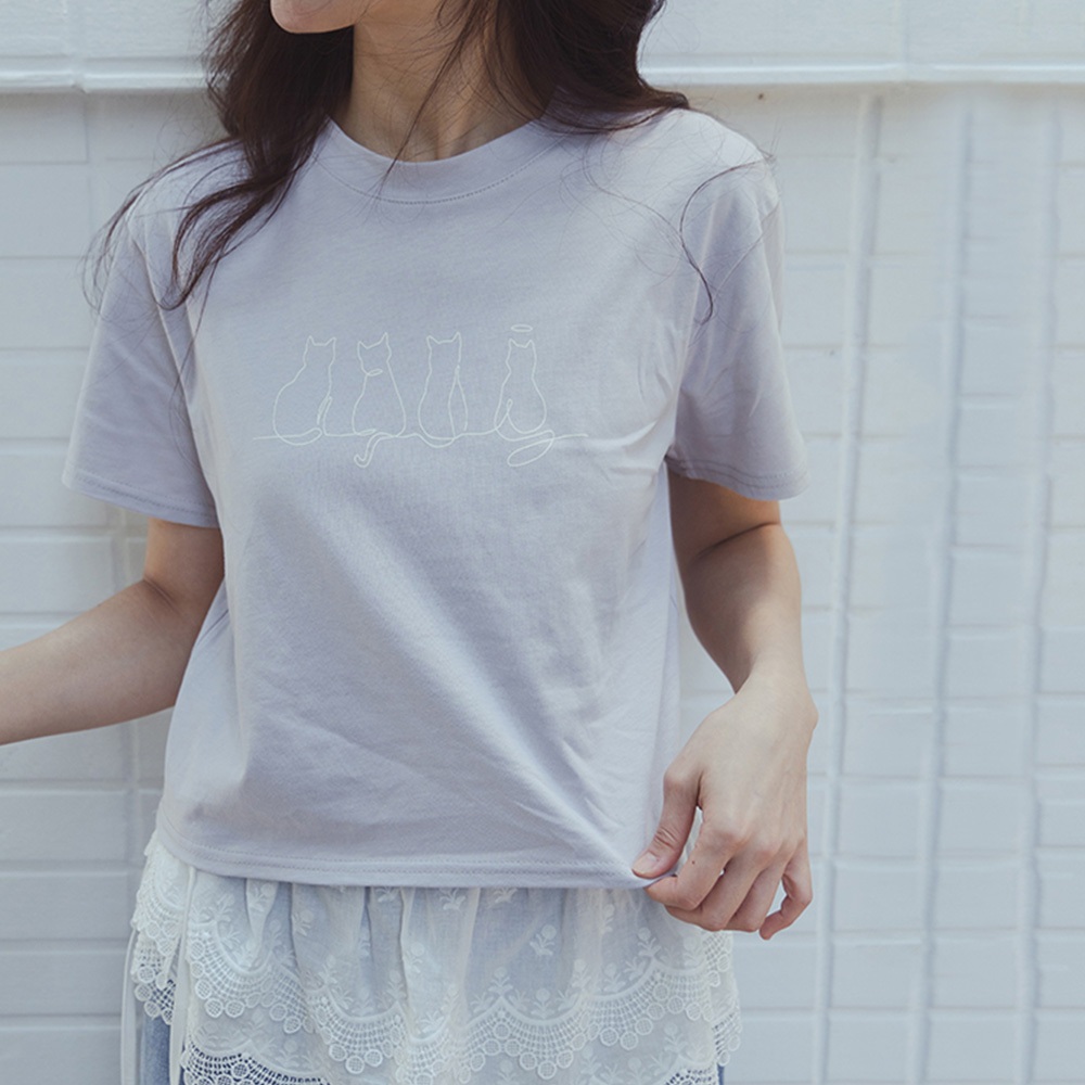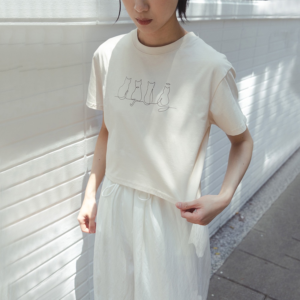 QUEENSHOP_ S 女裝 貓貓插圖短版短袖上衣 兩色售 現+預 【01099029】灰|杏T-shirtsQUEENSHOP
