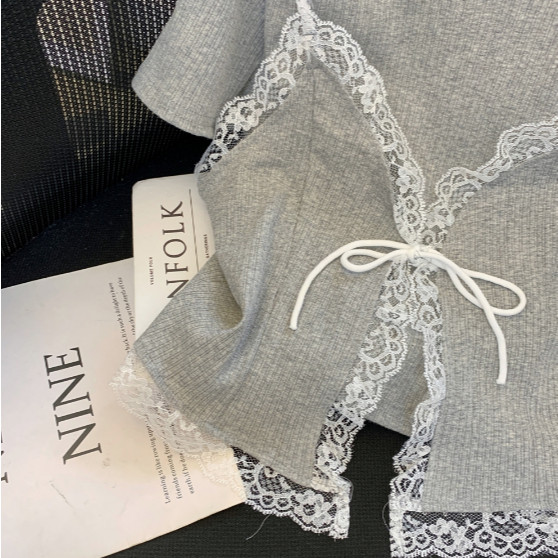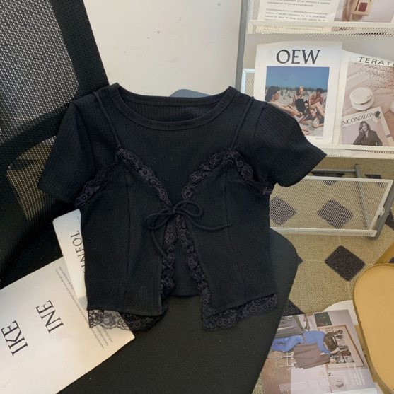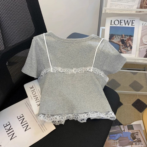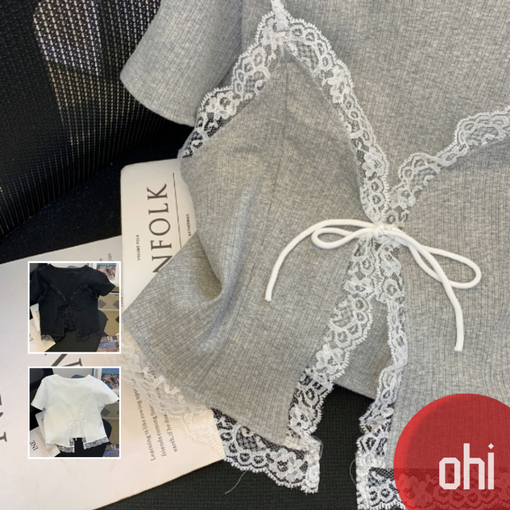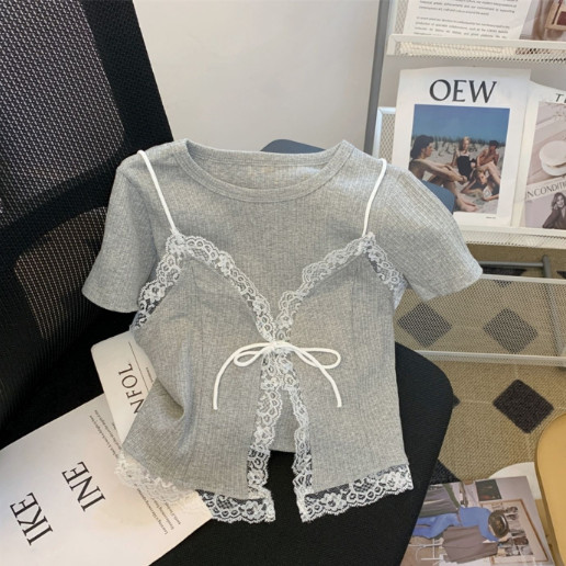 【ohi】正肩短袖T恤兩件套 純欲蕾絲邊拼接系帶吊帶背心 針織上衣T恤 夏天衣服 女裝 GWH6515黑色,均碼-65KG以內都可穿|白色,均碼-65KG以內都可穿|灰色,均碼-65KG以內都可穿T-shirtsOHI衣著