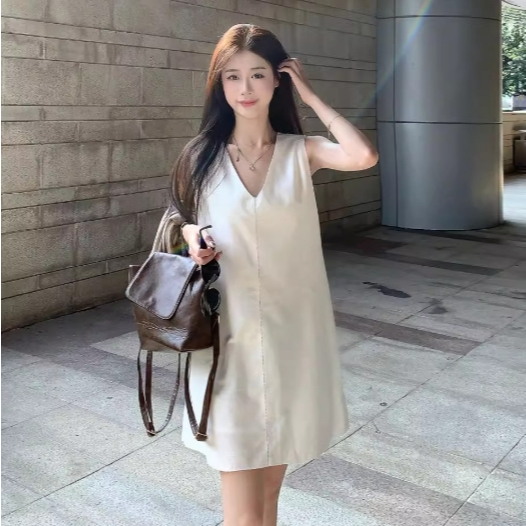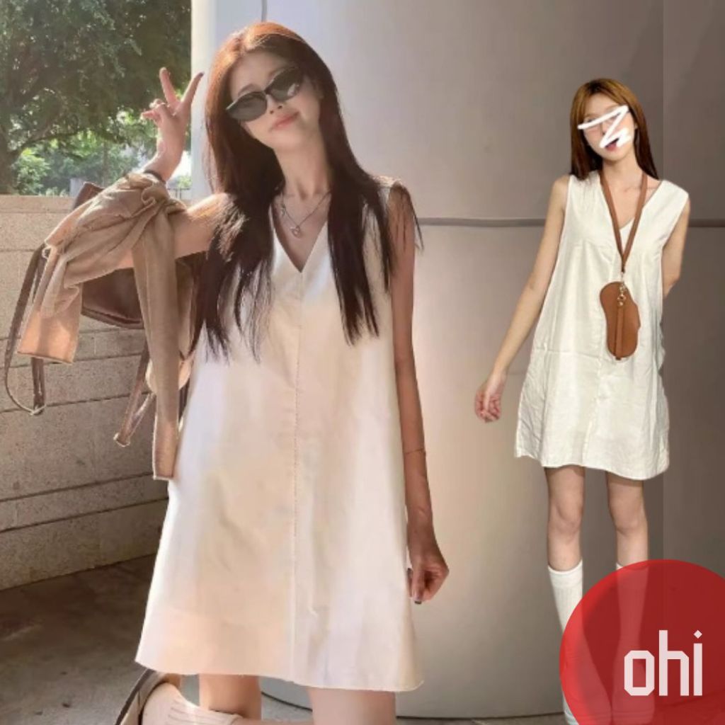 【ohi】無袖背心V領連身裙 簡約純色寬鬆顯瘦短裙 連身裙 短裙 裙子 洋裝 連衣裙 女裝 GKD263