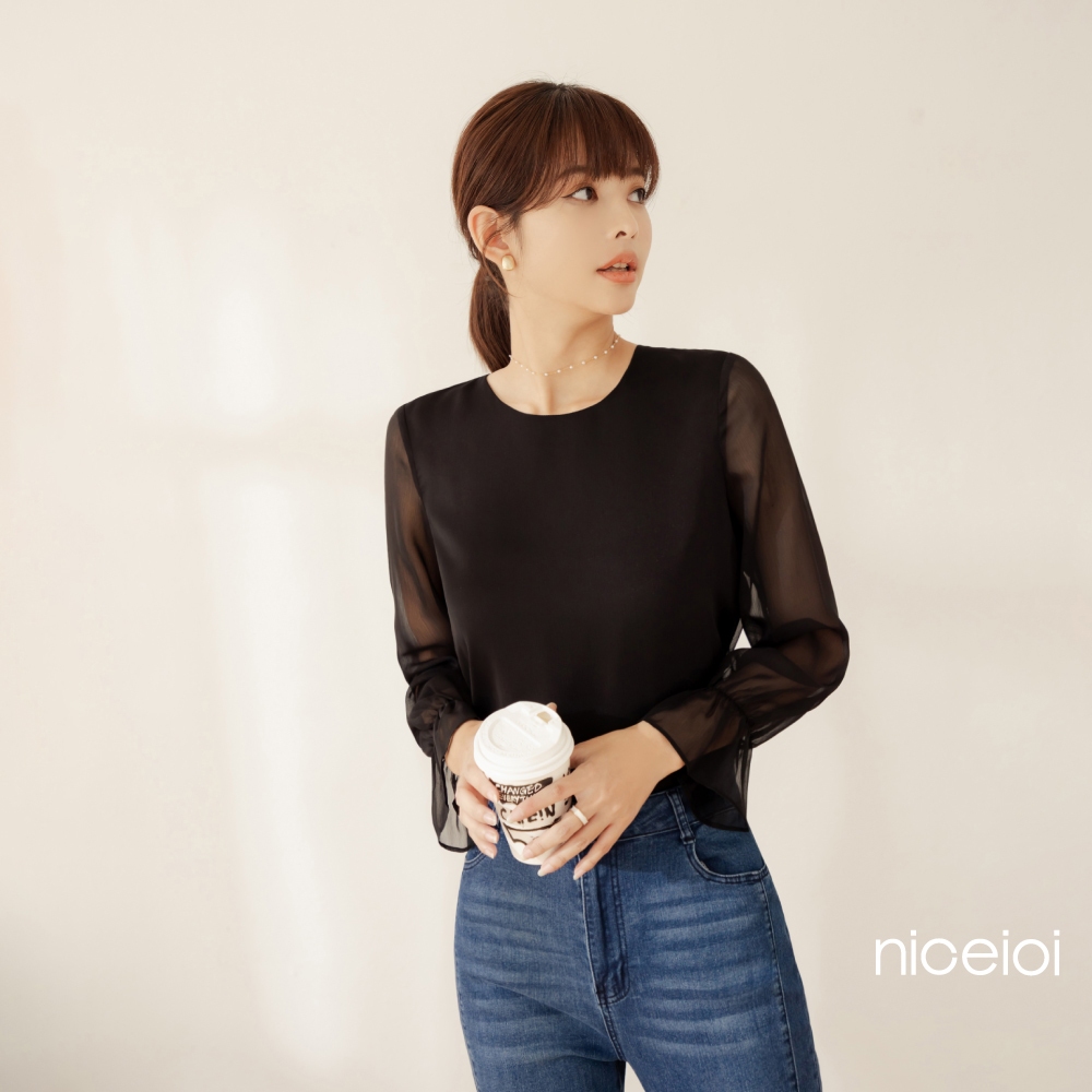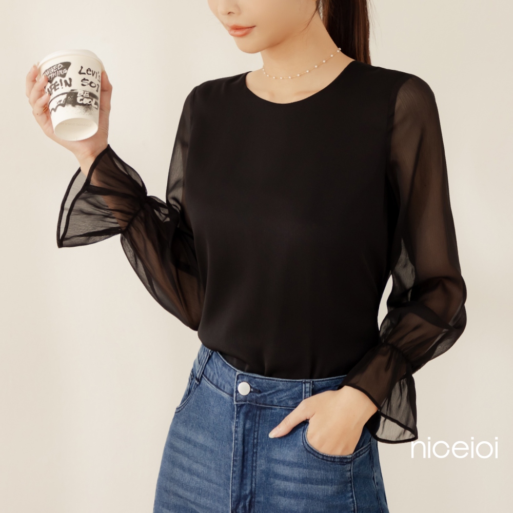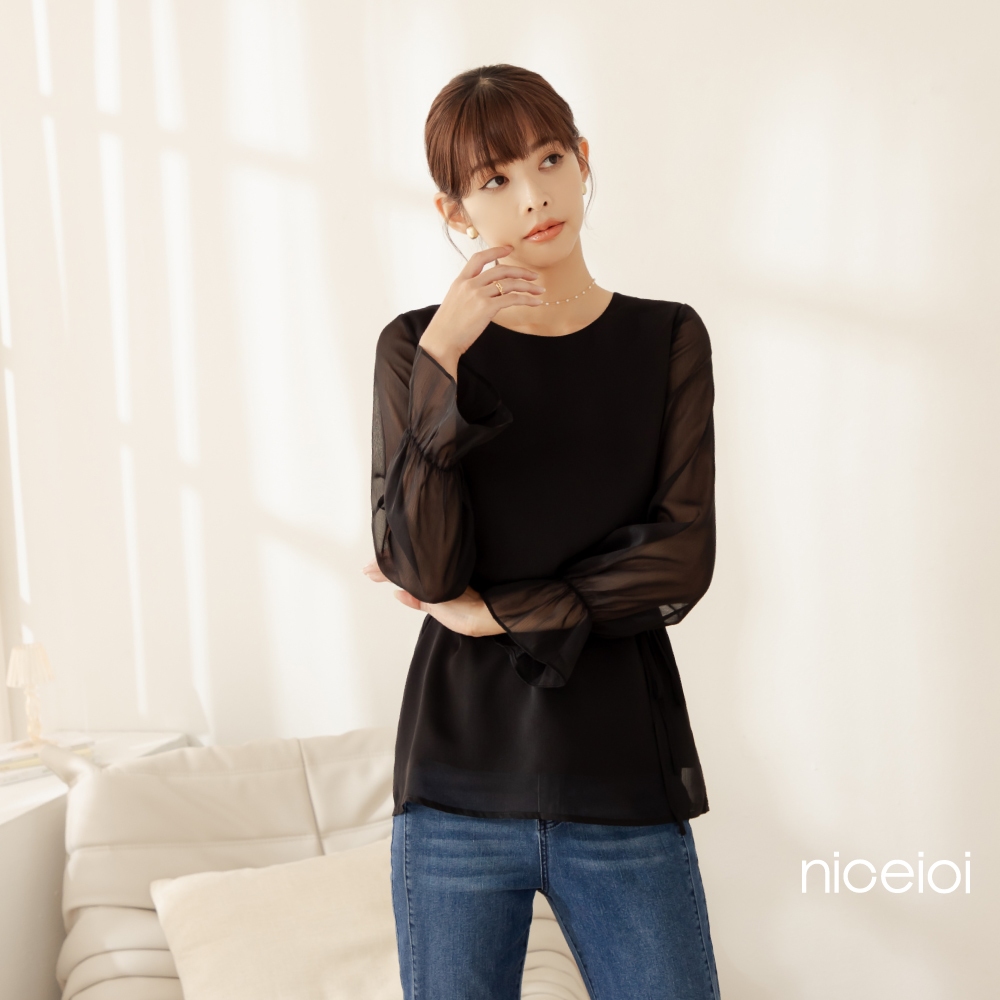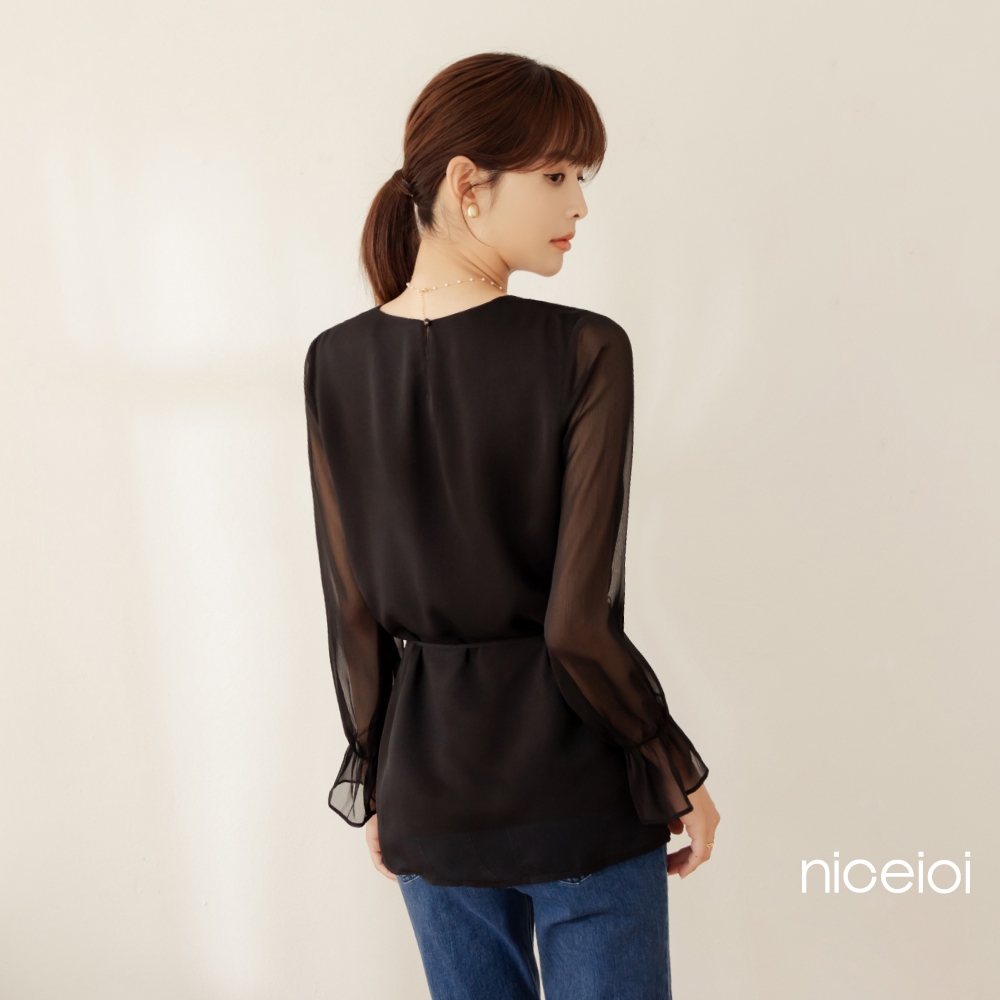 niceioi【特惠】韓系微透雪紡綁帶上衣 女裝黑,M|黑,L|黑,XL|黑,Sniceioi 官方旗艦店