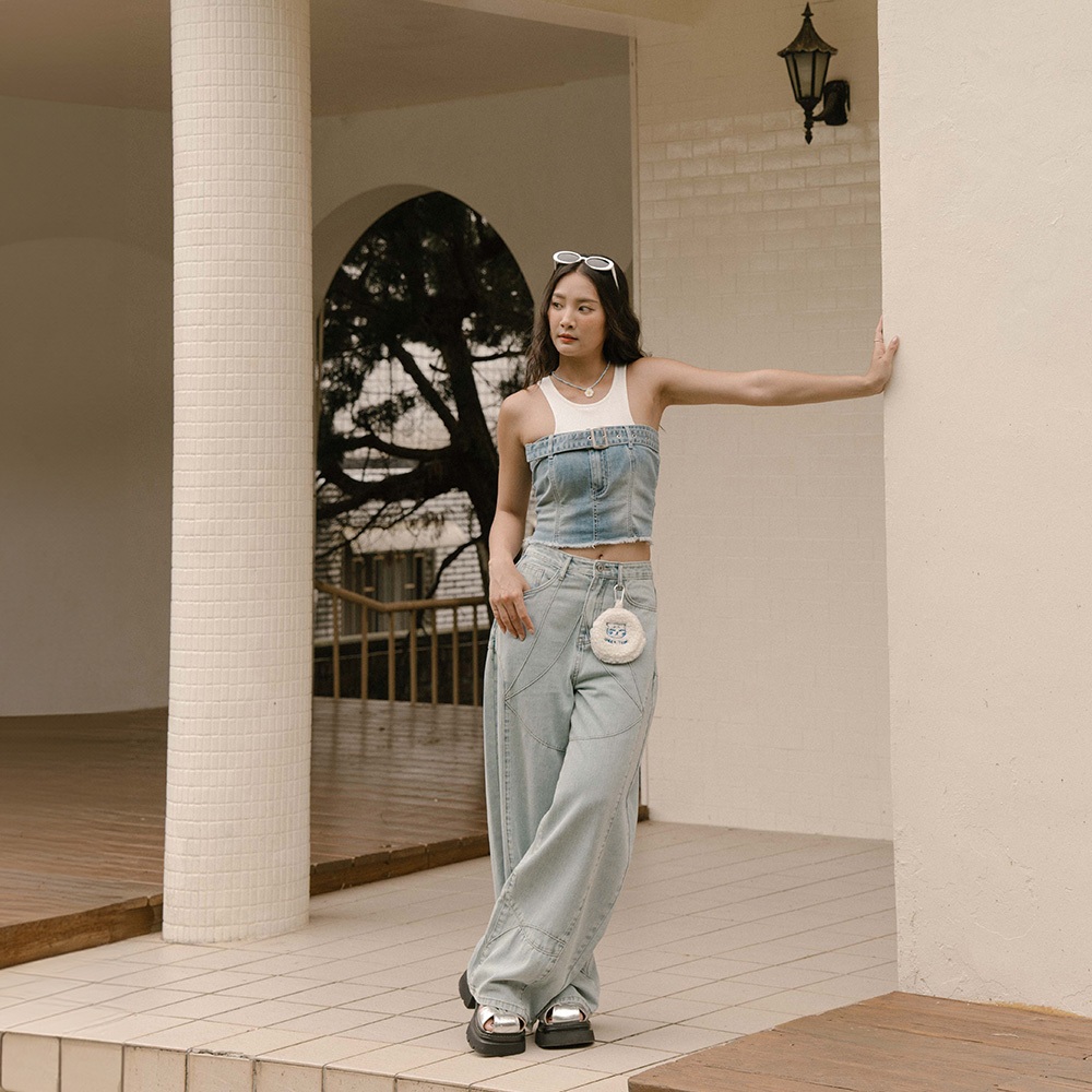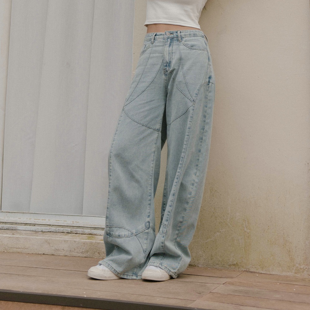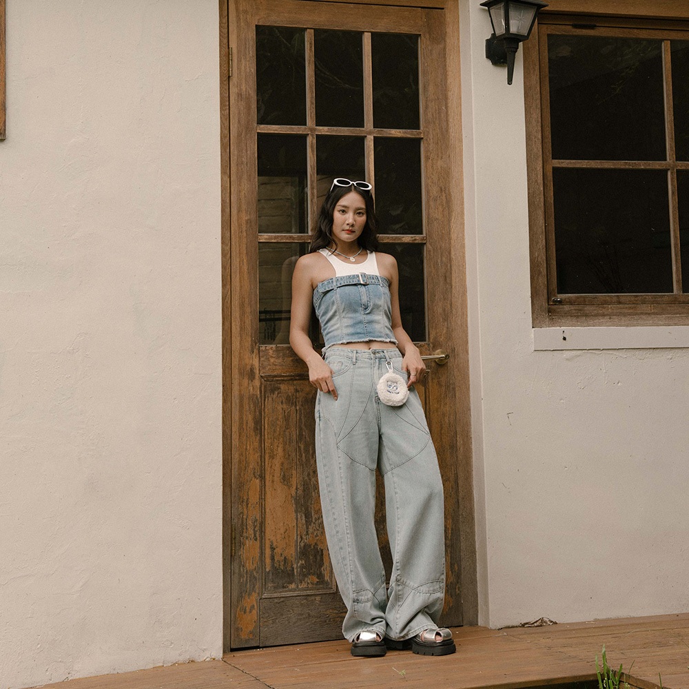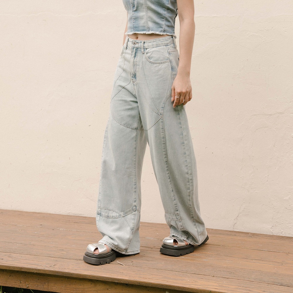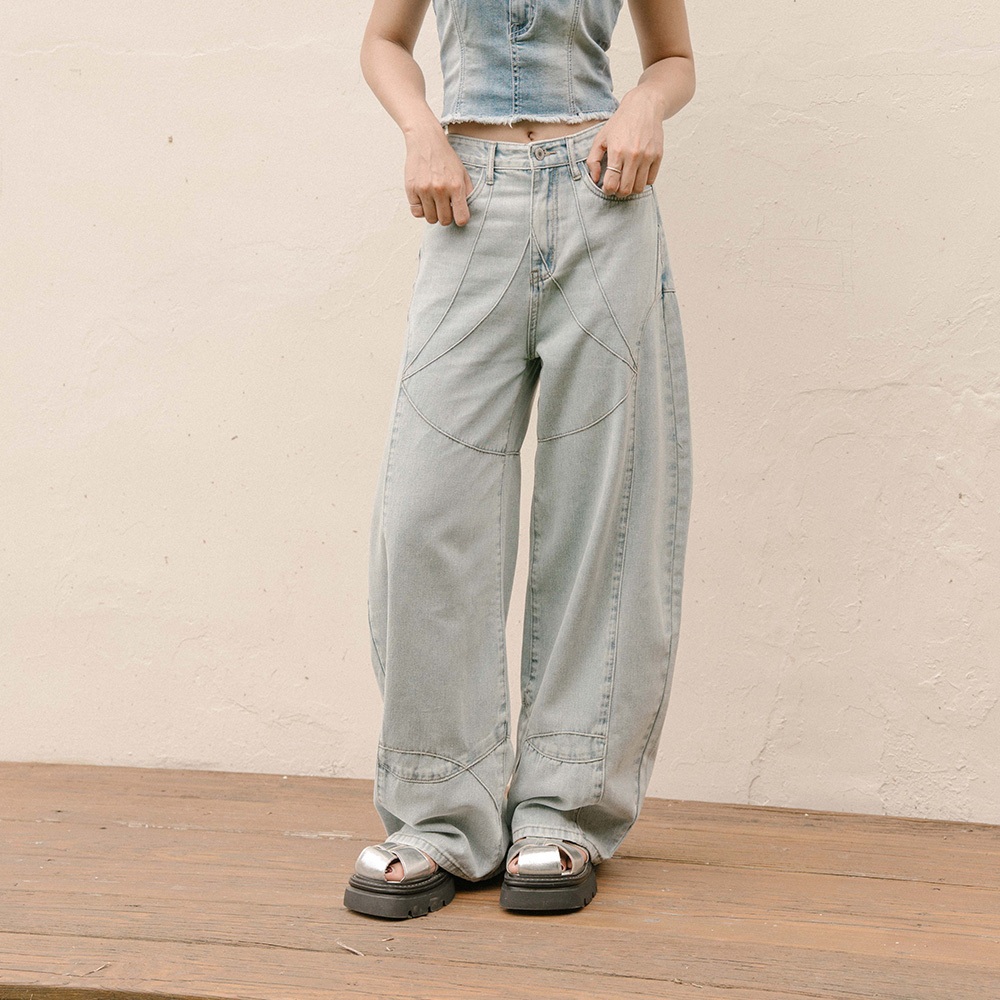 QUEENSHOP_ S 品子聯名 剪接設計繭型牛仔長褲-淺藍 S/M/L 現+預 【04011833】淺藍S|淺藍M|淺藍LQUEENSHOP