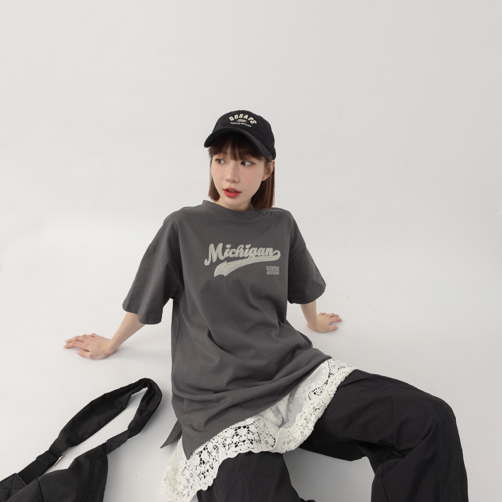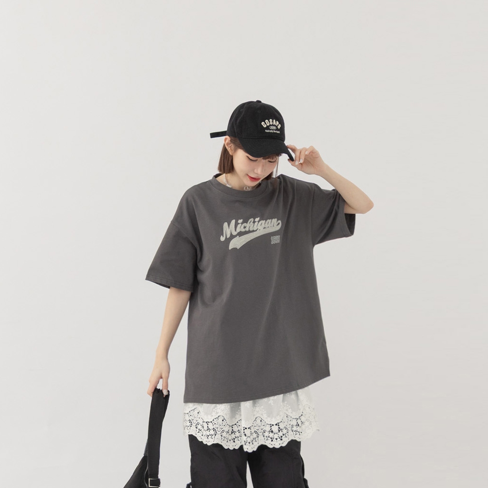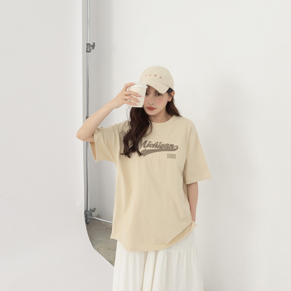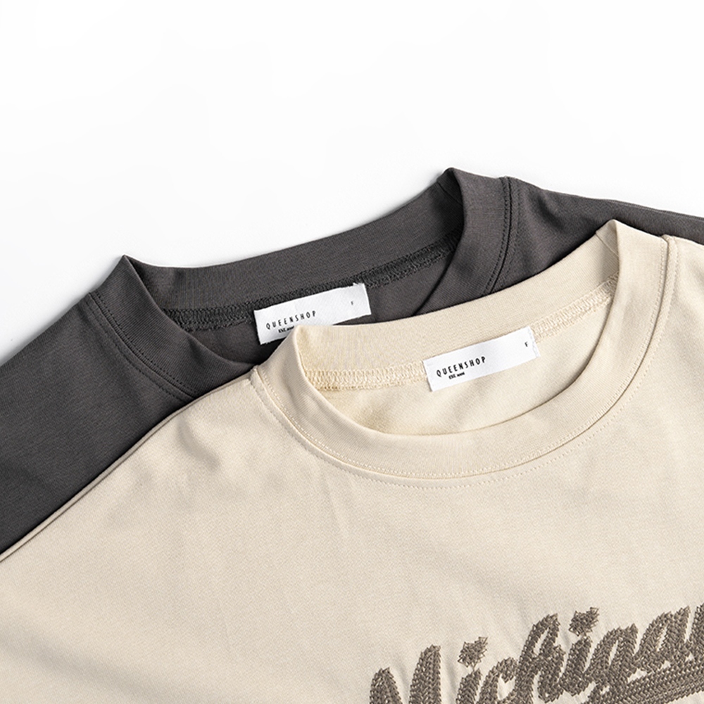 QUEENSHOP_ S 女裝 短袖 美式1855刺繡字短袖上衣 兩色售 現+預 【01190196】深灰|卡其T-shirtsQUEENSHOP