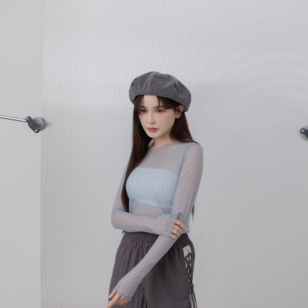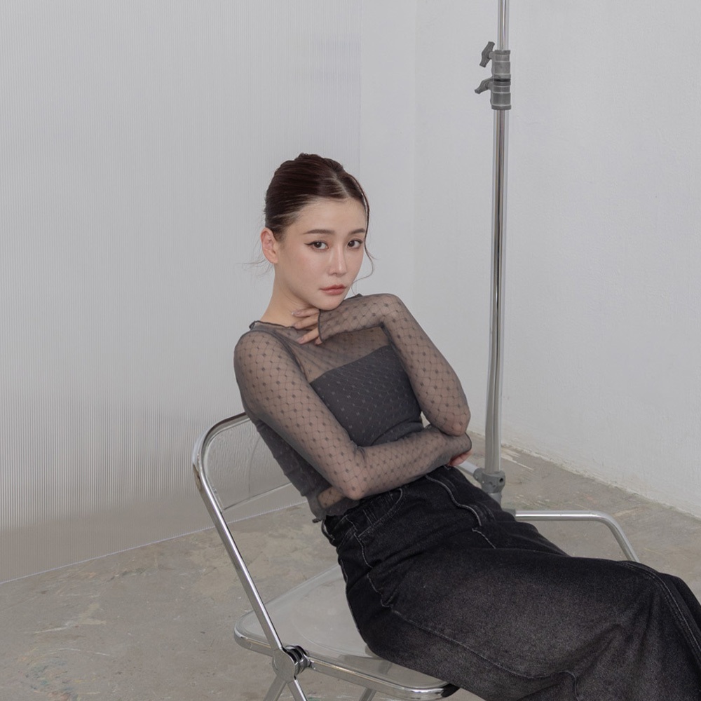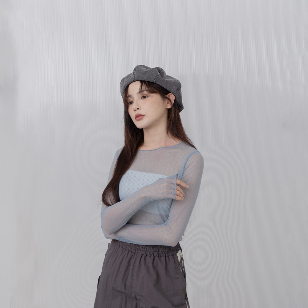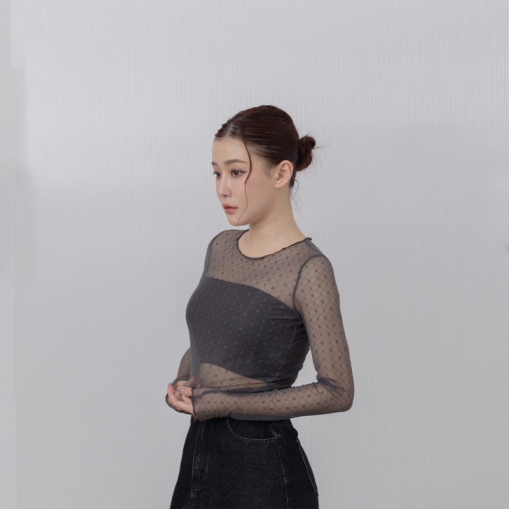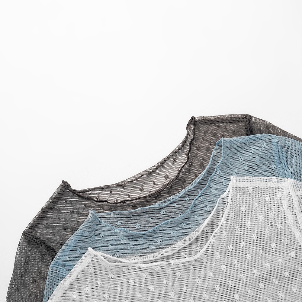 QUEENSHOP_ S 女裝 長袖 滿版緹花木耳邊透膚網紗上衣 三色售 現+預 【01099001】灰|藍|米白OthersQUEENSHOP
