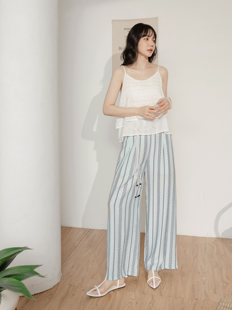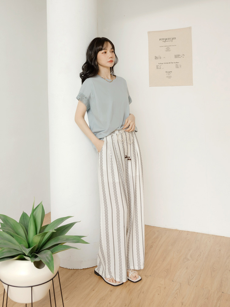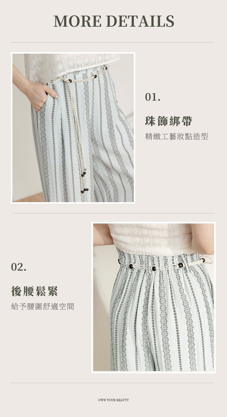 OB嚴選 棉麻感圖騰印花珠飾綁帶寬褲(附綁帶) 《BA7886》白,M|白,L|白,XL|白,2L|白,3L|淺水藍,M|淺水藍,L|淺水藍,XL|淺水藍,2L|淺水藍,3LPantsOB嚴選官方旗艦店