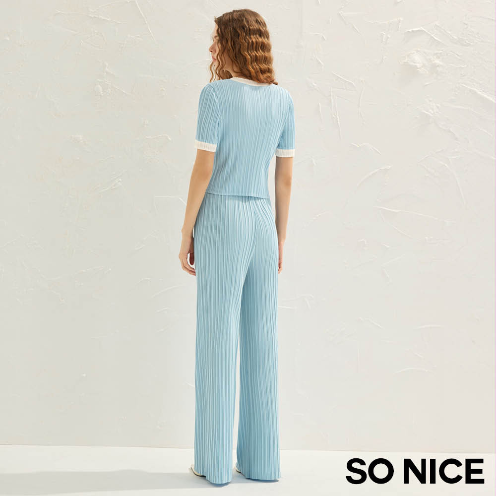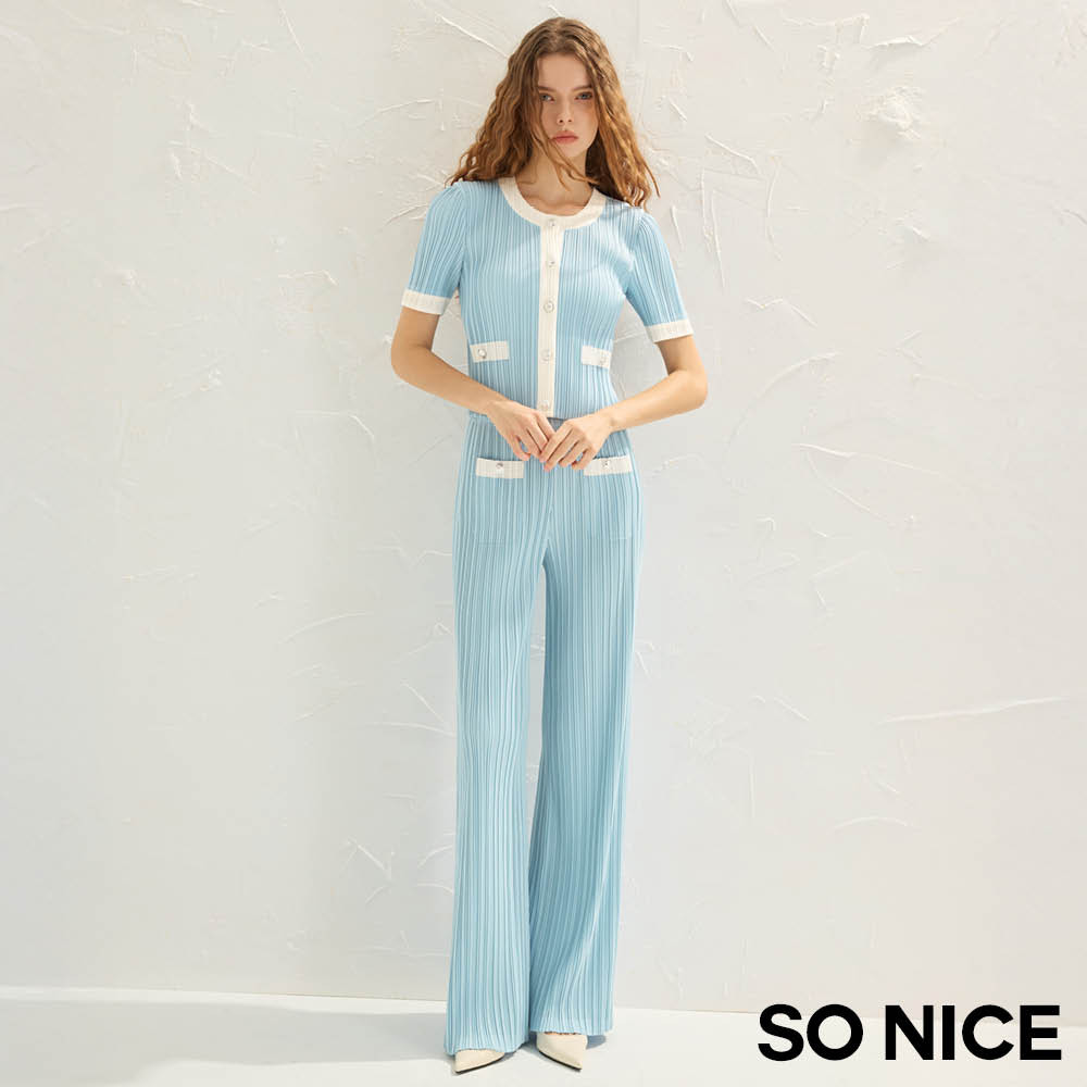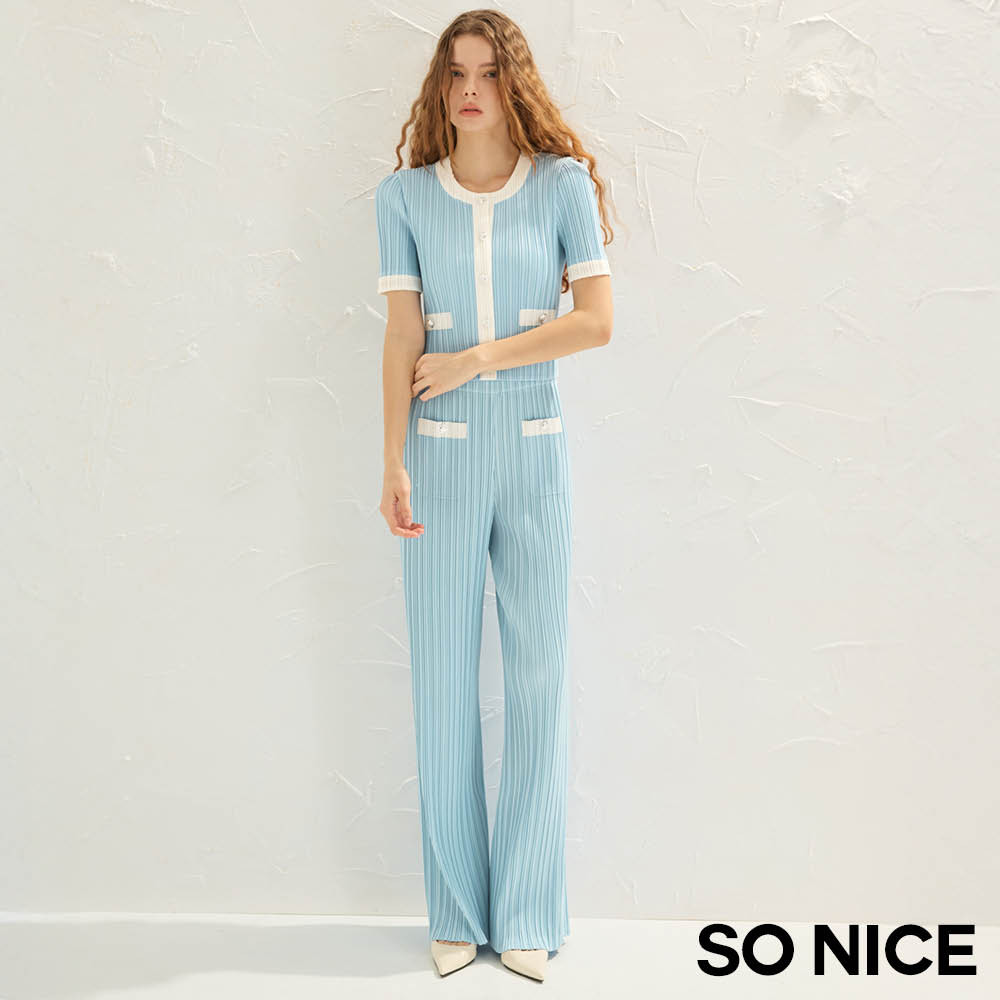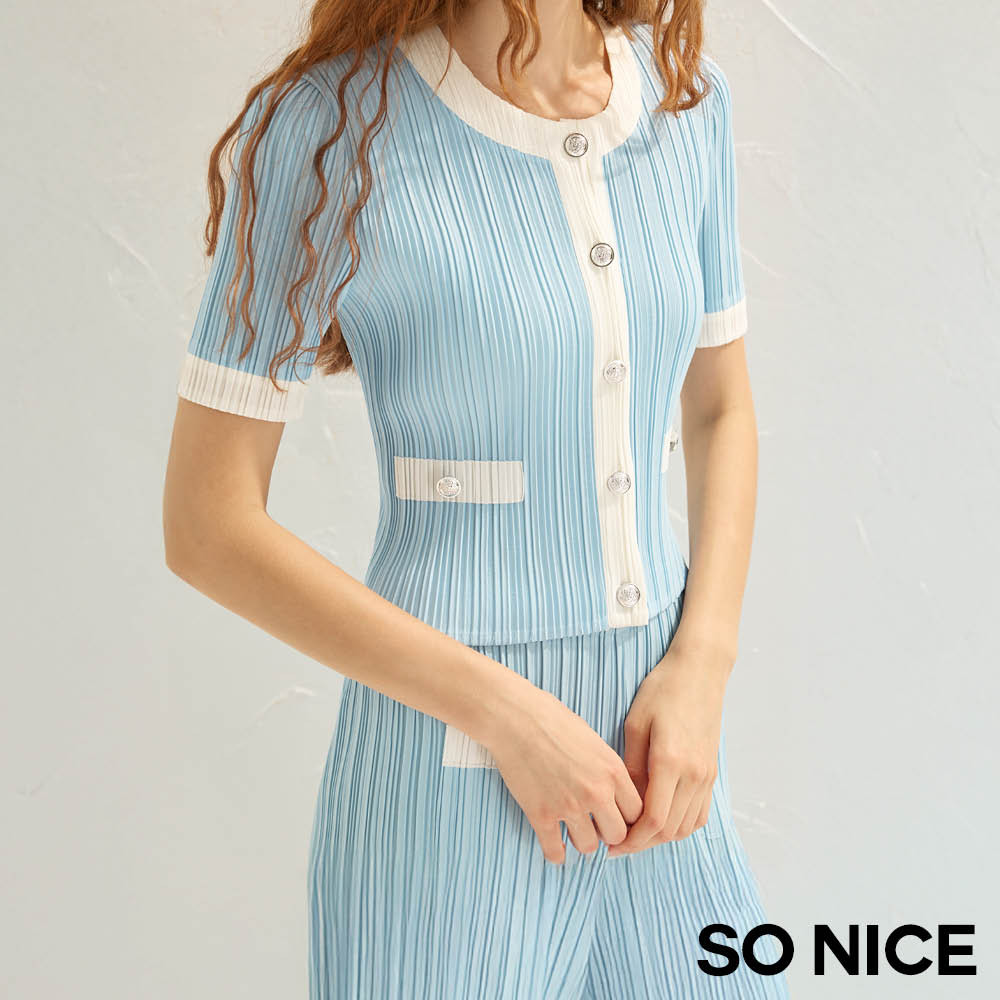 SO NICE 小香風撞色圓領彈力壓褶上衣|都會時尚女裝【45535003】淺藍,34(XS)|淺藍,36(S)|淺藍,38(M)OthersSO NICE 官方旗艦店