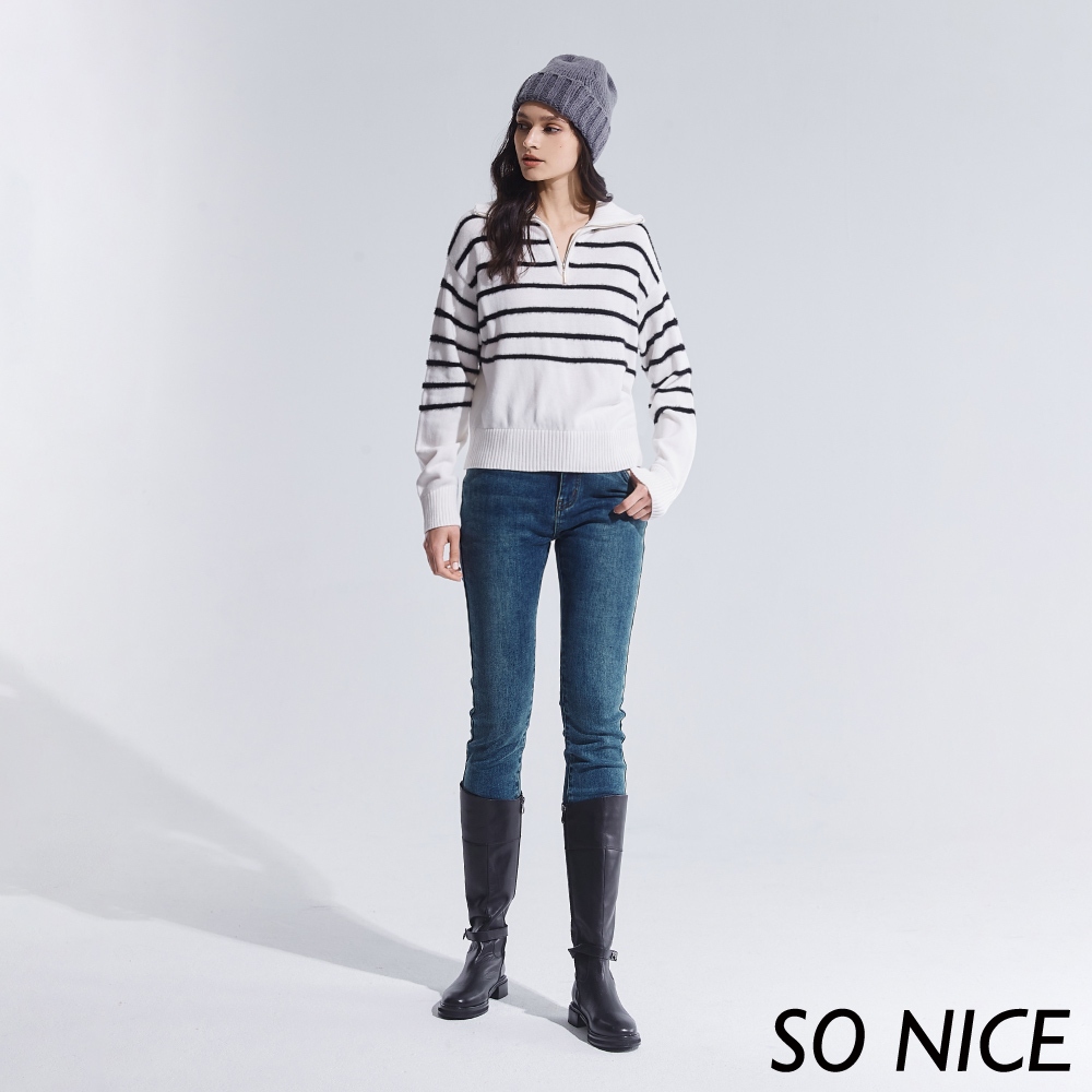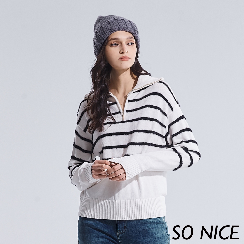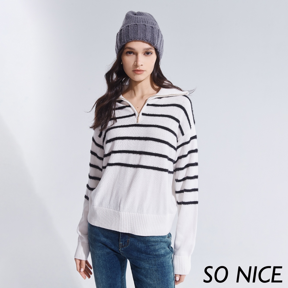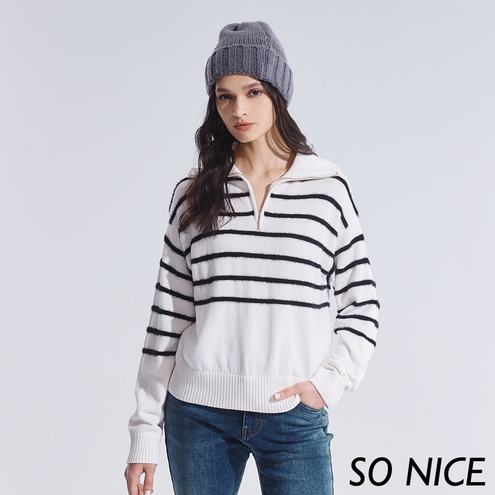 SO NICE【特惠】翻領半拉鍊條紋針織毛衣|都會時尚女裝 【58430027】