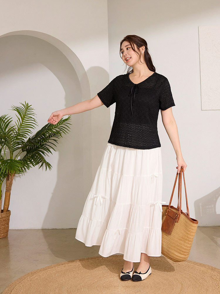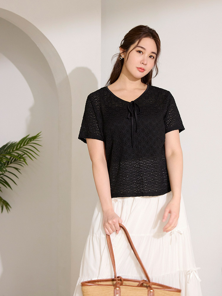 OB嚴選 雲朵自訂款-高彈立體紋理微透膚綁帶上衣 《AB20344》杏,XL|杏,2L|杏,3L|杏,4L|黑,XL|黑,2L|黑,3L|黑,4LT-shirtsOB嚴選官方旗艦店