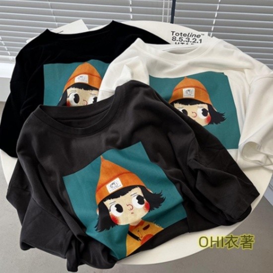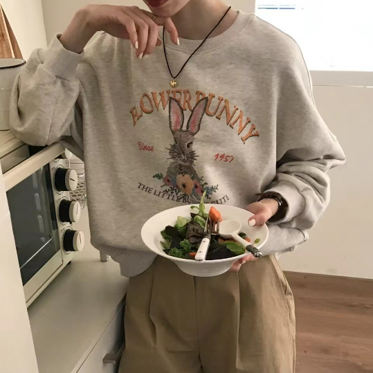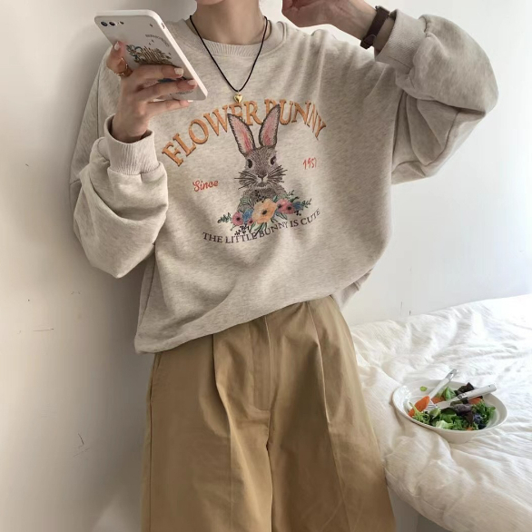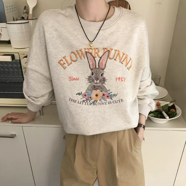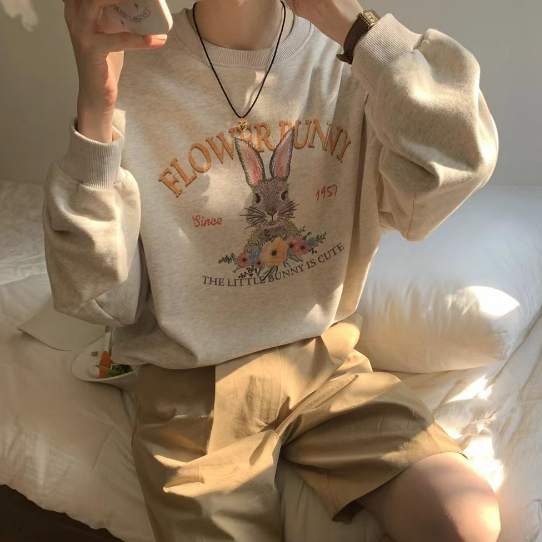 【ohi】可愛花草兔子大學T 寬鬆圓領長袖上衣 百搭毛圈棉長袖衛衣(GTD232)杏灰色,M|杏灰色,L|杏灰色,XL|杏灰色,2XLSweatshirtsOHI衣著