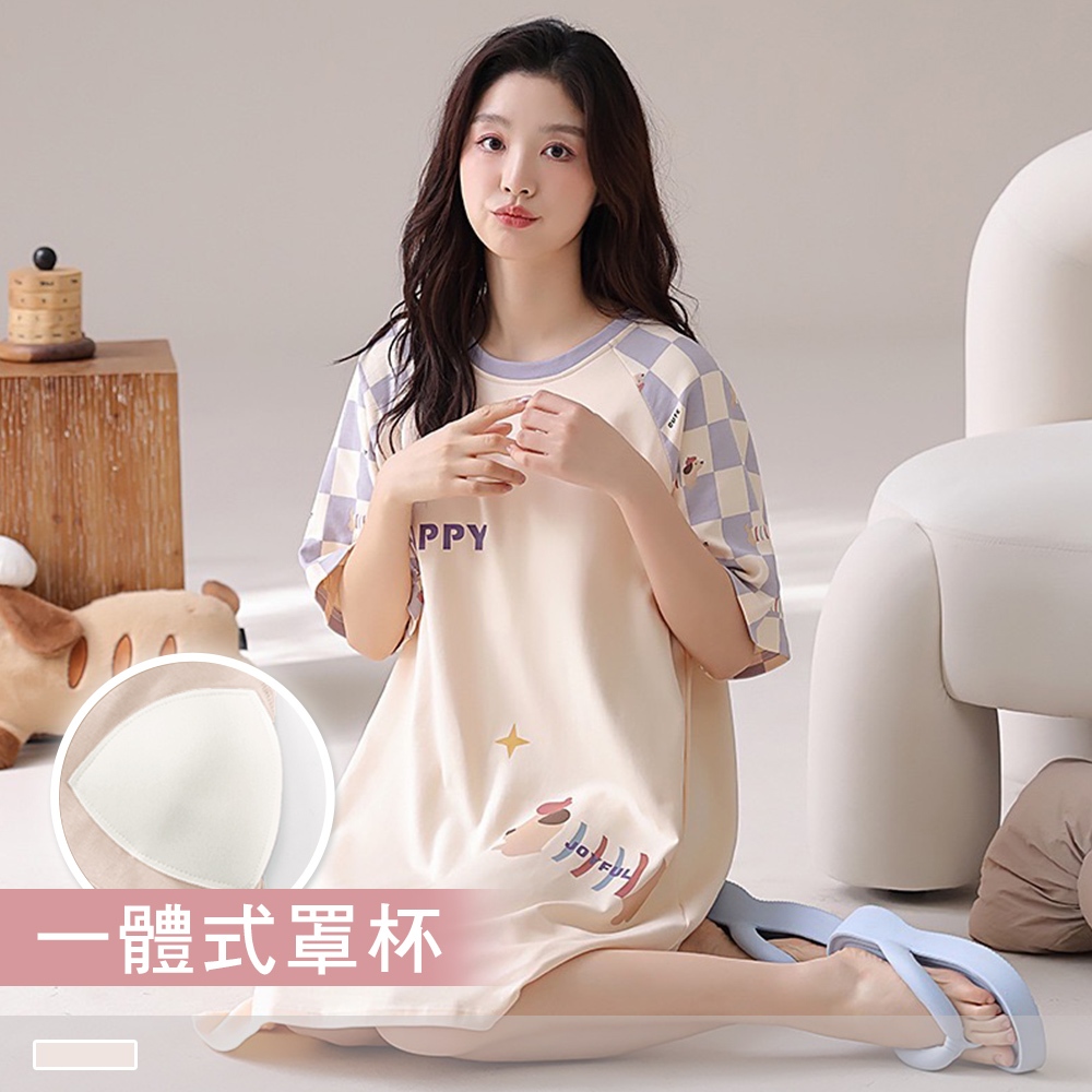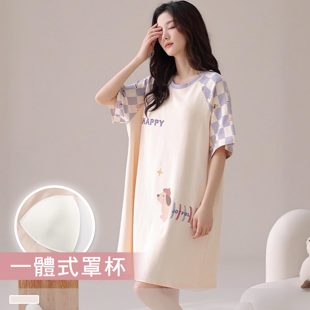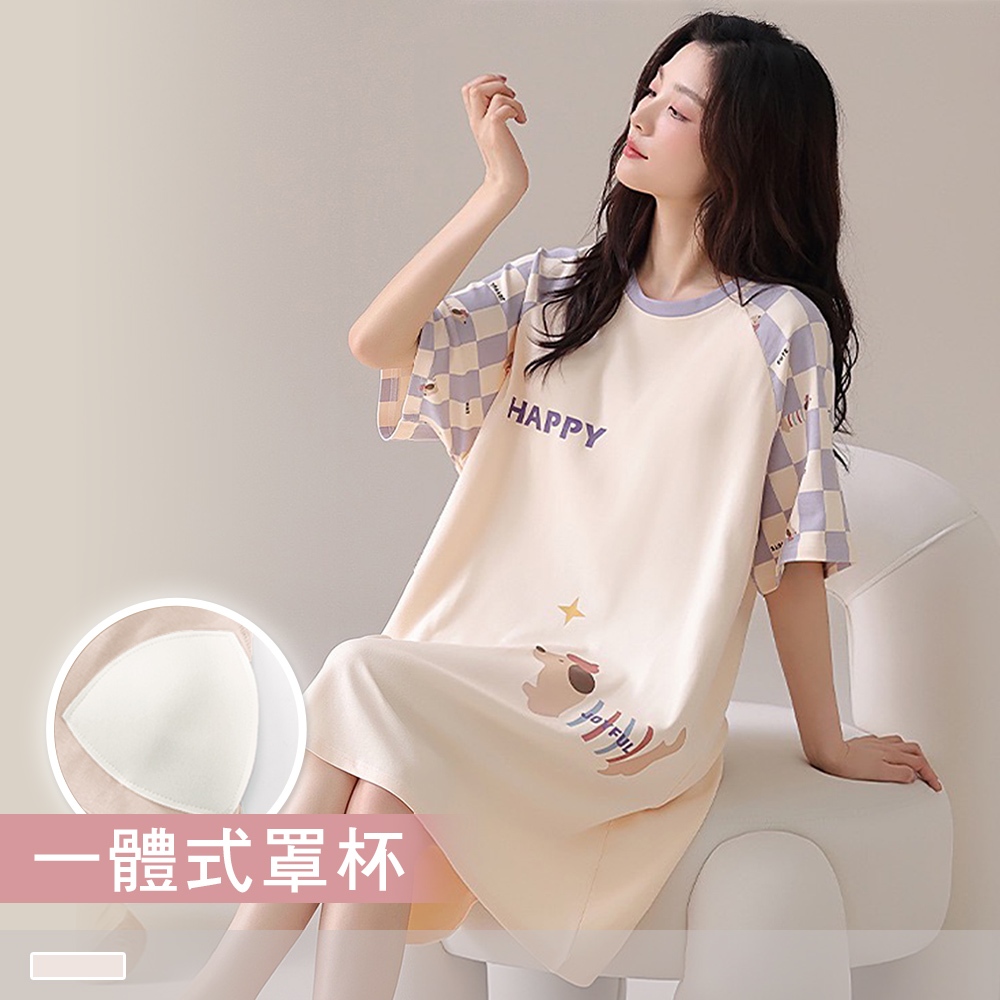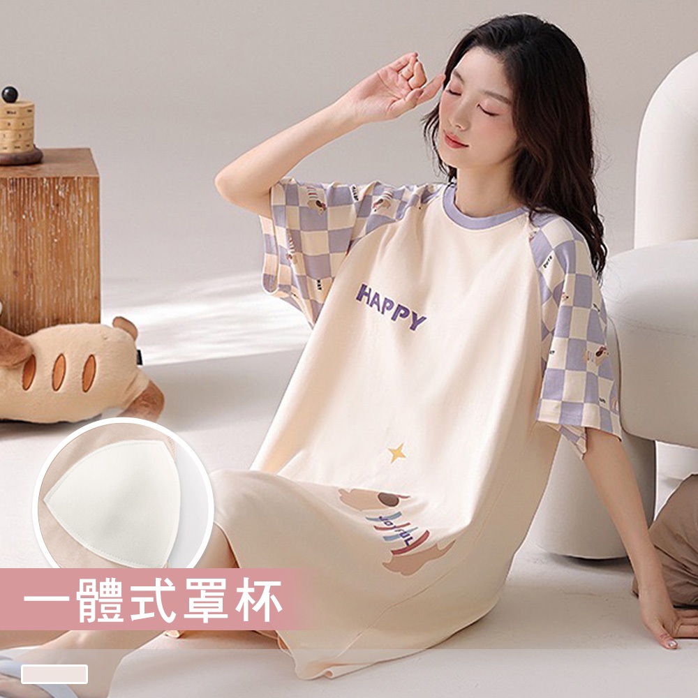 Pink Lady 純棉 罩杯式 紫格小狗 短袖睡裙 棉柔 春夏 圓領 印花 柔感 女睡衣 居家服 28130米黃,M-L|米黃,XLNight DressesPINK LADY內睡衣.Since 1995