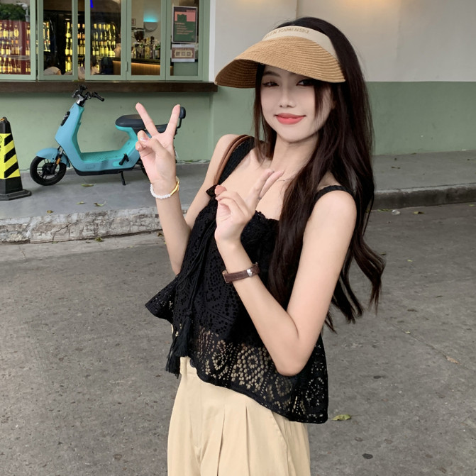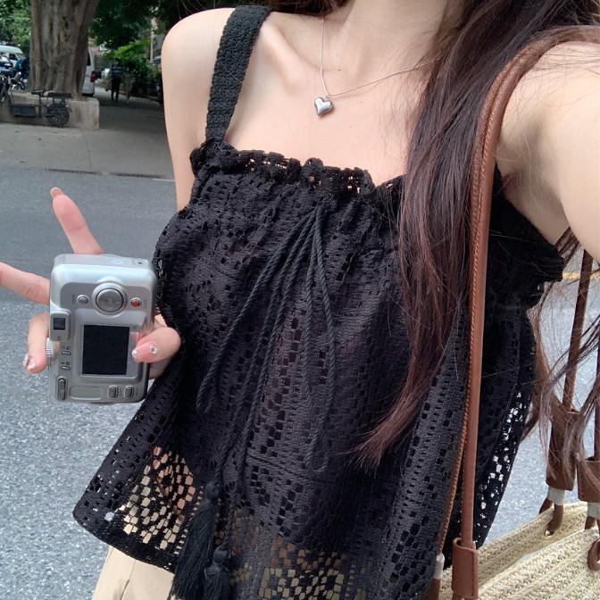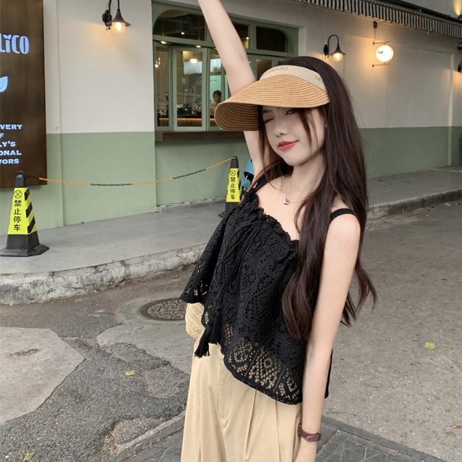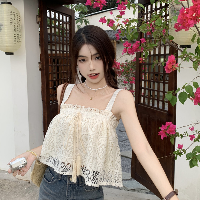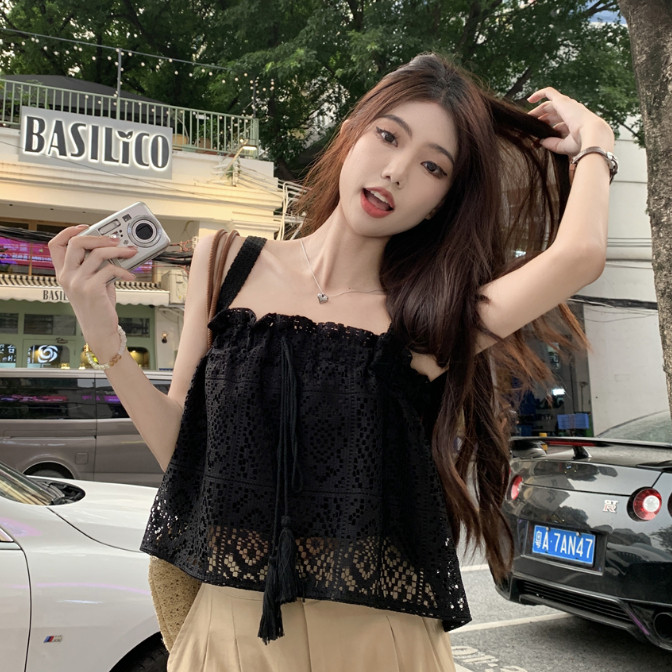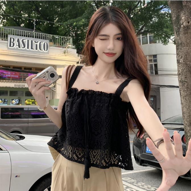 【ohi】甜辣純欲 縷空鈎花木耳邊蕾絲吊帶背心 平口寬鬆高級感 短款上衣 夏天衣服 女裝 GWH6491黑色,均碼-65KG以內都可穿|白色,均碼-65KG以內都可穿Tube TopsOHI衣著
