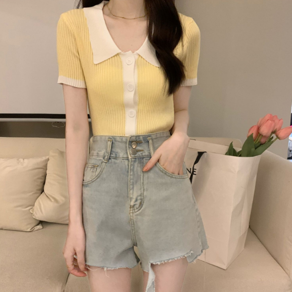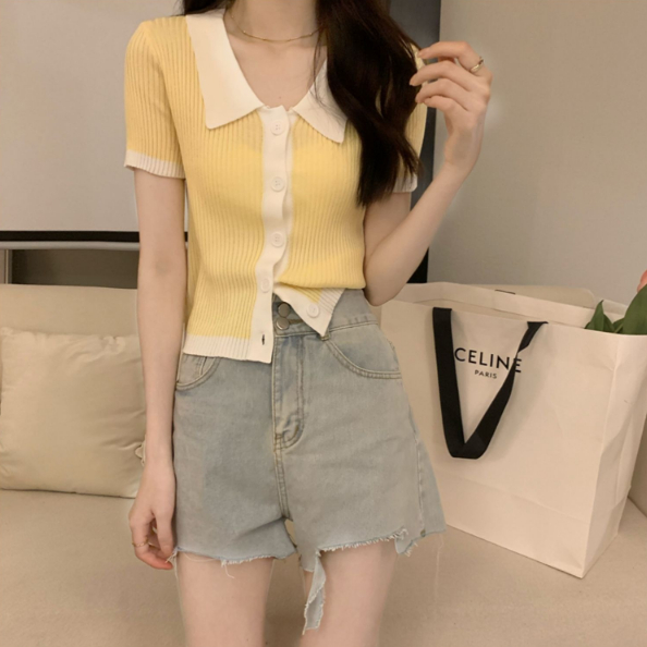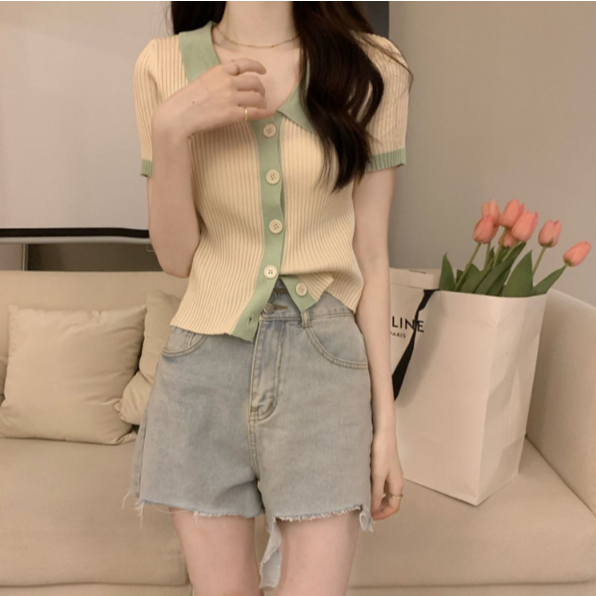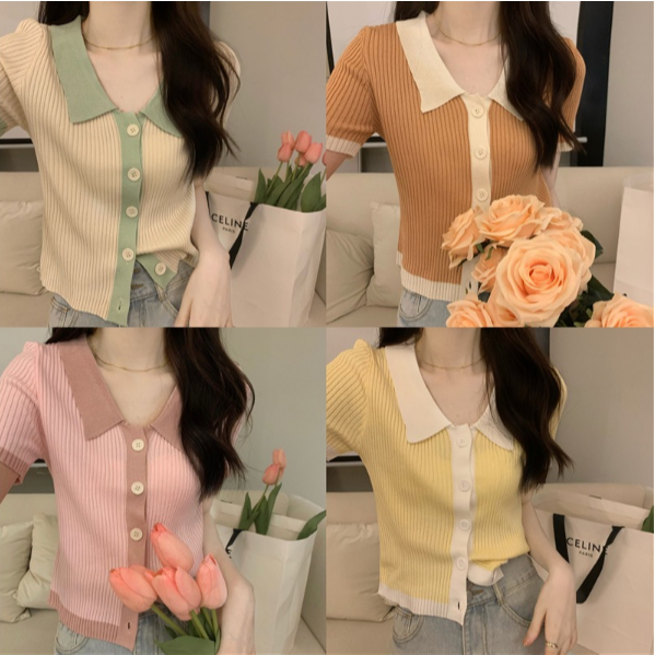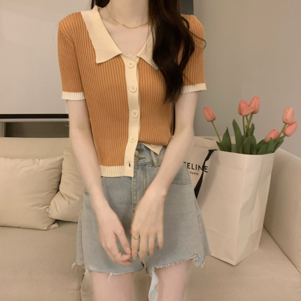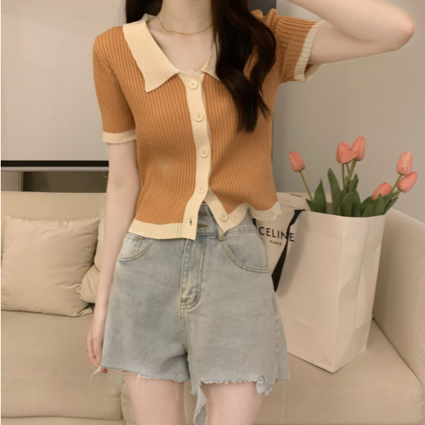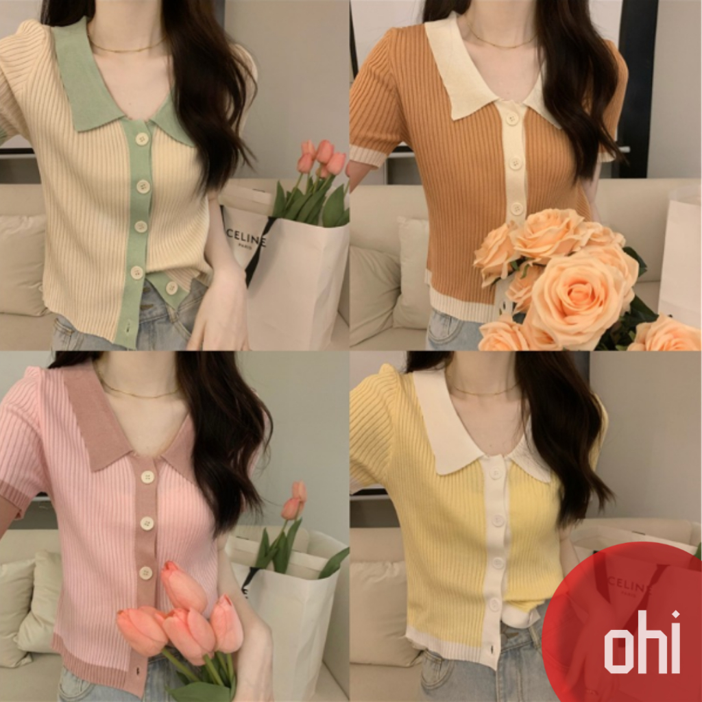 【ohi】POIO領冰絲針織短袖 短款上衣 撞色V領 正肩短袖 針織上衣T恤 夏天衣服 女裝 GWH6444粉色,均碼-65KG以內都可穿|桔色,均碼-65KG以內都可穿|杏色,均碼-65KG以內都可穿|黃色,均碼-65KG以內都可穿OHI衣著