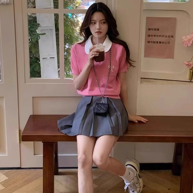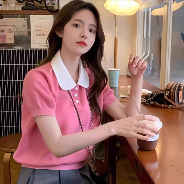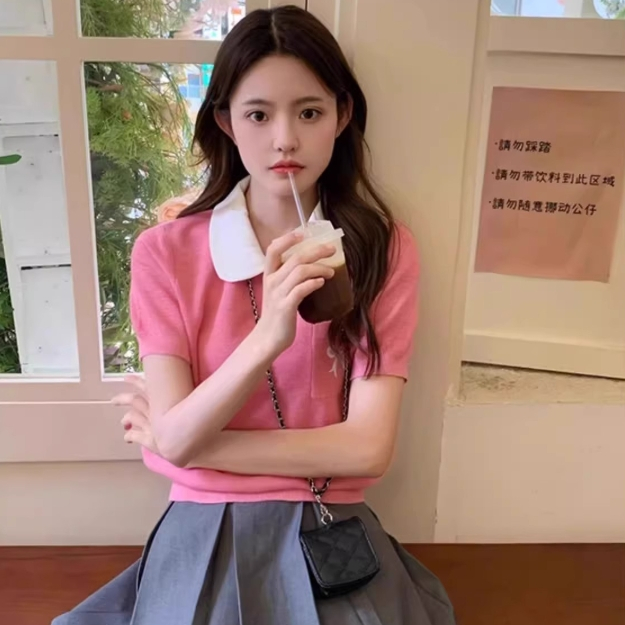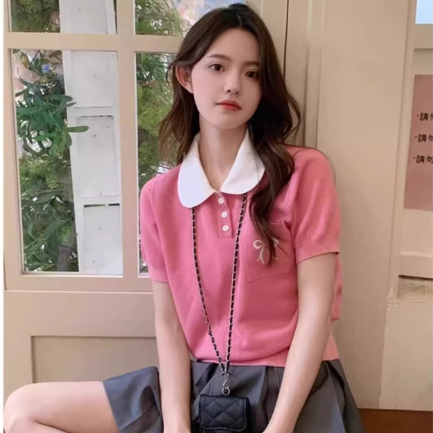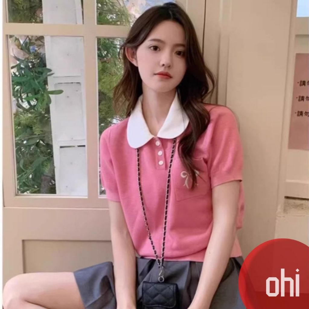 【ohi】法式娃娃領正肩短袖 針織冰絲T恤 女生上衣 針織上衣 女裝 顯瘦上衣 韓版上衣 GWD6716紅色,F碼(40-65KG可穿)OHI衣著