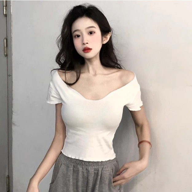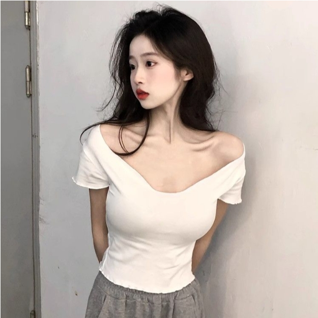【ohi】純欲風露肩打底衫 修身顯瘦小心機短袖T恤 女生上衣 針織上衣 女裝 顯瘦上衣 韓版上衣 GWHD85黑色,F碼(均碼40-55KG可穿)|白色,F碼(均碼40-55KG可穿)OthersOHI衣著