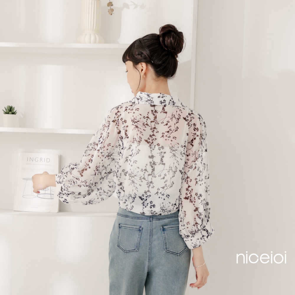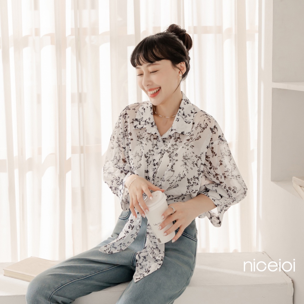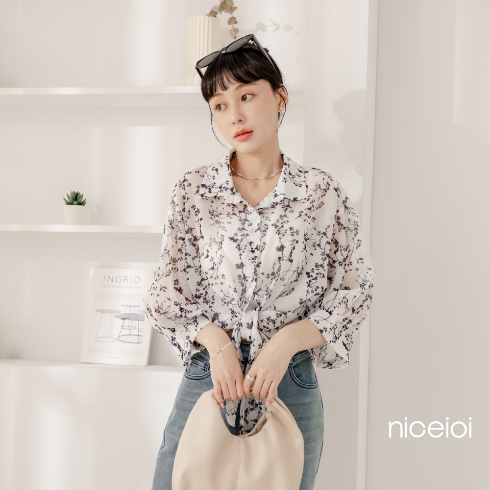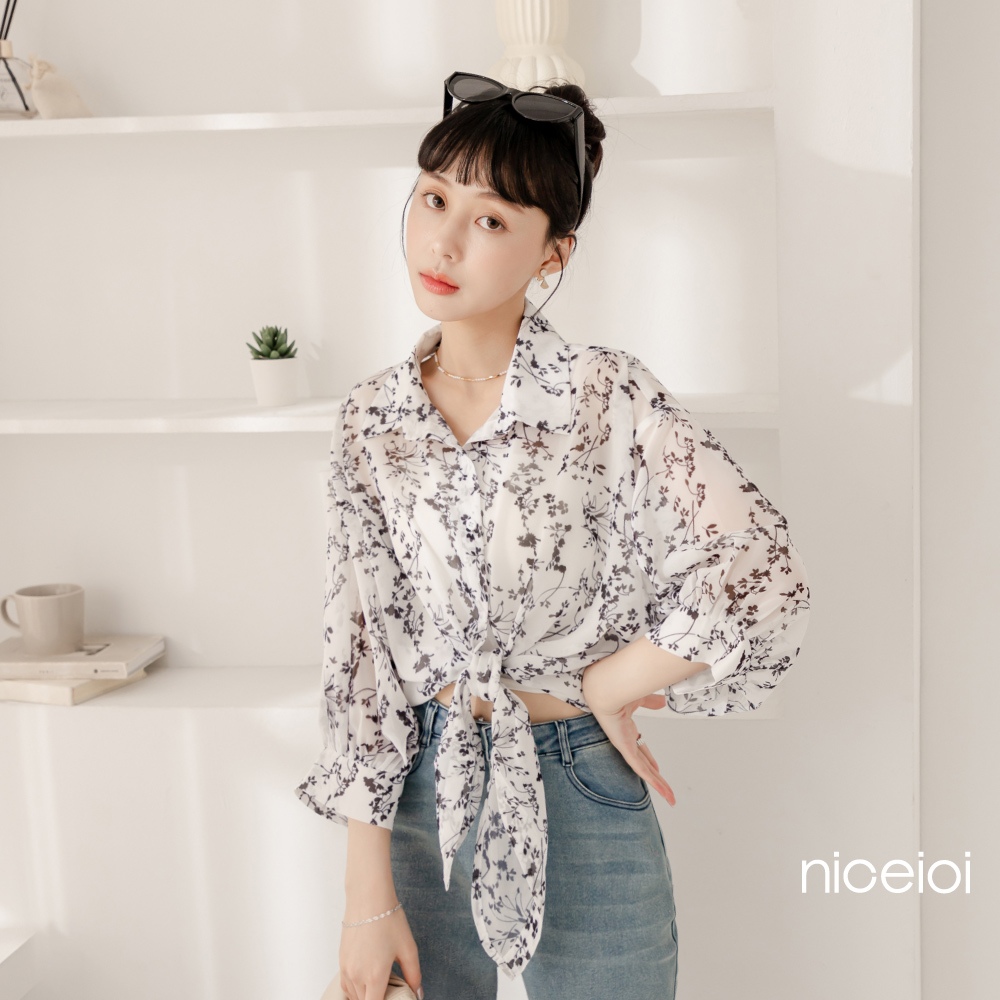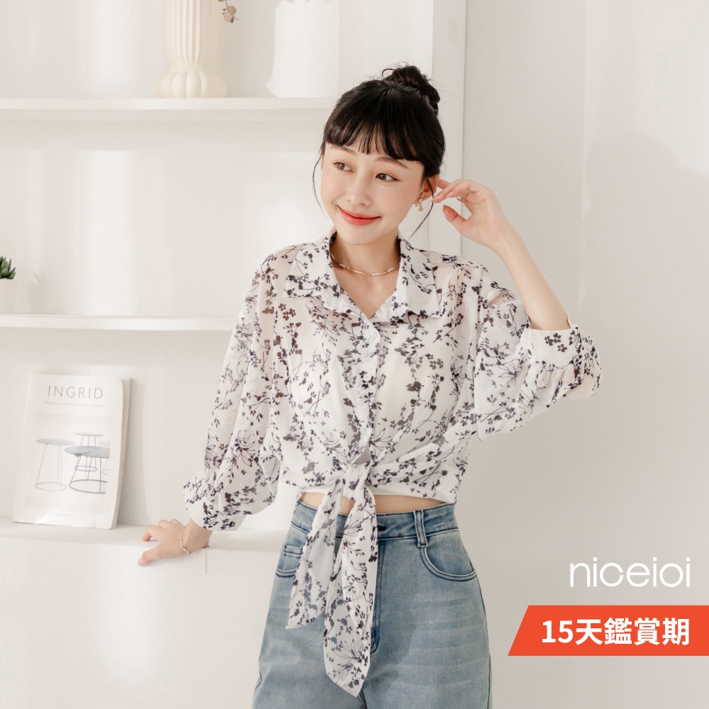 niceioi【特惠】韓系碎花綁帶雪紡襯衫 女裝