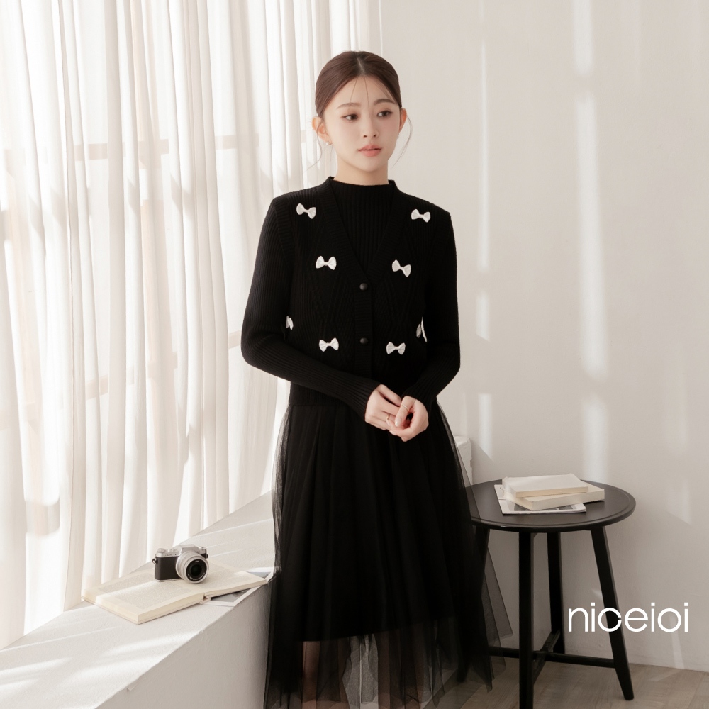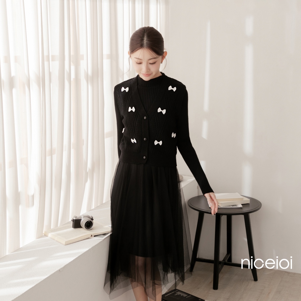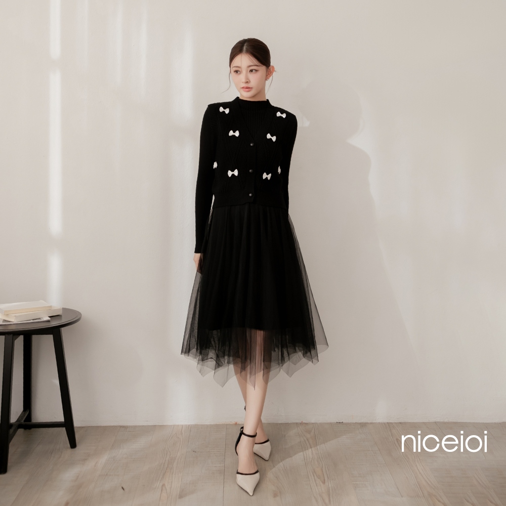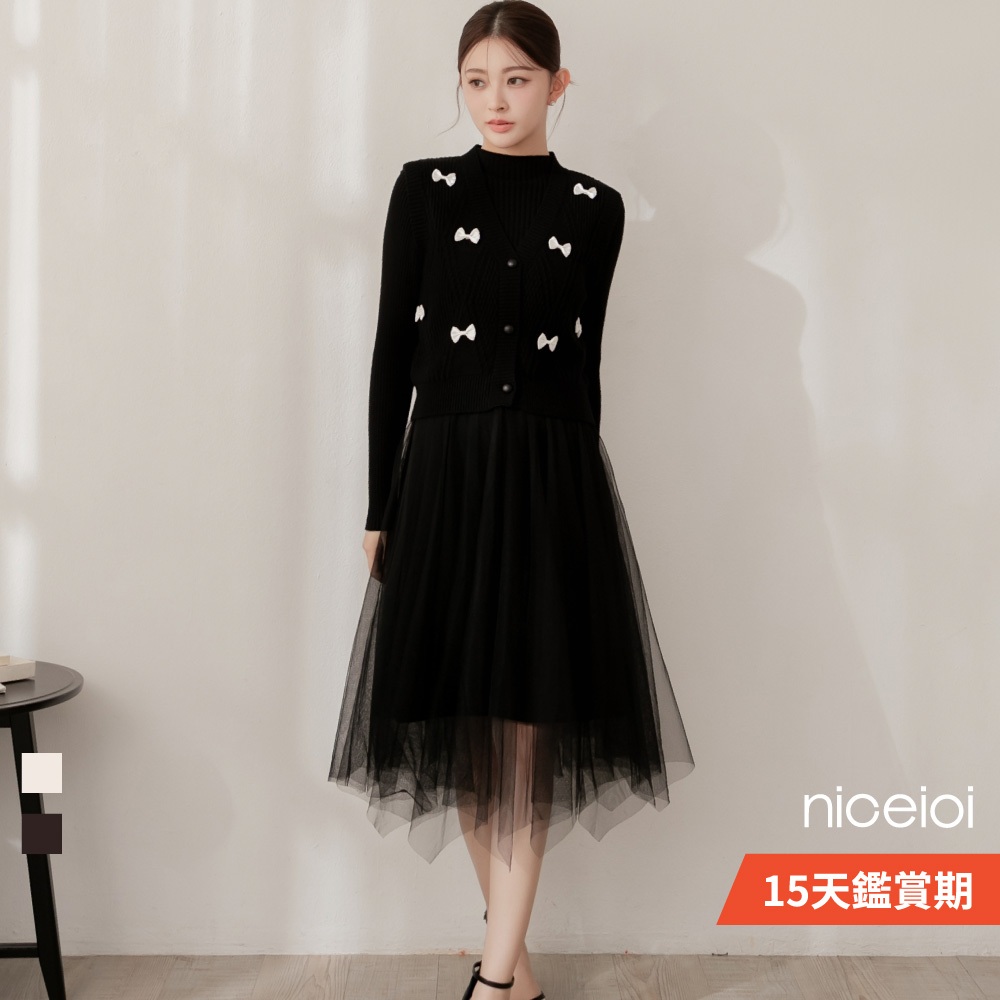 niceioi【特惠】兩件式洋裝 長洋 針織洋裝 [婚禮蝴蝶結兩件式針織紗裙長洋裝] 女裝米,F|黑,Fniceioi 官方旗艦店